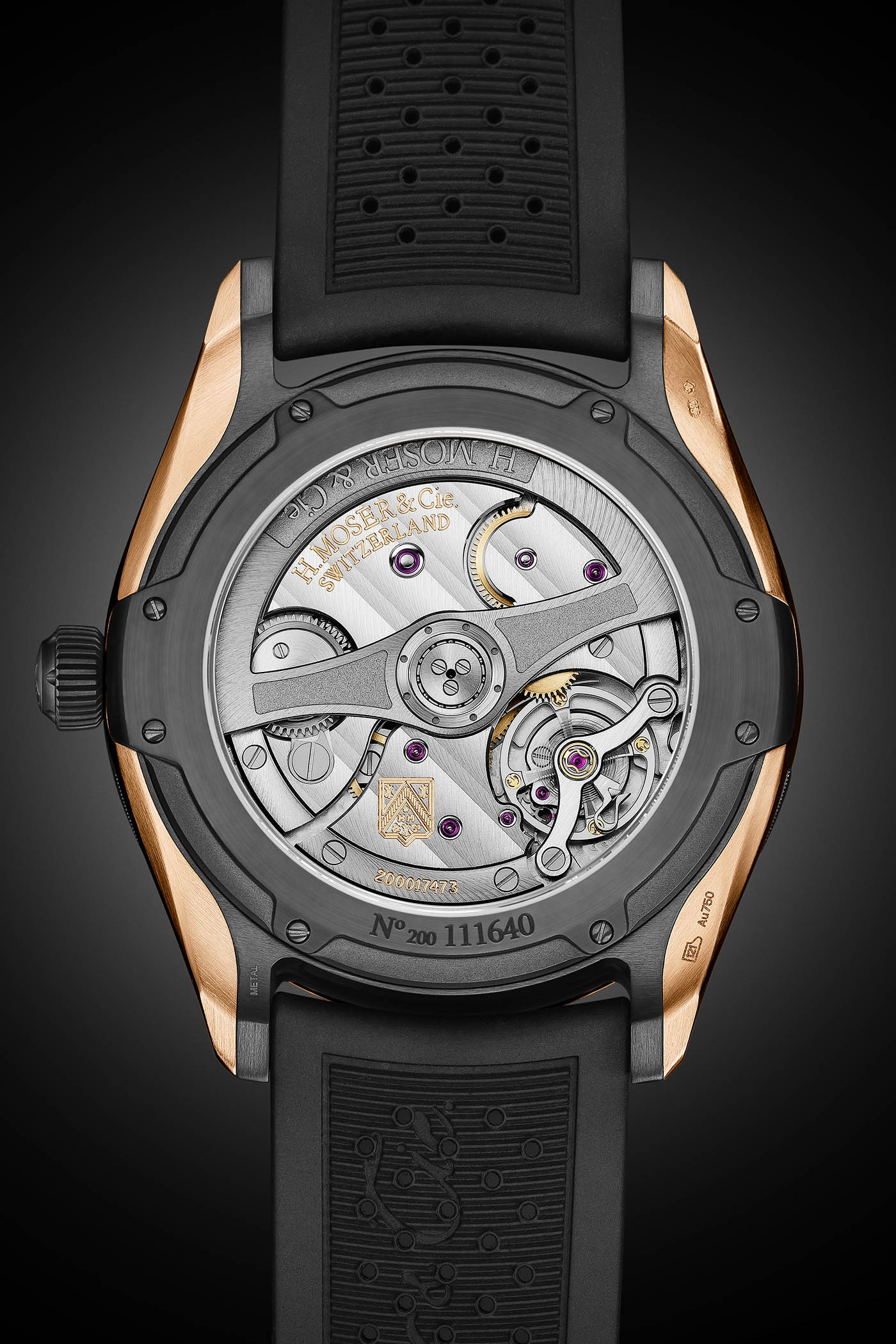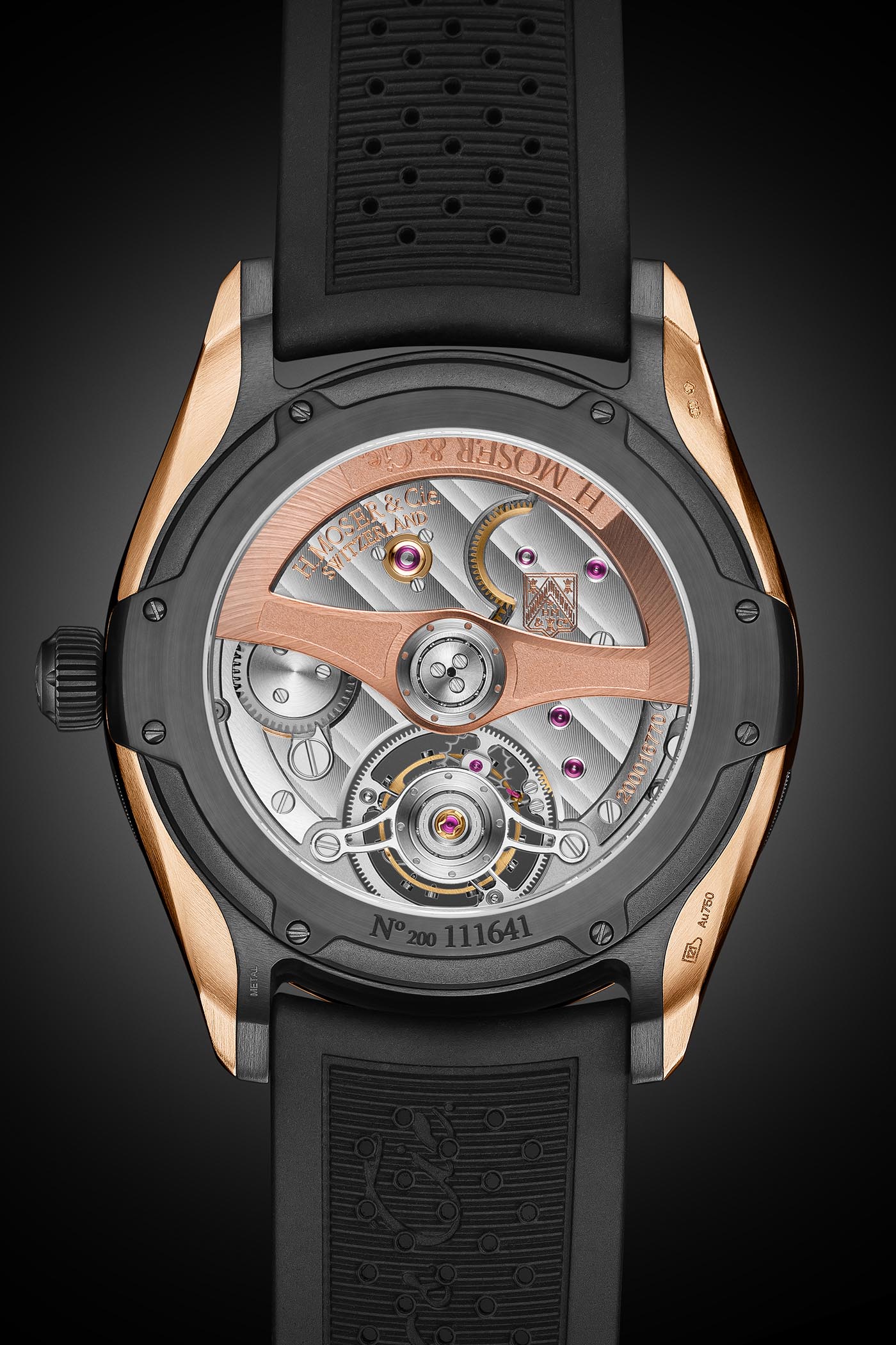 Available in the automatic and in the tourbillon, these new versions feature a new case. It is made from a combination of 5N red gold and black DLC-finished titanium – the central part of the case is titanium and the two lateral parts and the bezel are made of gold (a combination that can be appreciated when looking at the lugs and the caseback). The case is still water-resistant to 120m and these models are worn on perforated black rubber straps with a 5N red gold pin buckle (Center Seconds) or a folding clasp (Tourbillon). The crown is also DLC coated. Both watches have a rather large 42.8mm diameter, which remains comfortable thanks to short lugs.