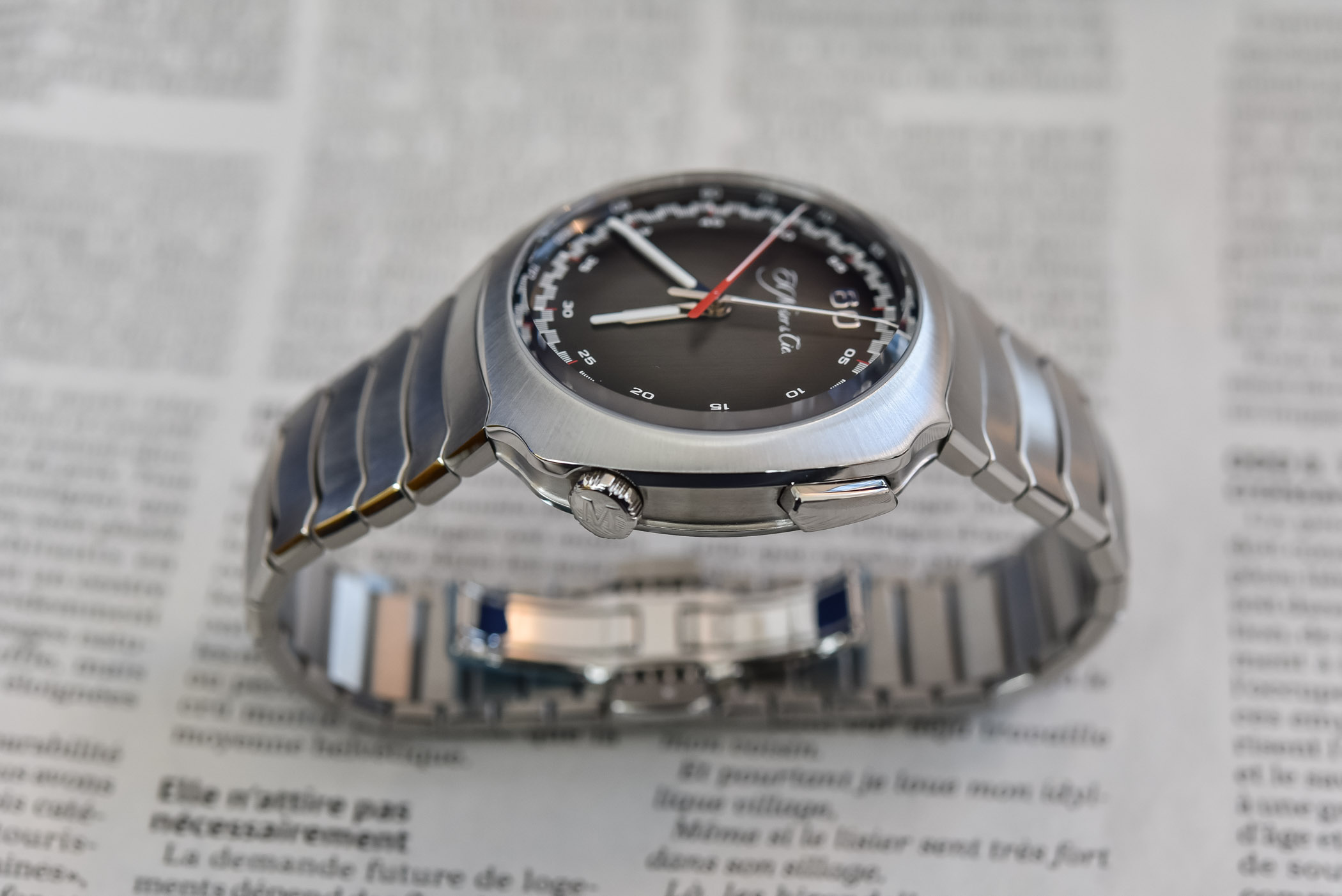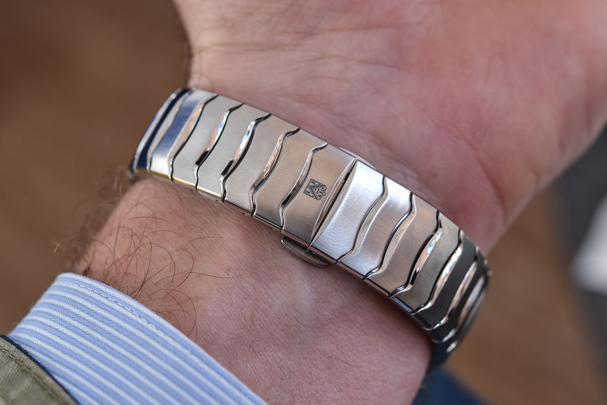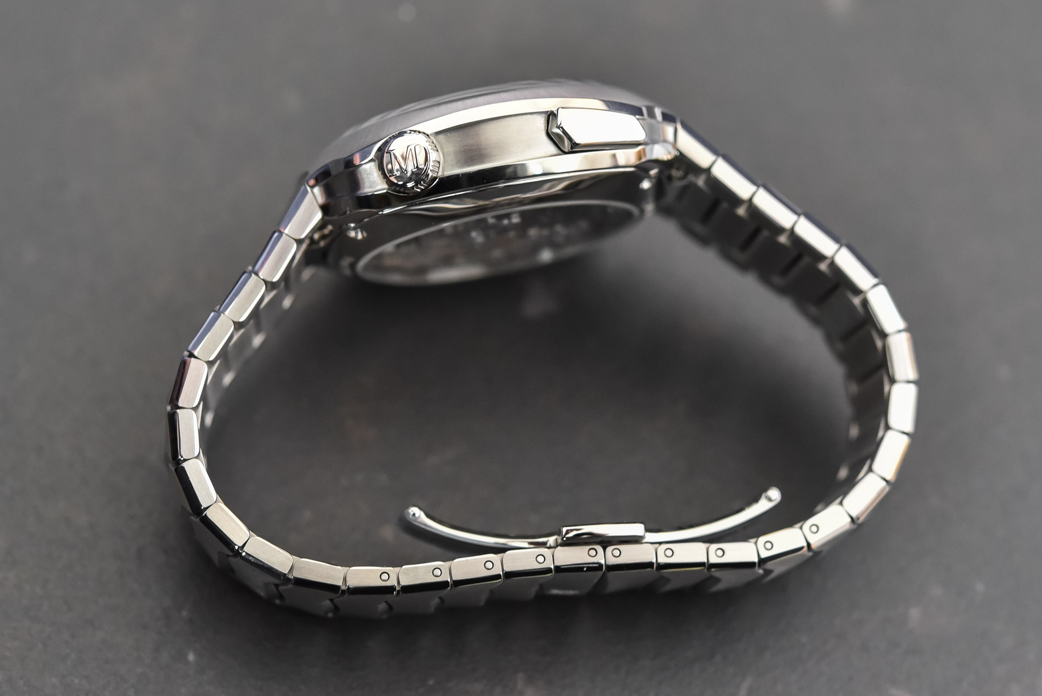 The bracelet was actually the starting point of the design. Featuring fluid lines, it is based on parallel articulated links featuring a gentle wave combining a vertical brushed finish with polished surfaces. The finishing of the bracelet is rather impressive, with the straight brushed flat surfaces enlightened by multiple polished bevels, in between each link and on the sides. The short links allow for the desired flexibility, ensuring that this watch sits comfortably on the wrist. The 3-blade folding clasp is released via two pushers.