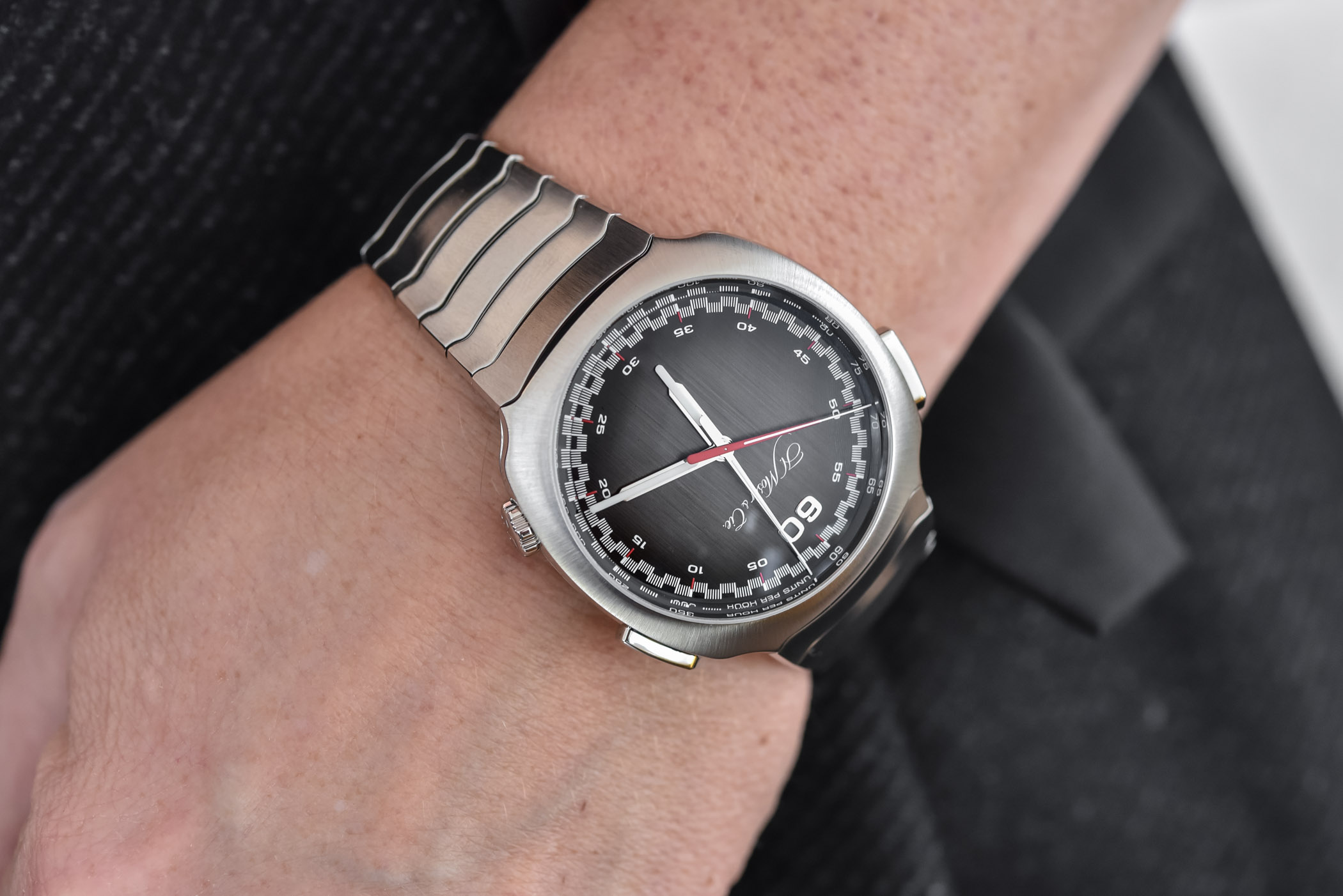 The dial is not only fumé, in the characteristic Moser style, but it is also “griffé” (deeply vertically brushed). At its periphery, two white and red scales keep track of the elapsed minutes and seconds. The same minimalist approach can be said about the indexes and markers. The look, emphasized by the large applied 60 numeral and the lack of hour indexes, has a 1970s vibe and racing credentials.