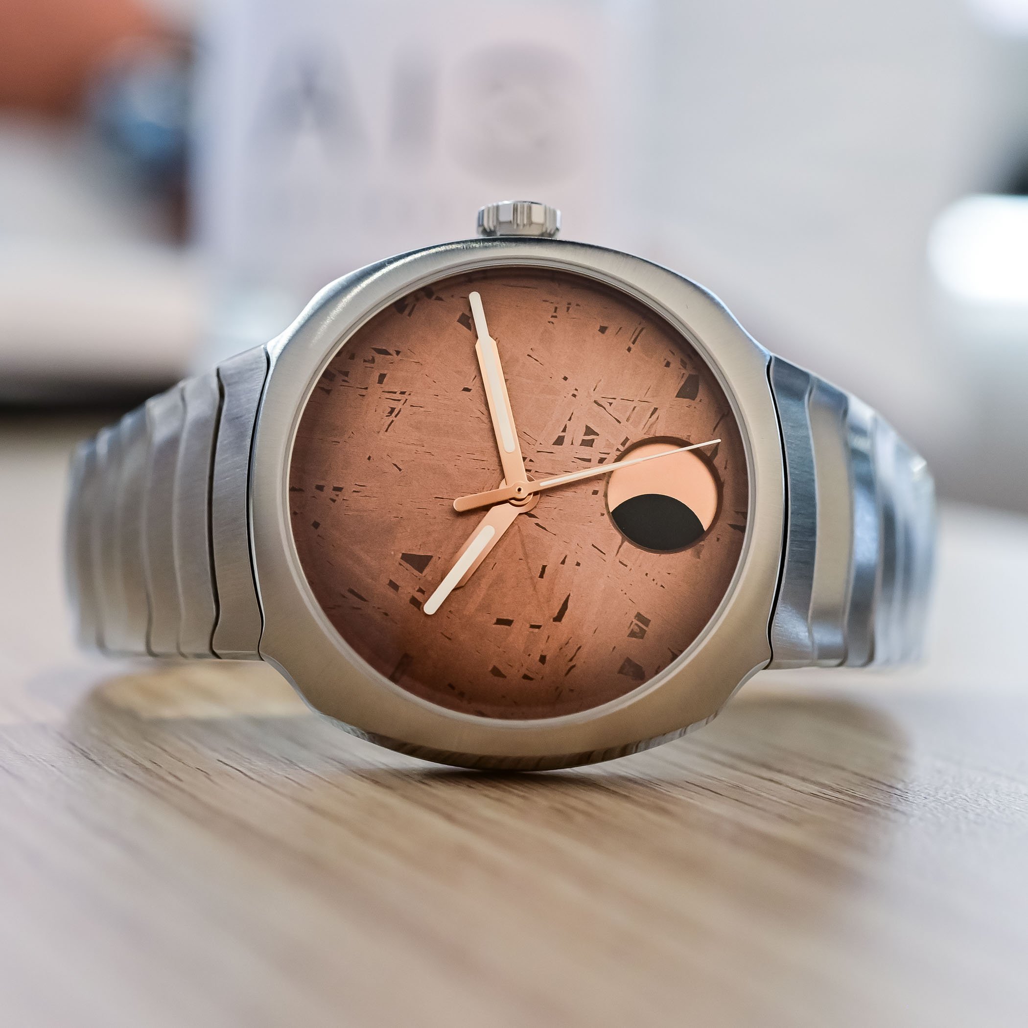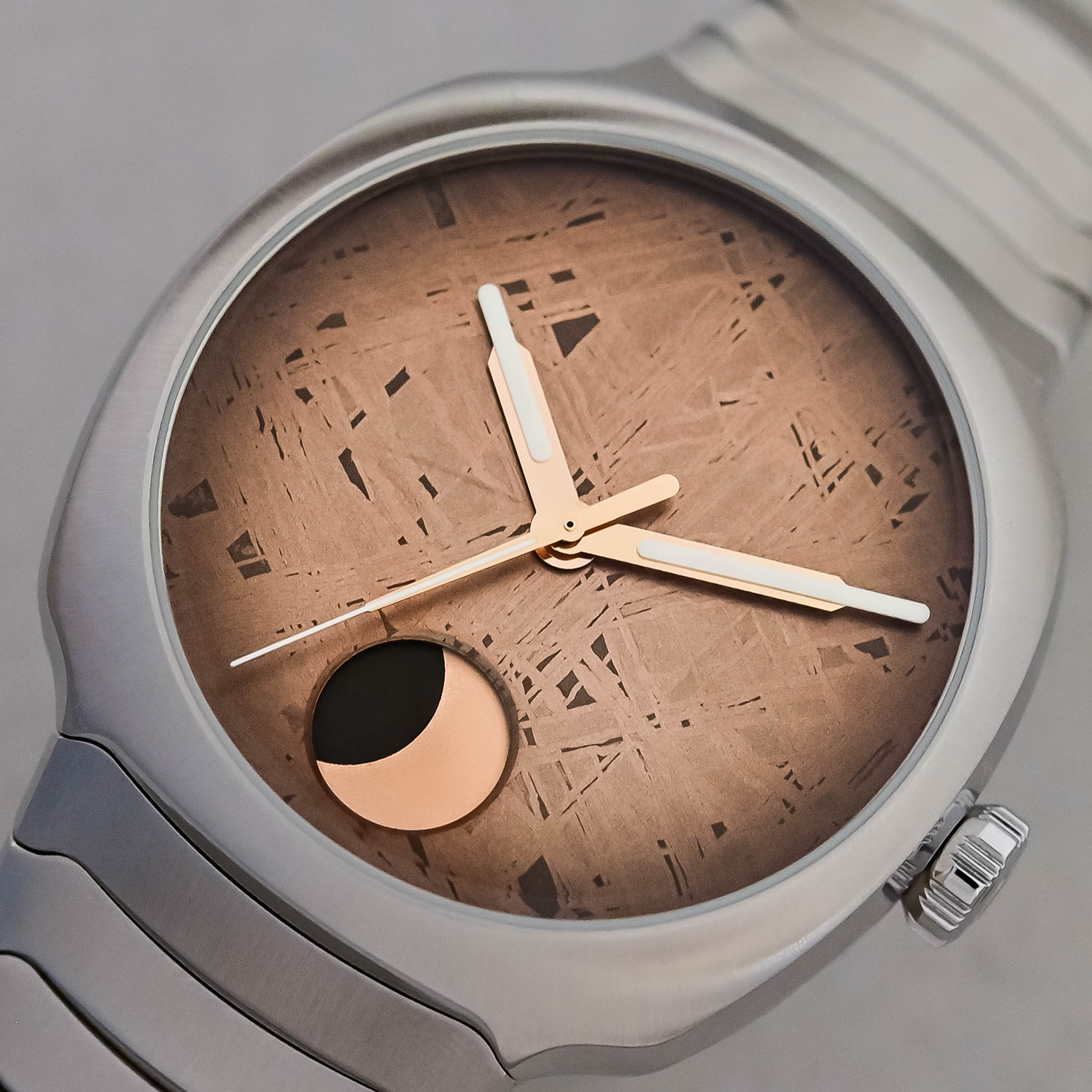 Connecting with the vastness of the universe, the dial is crafted from a sliver of the Gibeon meteorite that hurtled through space before crashing in Namibia. With its unique Widmanstätten pattern produced by the iron-nickel alloys, the meteorite dial is embellished with a golden tone and, in true Moser fashion, a fumé or gradient effect. Like all Moser’s “concept “ watches, the dial is stripped down to its bare essentials. Bereft of hour markers, the only other elements on the dial are the central red gold hour and minute hands with Globolight inserts and the large cut-out hole at 6 o’clock for the moon phase complication.