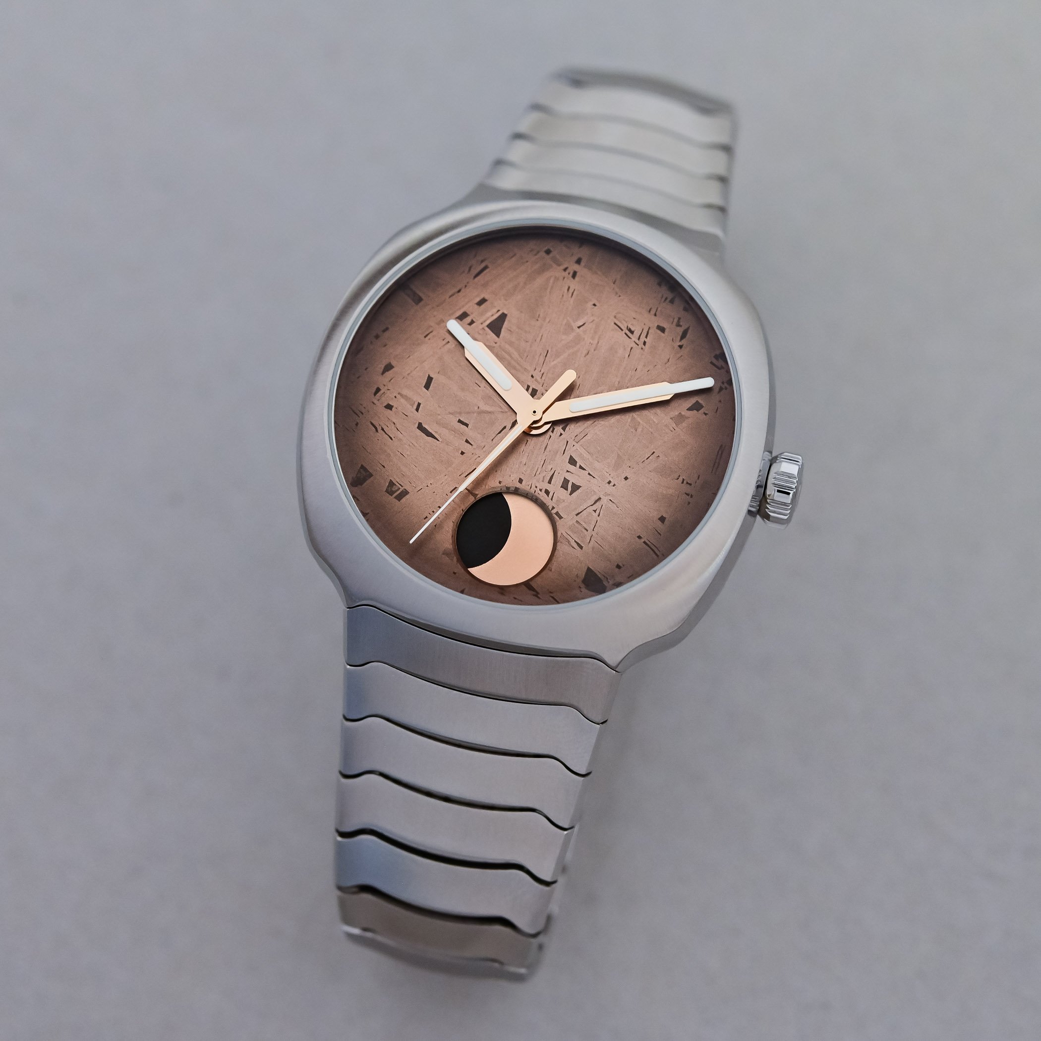 With its streamlined case, flexible integrated bracelet and sensual contours, H. Moser & Cie.’s sleek Streamliner luxury sports watch continues its journey onwards, and in this case upwards, with no signs of losing steam. Coinciding with Dubai Watch Week 2025, Moser unveils the new Streamliner Perpetual Moon Concept Meteorite, a hyper-accurate moon phase complication framed by a shard of outerspace rock culled from the Gibeon meteorite.