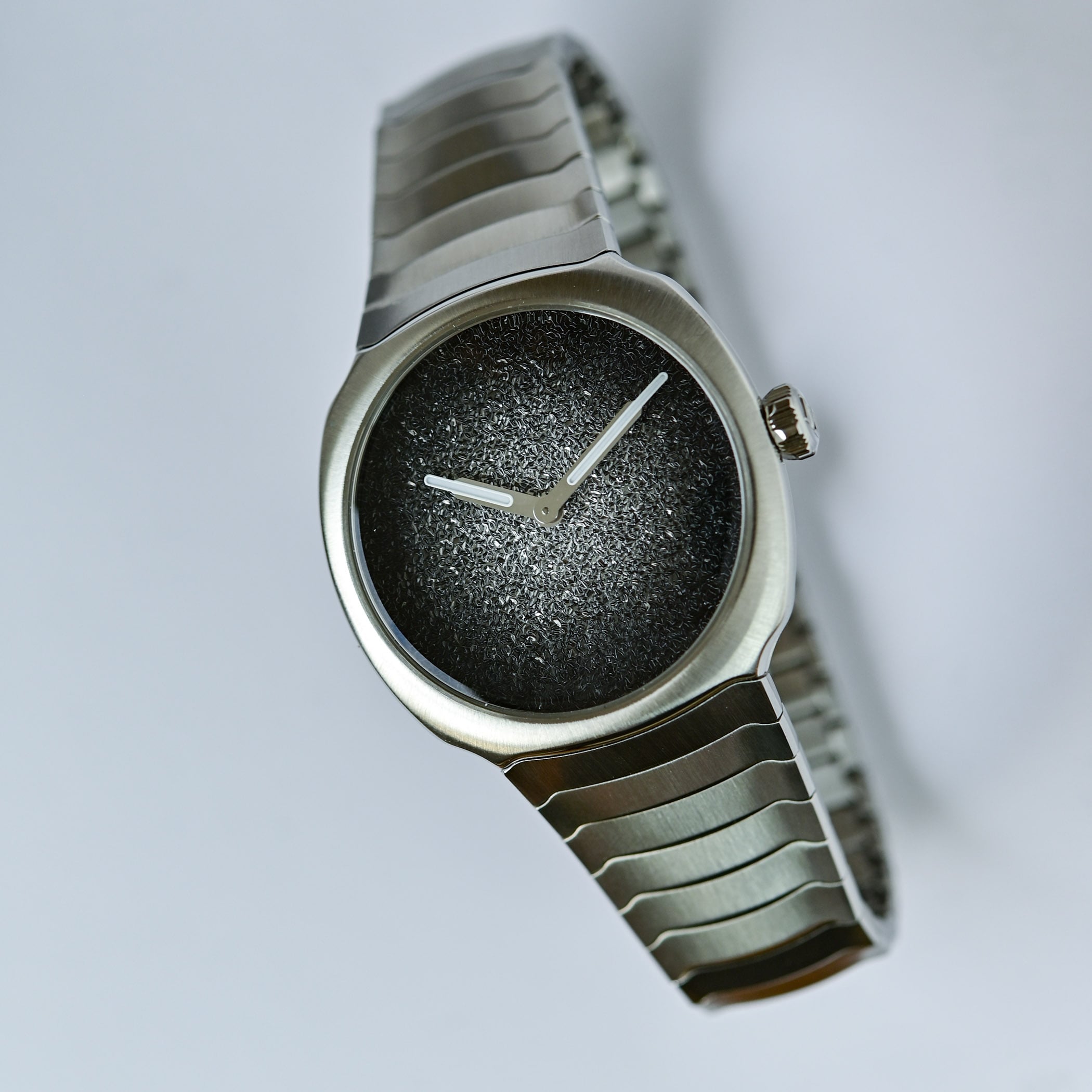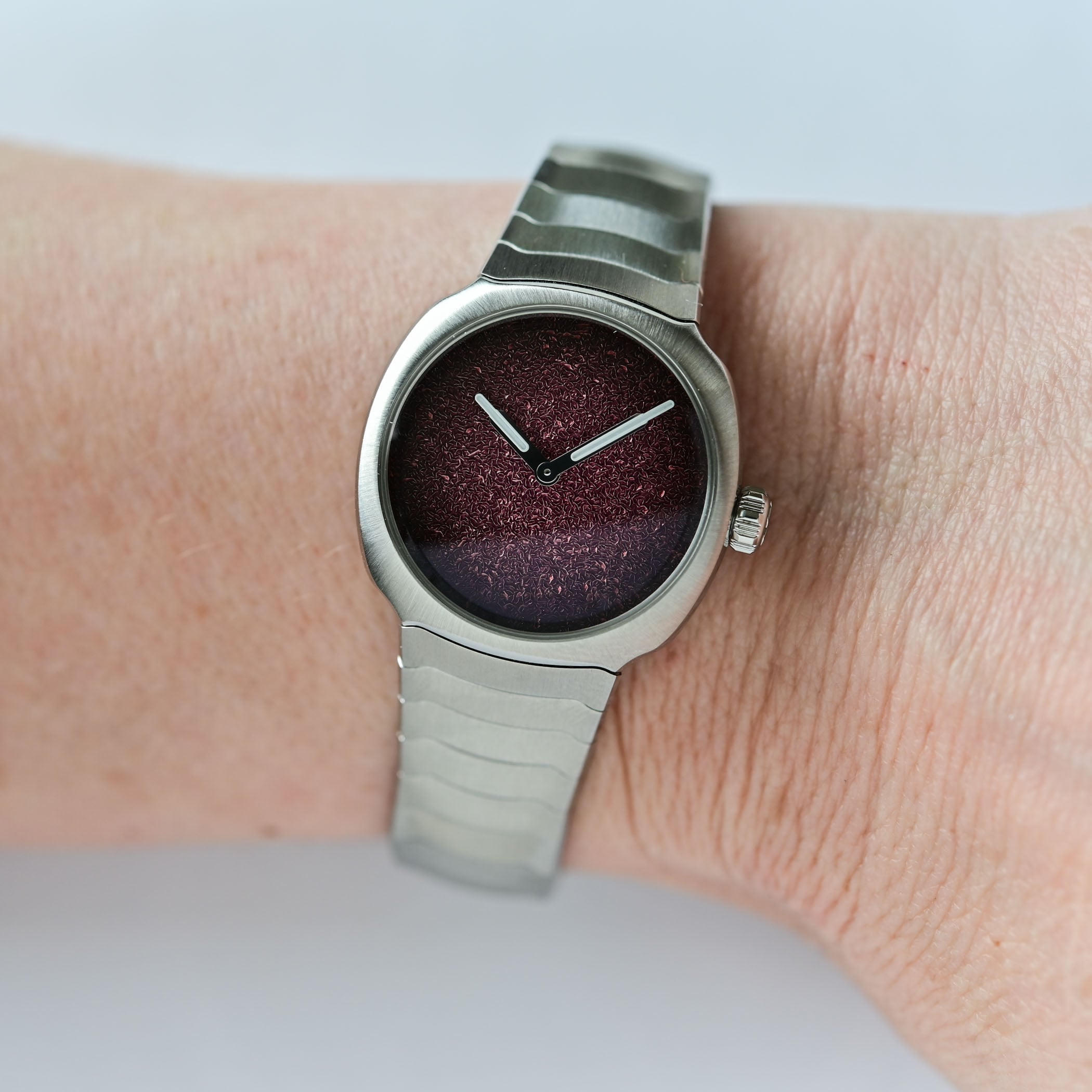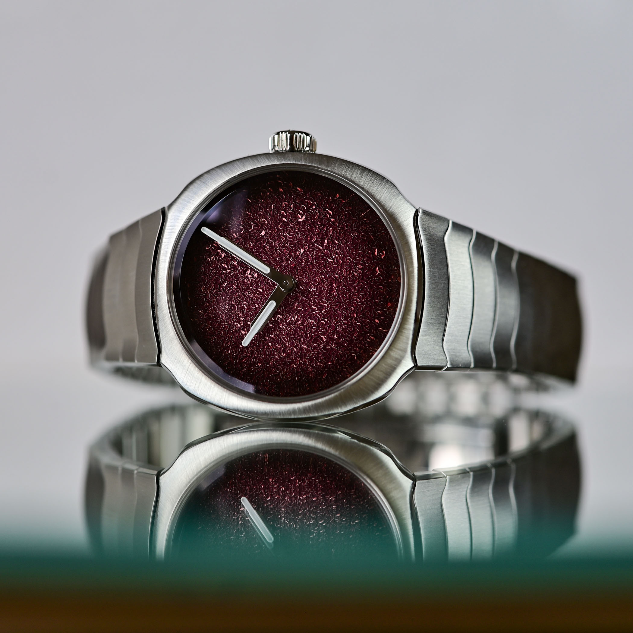 Like Moser’s “Concept” watches, the deliberate obliteration of any superfluous distractions allows the texture and colour of the dial to shine. With no indices, no tracks and no logo, the only elements on the dial of the new models are the Super-LumiNova-coated hour and minute hands. Similar to the frozen dials featured on the Streamliner Flyback Chronograph, the frosted texture is hand-engraved on the brass plate and then enhanced with a gradient lacquer finish, the brand’s signature fumé touch. Translated as “smoked” in French, Moser’s fumé dials display a hypnotic gradient effect that fades from a lighter hue at the centre to a deeper tone at the edges. The 34.2mm model has a silver fumé dial with a frosted texture, while the mini 32mm has a burgundy fumé dial.
