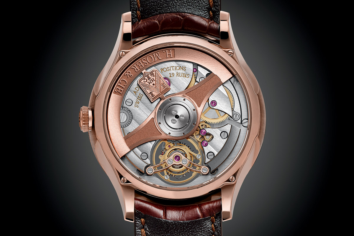 - Movement: In-house automatic calibre HMC 802 – Diameter: 34.0 mm or 15 lignes, height: 6.5 mm – Frequency: 21,600 vibrations/hour – Automatic bi-directional pawl winding system – Solid 18-carat red-gold rotor engraved with H. Moser & Cie. company hallmark – Power reserve: minimum 3 days – Moser teeth for all wheels and pinions – Original Straumann Double Hairspring® – Minute tourbillon at 6 o’clock with skeletonised 18-carat gold bridges.