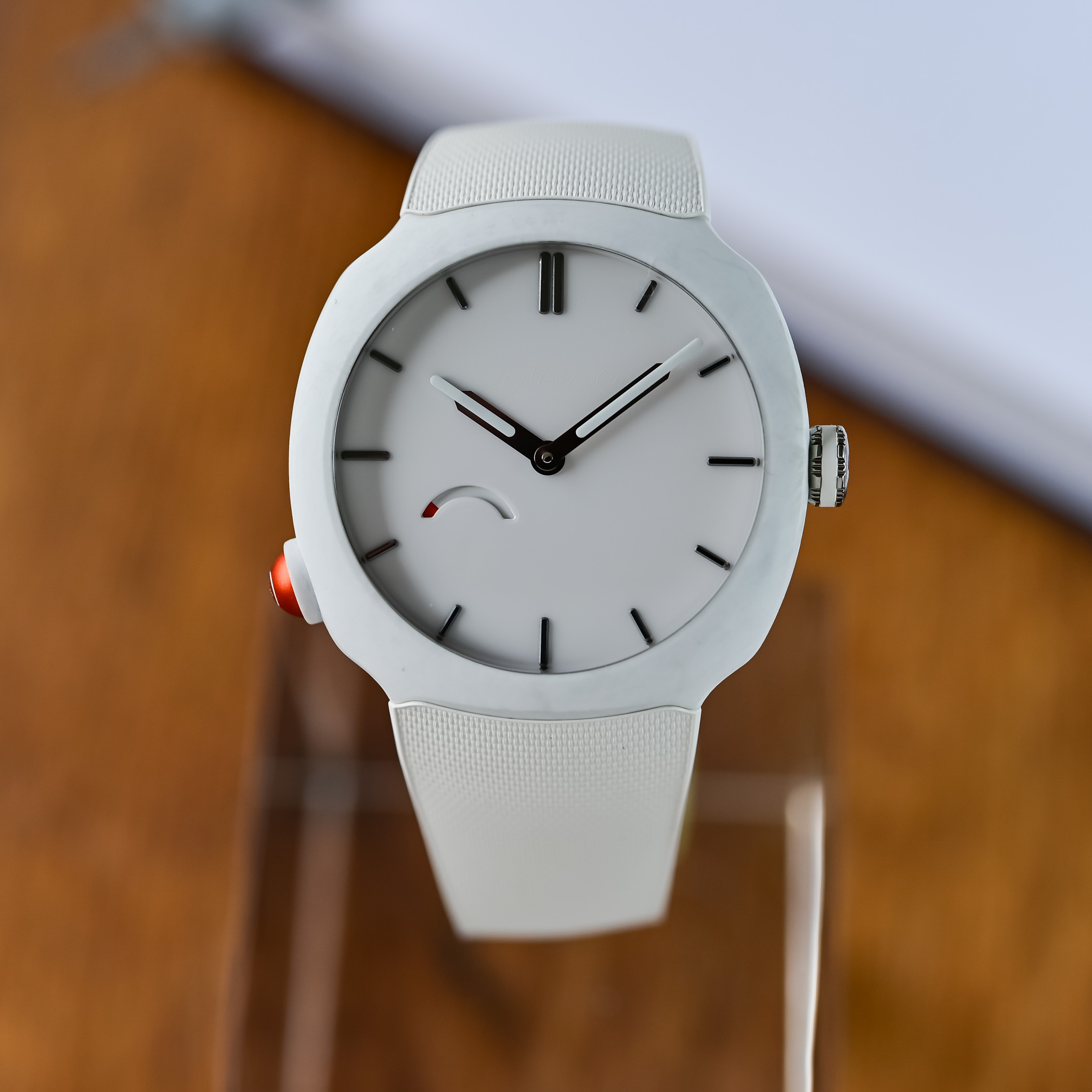 Although it is not one of Moser’s minimalist Concept watches, the dial is deliberately stripped down to essentials. Matching the colour of the case, the black or white lacquered dials are polished with applied hour markers and hands treated with grey or white Globolight inserts that glow green in the dark. With so much empty space on the dial, the arched power reserve indicator at 8 o’clock, with its orange bar, really stands out.