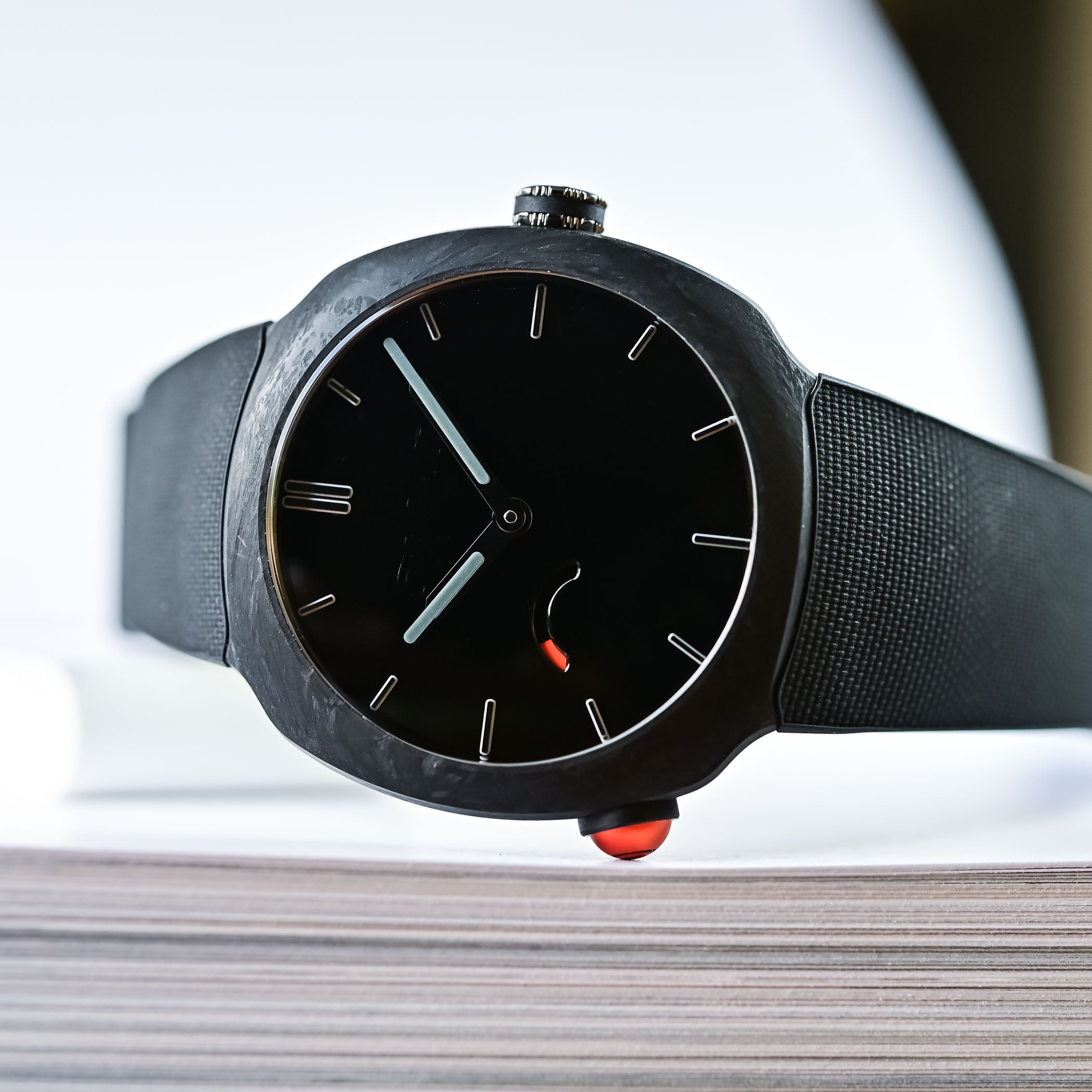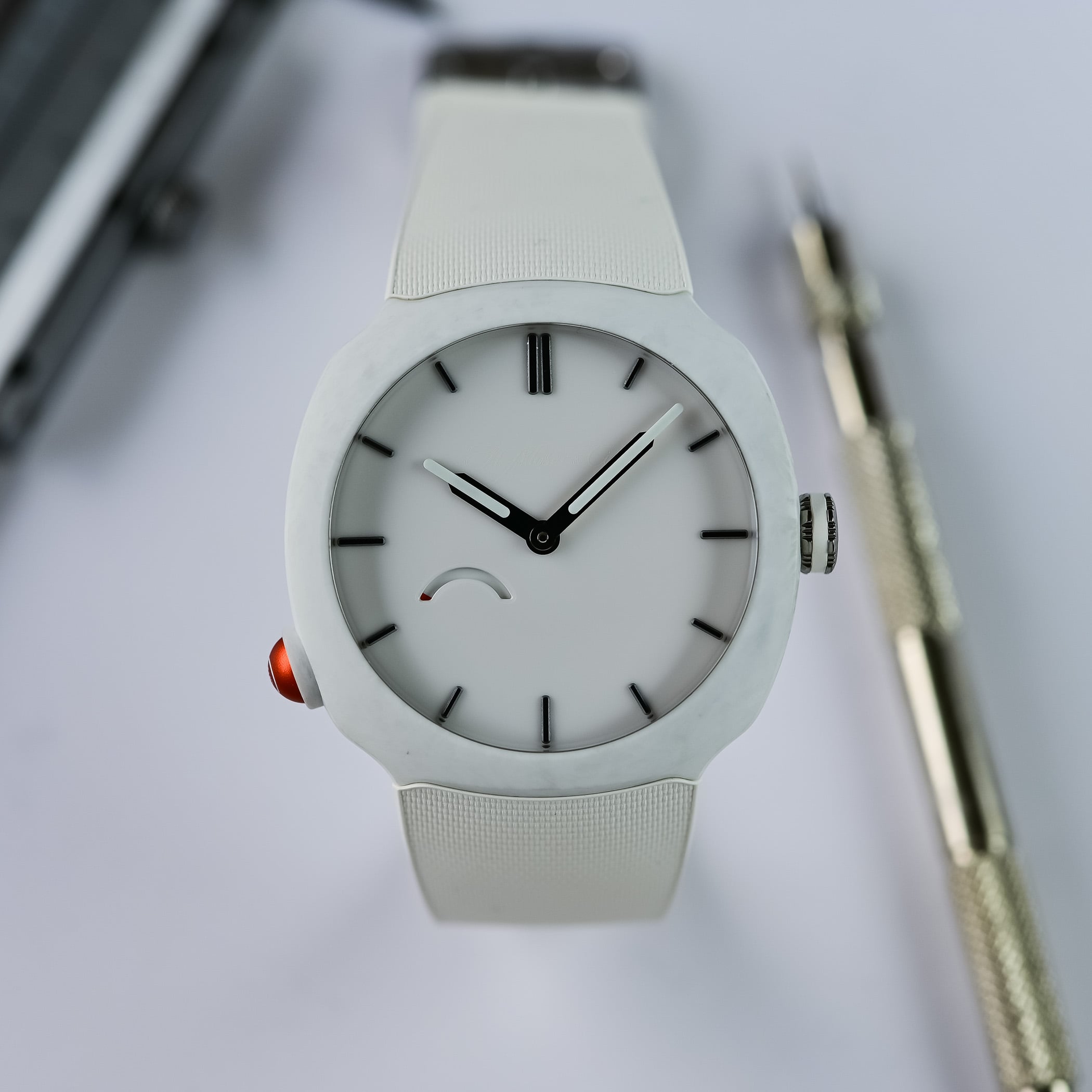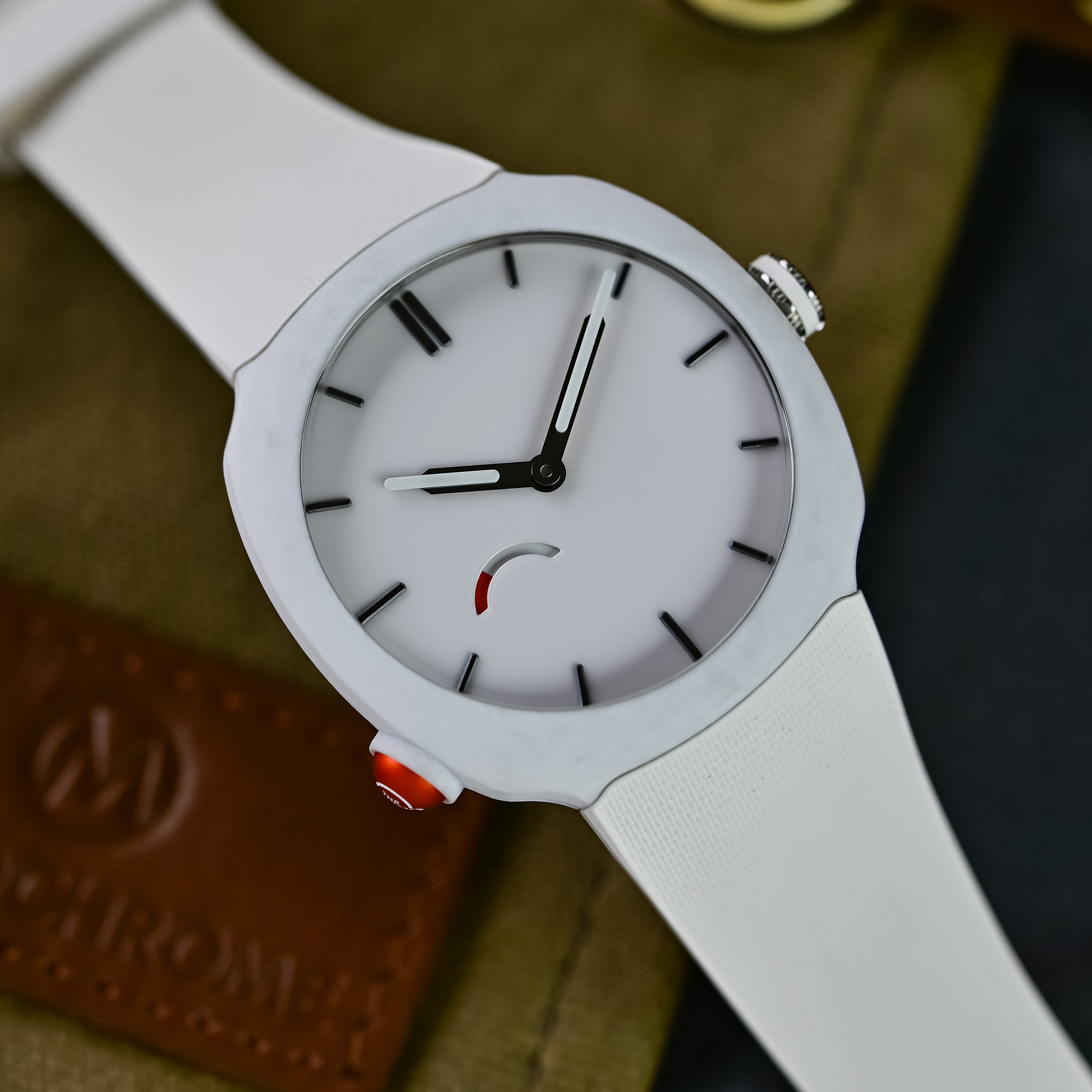 Rarely seen in watchmaking, the cases are made from matte forged quartz fibre. To produce forged quartz fibre, it is cut into segments, placed in a mould, compressed and injected with resin. The process produces a matte material with a unique mottled or moiré pattern. Purer and whiter than glass fibre, resistant to UV exposure, and lightweight, quartz fibre offers an advantage over carbon in that it can be coloured. An internal titanium casing – referred to as a sarcophagus by the brand – shields the movement, ensures water-resistance to 100 metres, and secures the integrated rubber strap.