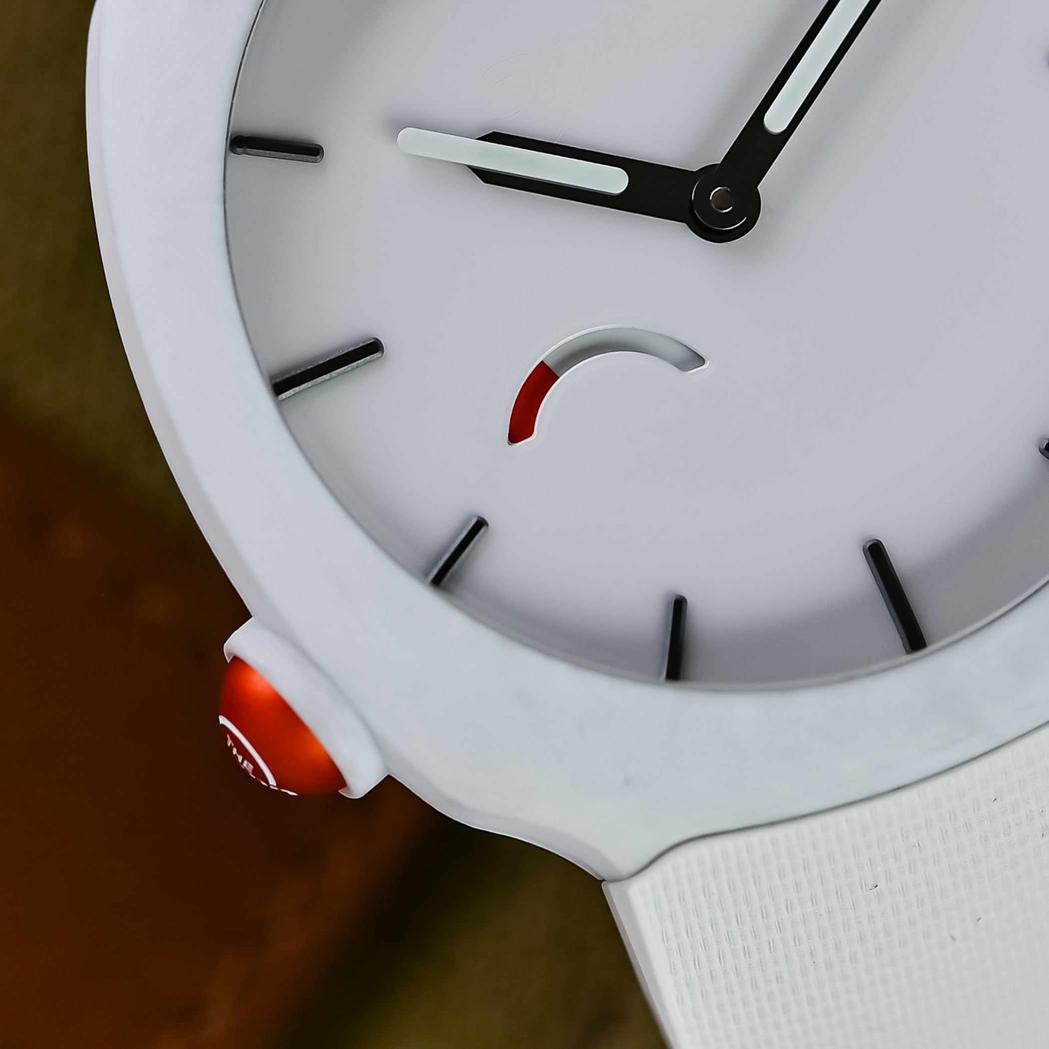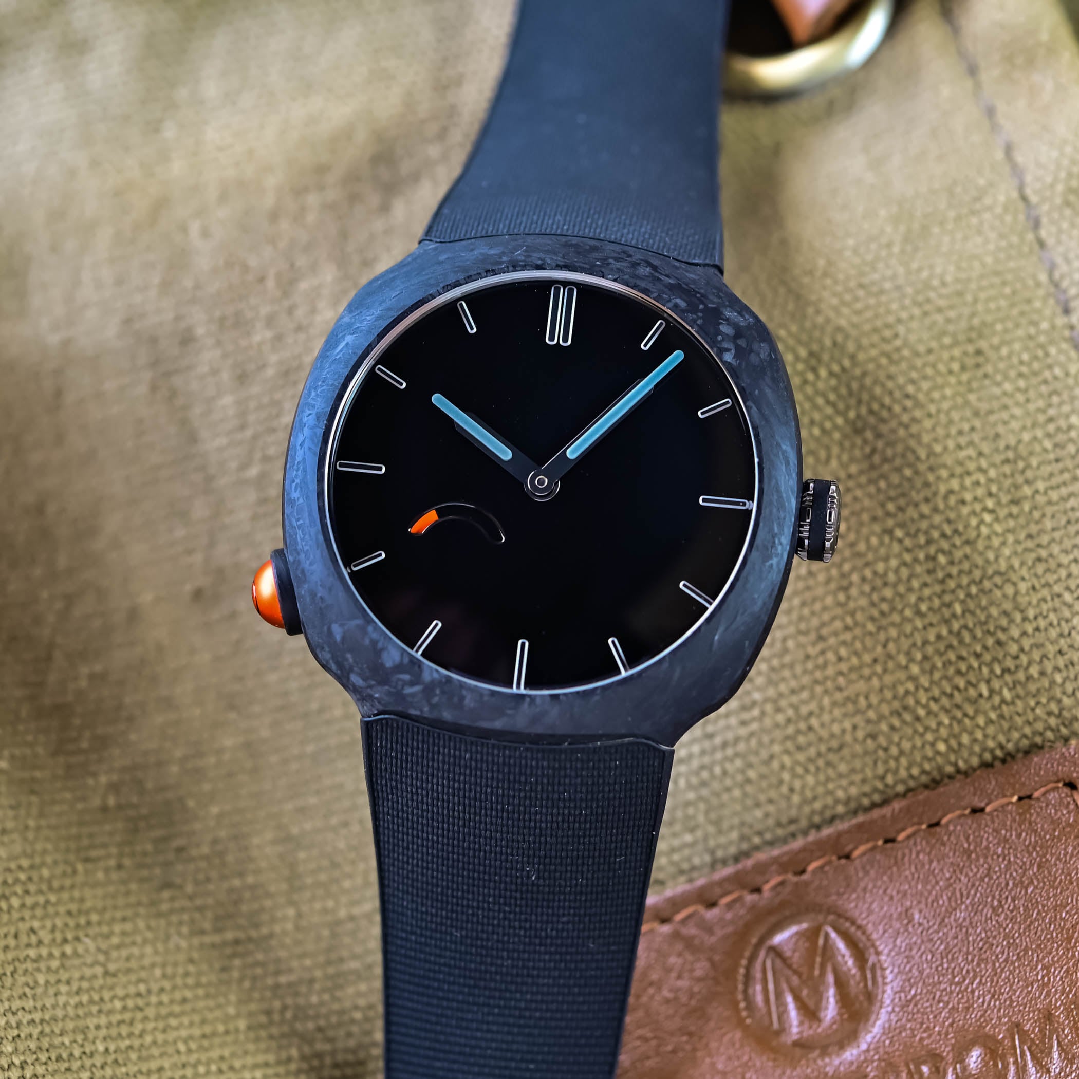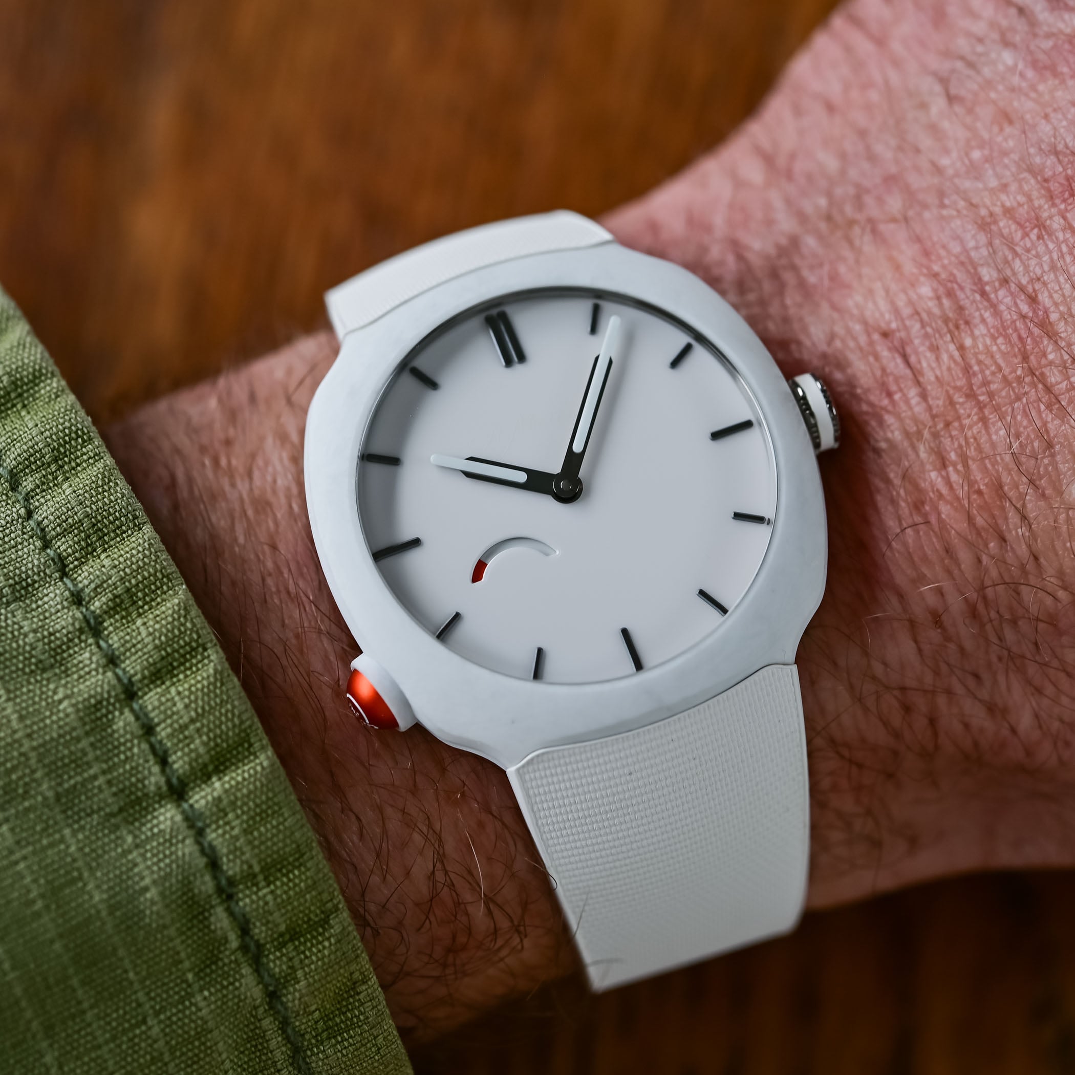 Rarely seen in watchmaking, the cases are made from matte forged quartz fibre. To produce forged quartz fibre, it is cut into segments, placed in a mould, compressed and injected with resin. The process produces a matte material with a unique mottled or moiré pattern. Purer and whiter than glass fibre, resistant to UV exposure, and lightweight, quartz fibre offers an advantage over carbon in that it can be coloured. An internal titanium casing – referred to as a sarcophagus by the brand – shields the movement, ensures water-resistance to 100 metres, and secures the integrated rubber strap.