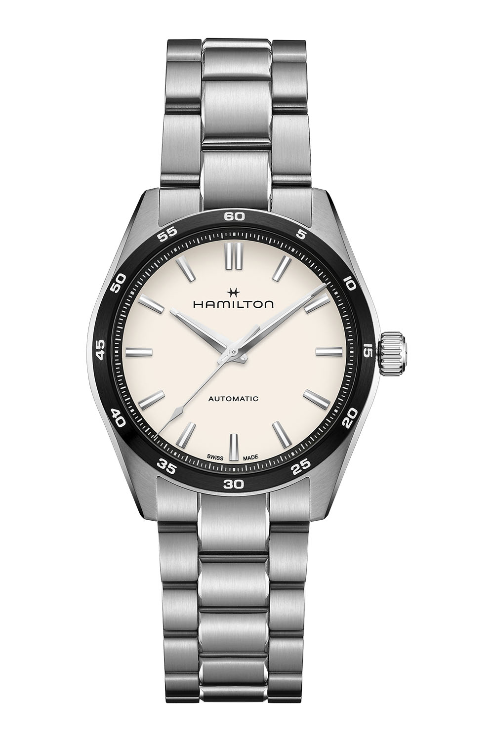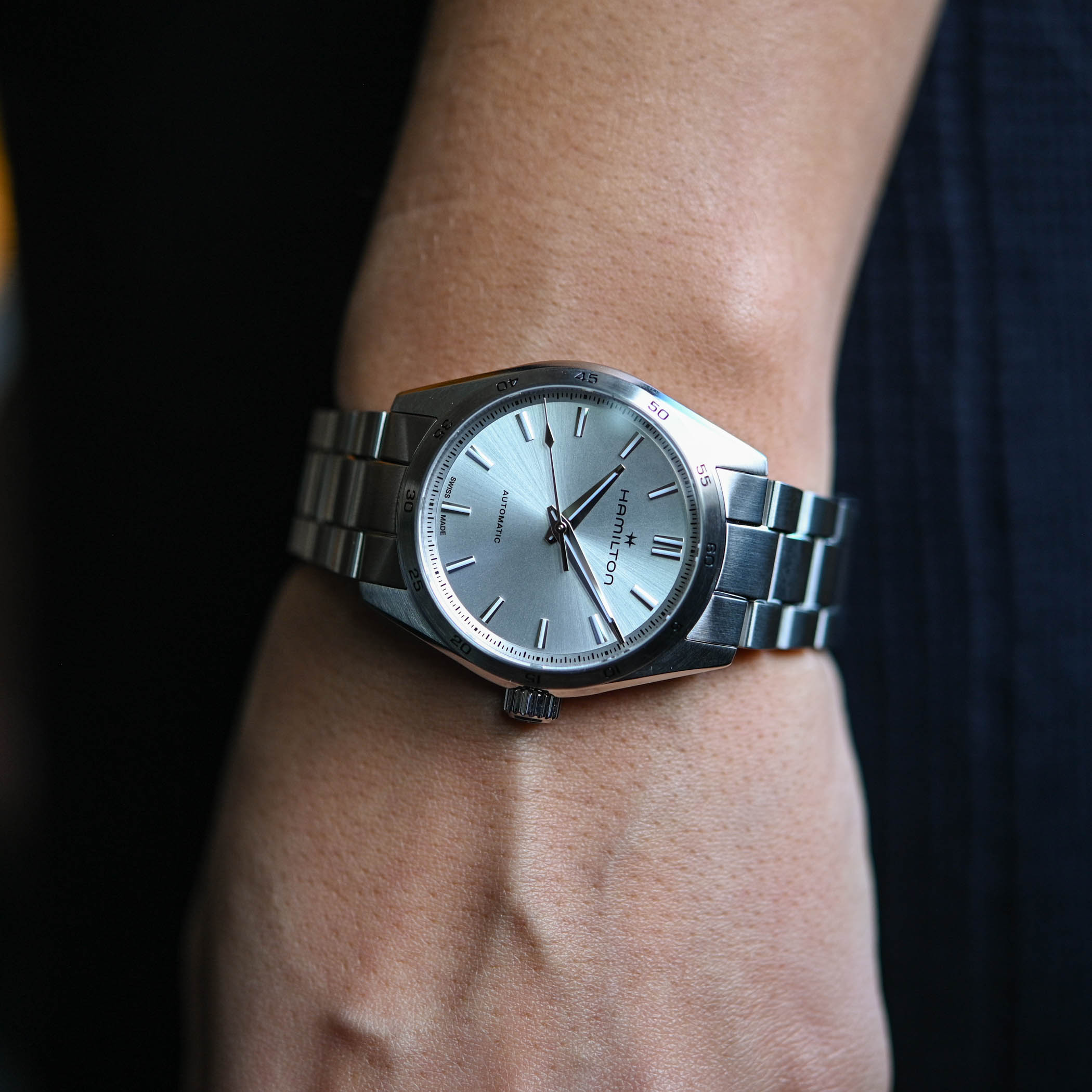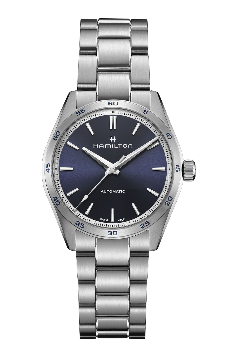 A sleeker take on the same concept, the time-only Jazzmaster Performer Automatic comes in a pleasantly sized 38mm case, with a controlled height of 11.5mm. The tachymeter scale is replaced here by a bezel inscribed with a 60-minute scale and a much thinner profile, giving it a slender, slightly more elegant look. Still, the watch retains sporty specs with a 100m water-resistance and a screw-down crown.
