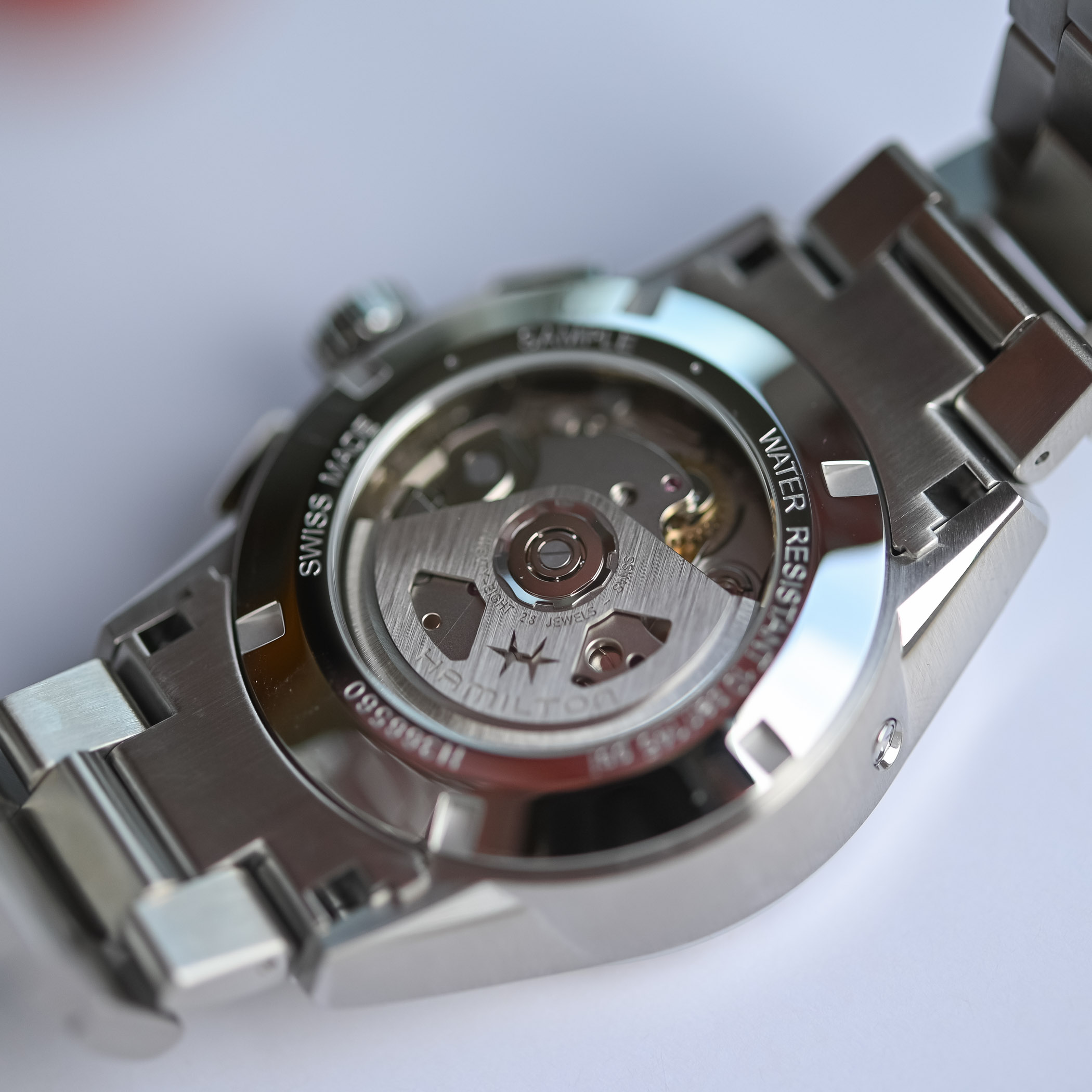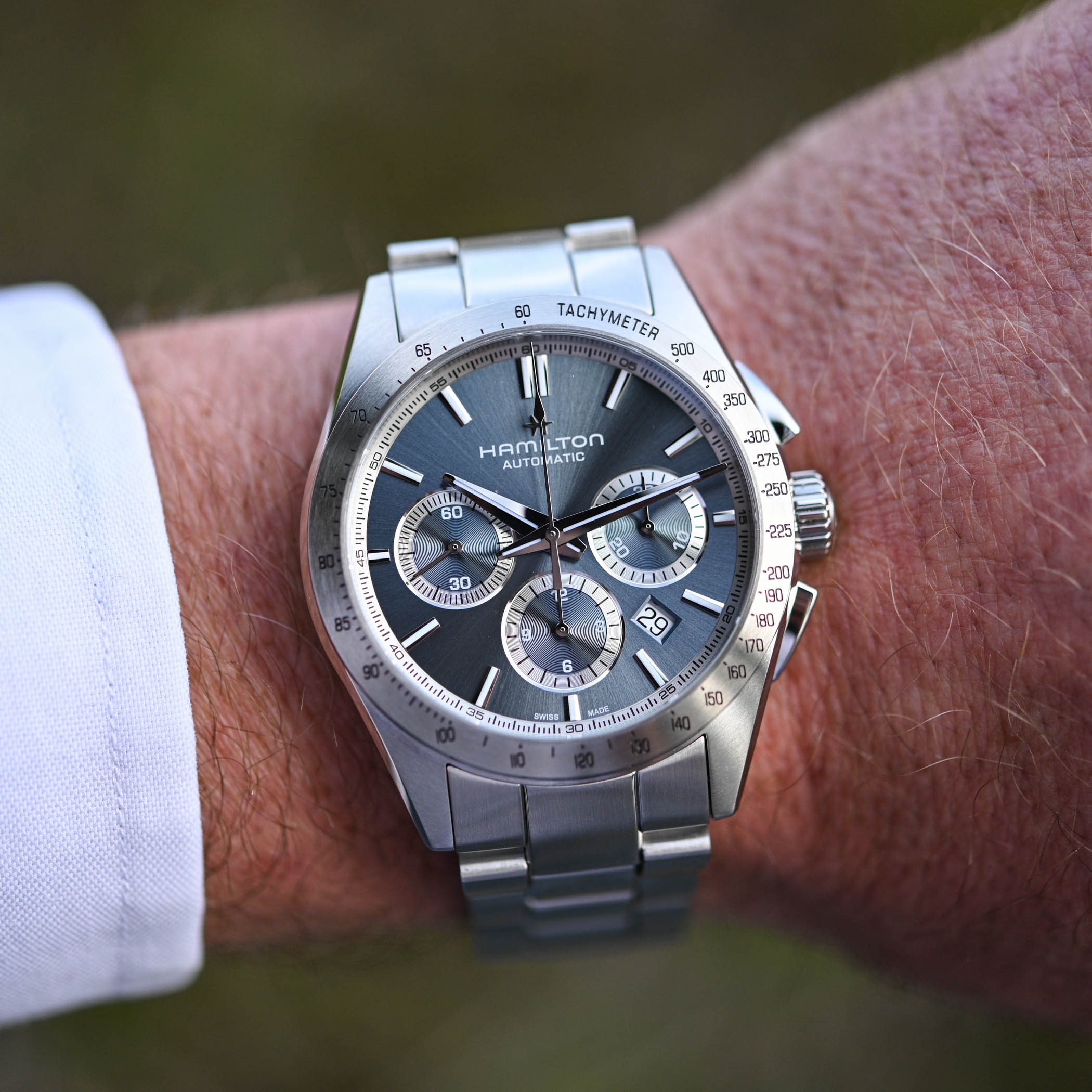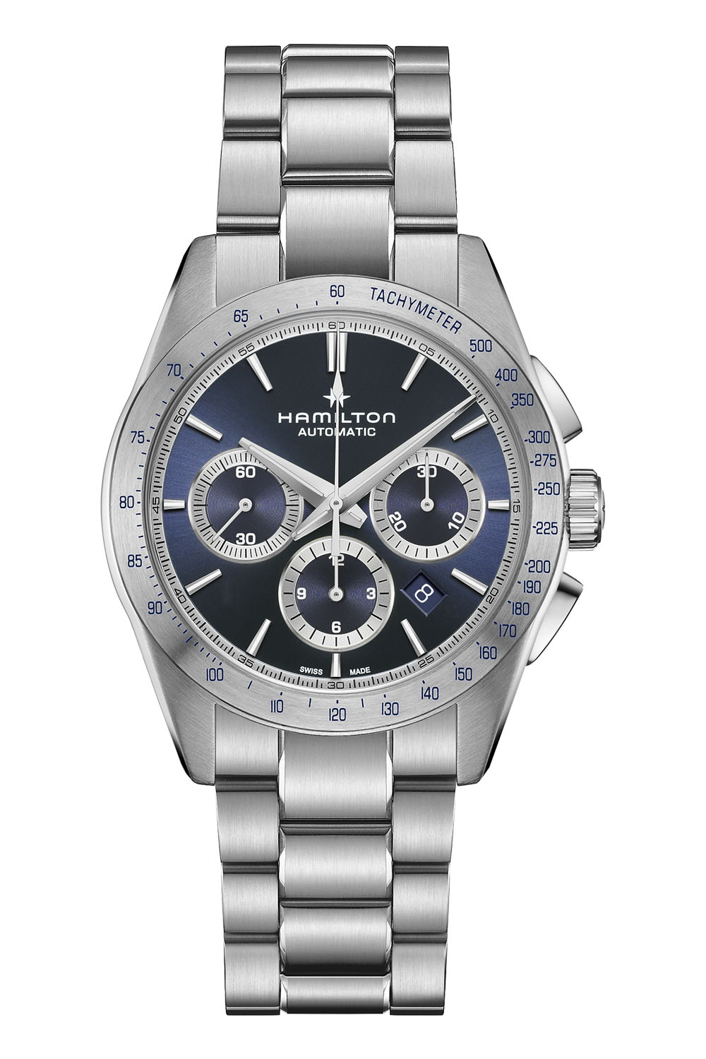 Quick facts: 42mm x 15.22mm – stainless steel case – sapphire crystals – dark or pale blue dials with sunray-brushed finishing – steel bezel with tachymeter scale – water-resistant to 100m – H-31 calibre, automatic chronograph – 4Hz and 60-hour power reserve – 3-link steel bracelet with folding clasp – reference H36616140 (dark blue) and H36656140 (pale blue) – EUR 2,525 / CHF 2,240 / USD 2,245