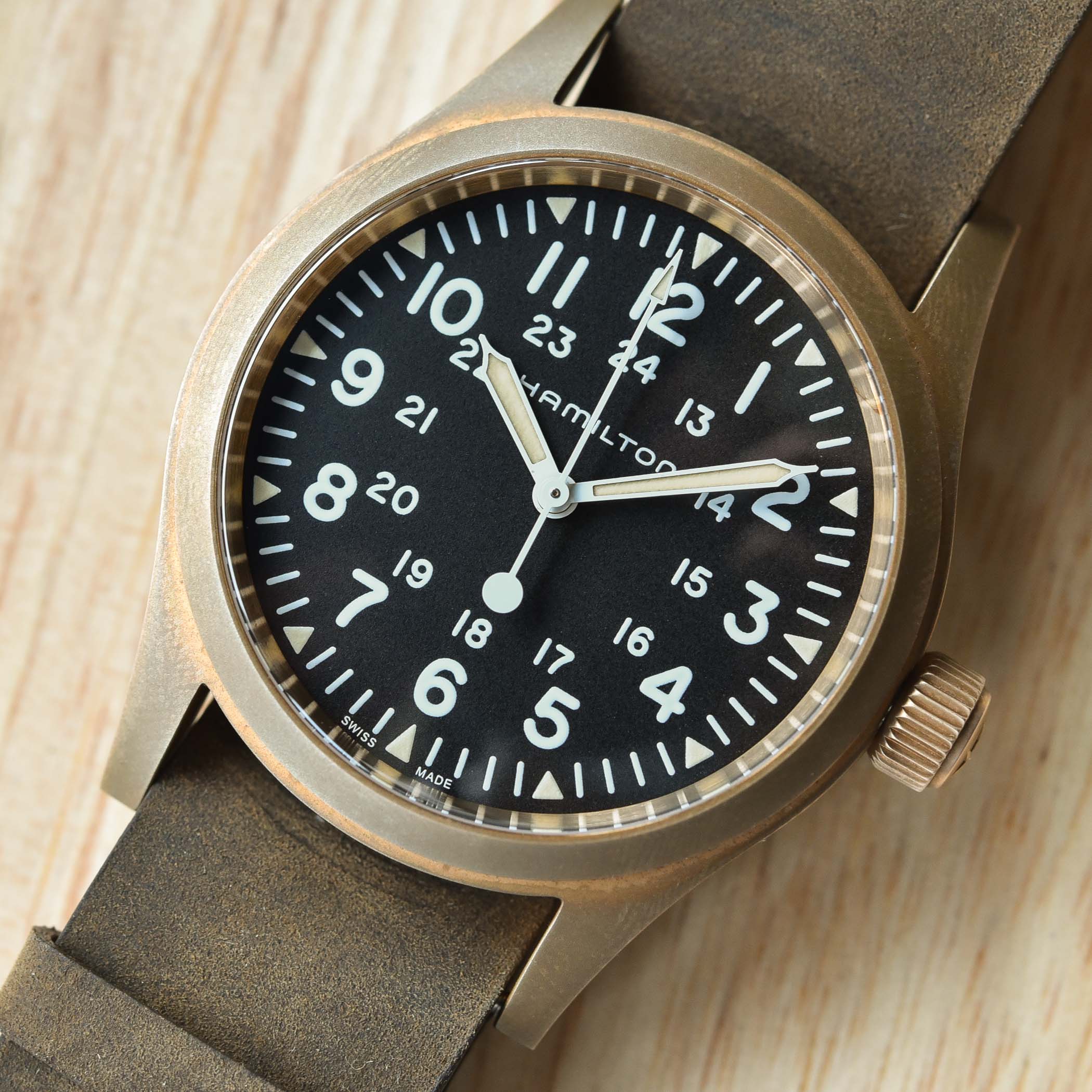 At first, it was introduced with a black dial, with beige and white markings throughout. By now, there are several dial colours and case finishings available, ramping up the versatility and often the military theme of the watch as well. A white dial for instance, with contrasting black and beige hands, or even a coffee-brown dial, it’s all possible. In terms of case finishings, you have the matte steel of the original but also a coffee-brown or black PVD coating. And earlier this year, the collection was completed with a bronze edition. In 2019, in accordance with other brands within the Swatch Group, Hamilton swapped the initial ETA 2801-2 mechanical movement for the more modern H-50 movement which provides 80 hours of power reserve.