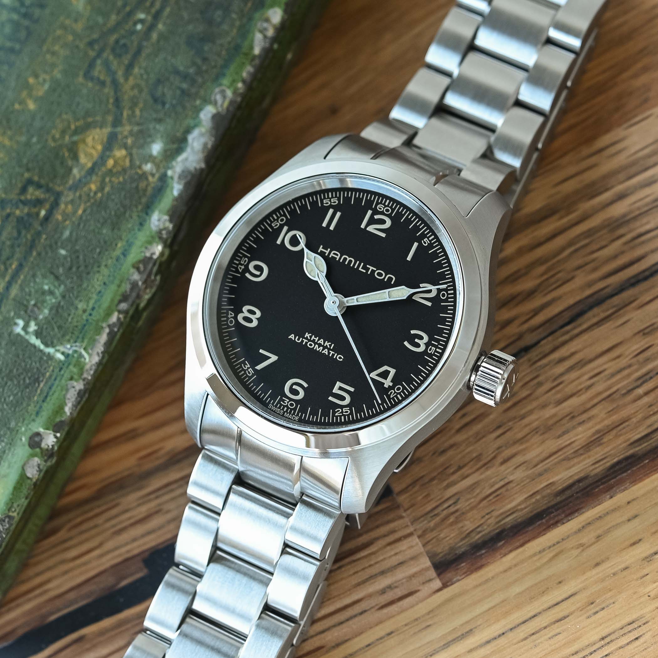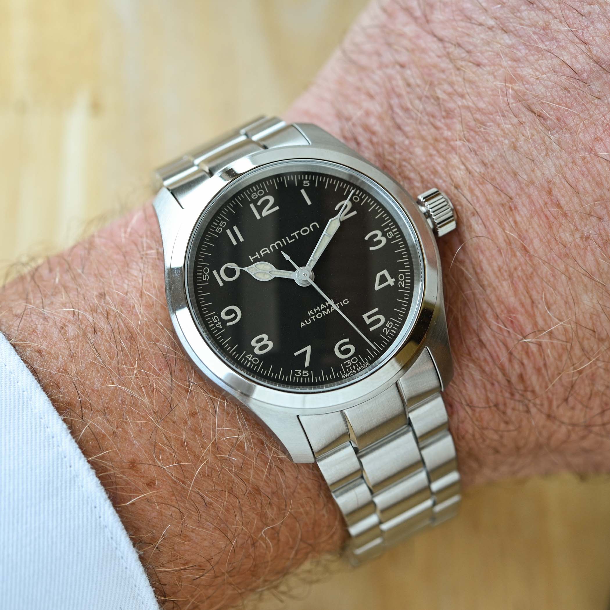 The second reference is identical to the 38mm model released in 2022 but is now available with a brushed 3-link stainless steel bracelet with a folding clasp, similar to the titanium bracelet of the Khaki Field Titanium models.