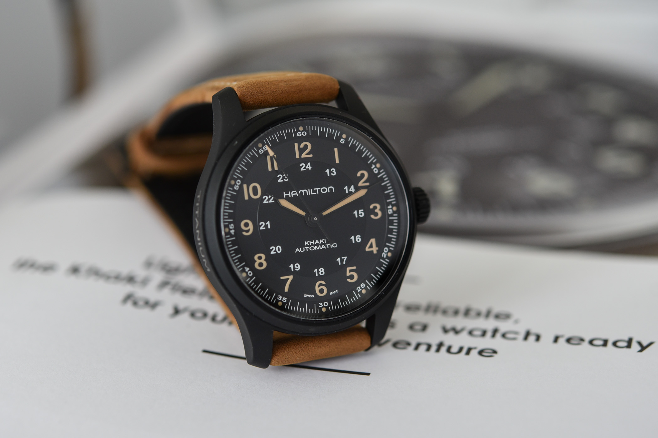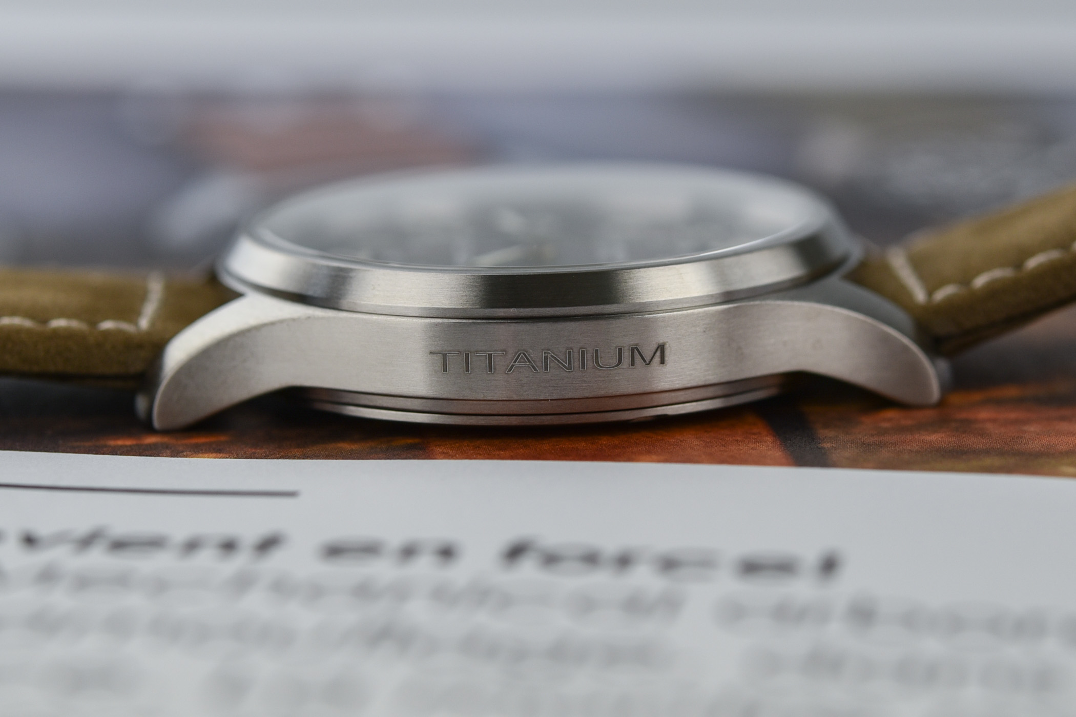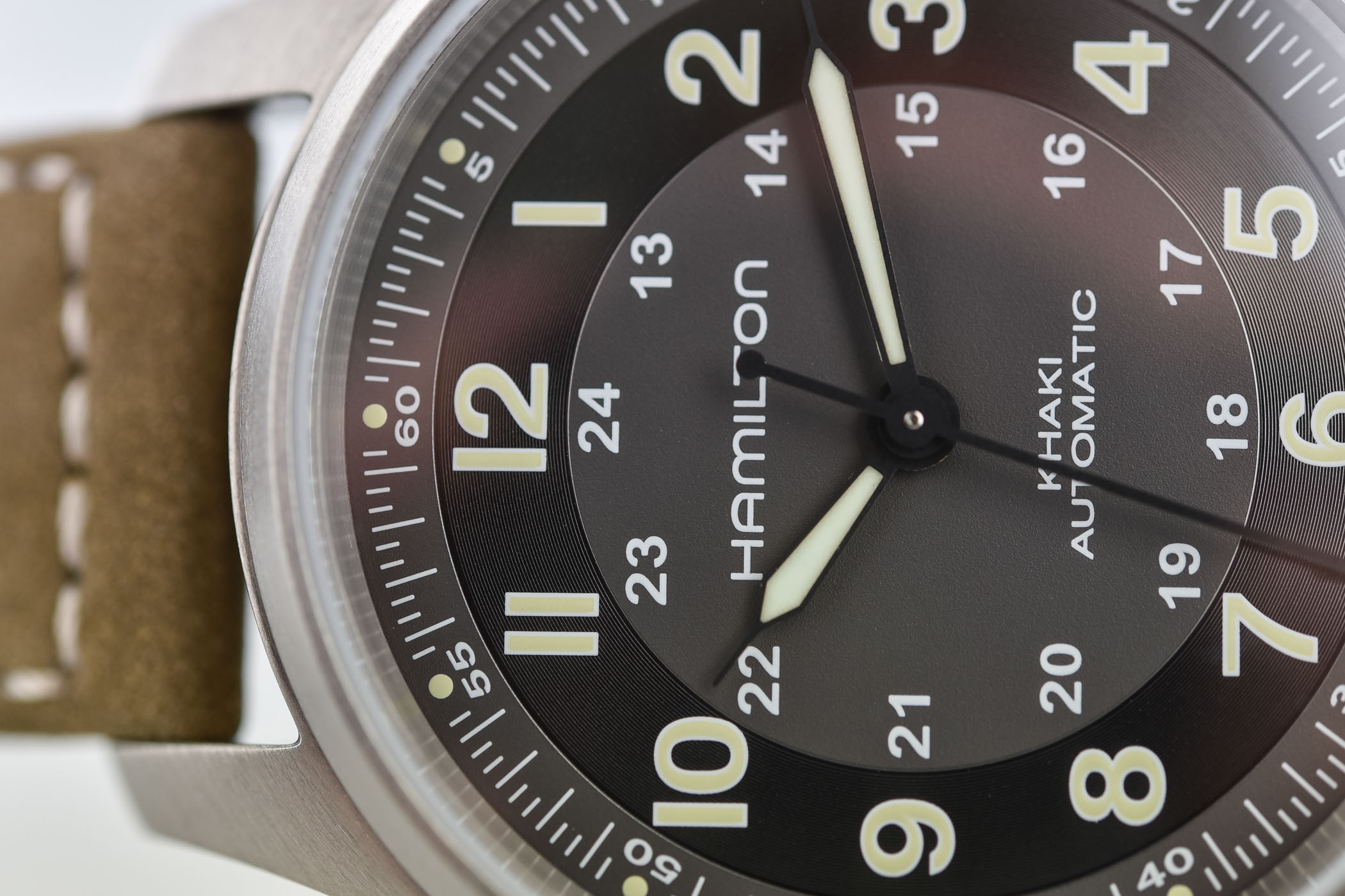Hamilton has a healthy variety of field watches sporting hand-wound, automatic and quartz movements in sizes ranging from 38mm to a whopping 50mm in diameter. The Khaki Field Titanium Automatic falls in at 42mm, which is on the upper end for a traditional field watch, but still very wearable and contemporary. The titanium case keeps it light and comfortable on the wrist and dual sapphire crystals add to overall durability. The finish is brushed throughout with a satin sheen, and TITANIUM is boldly engraved on the left side.