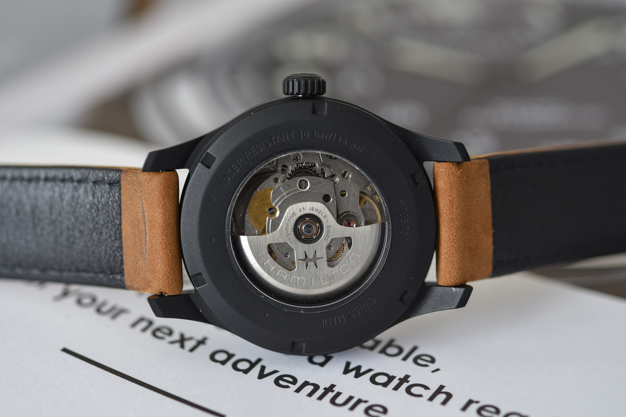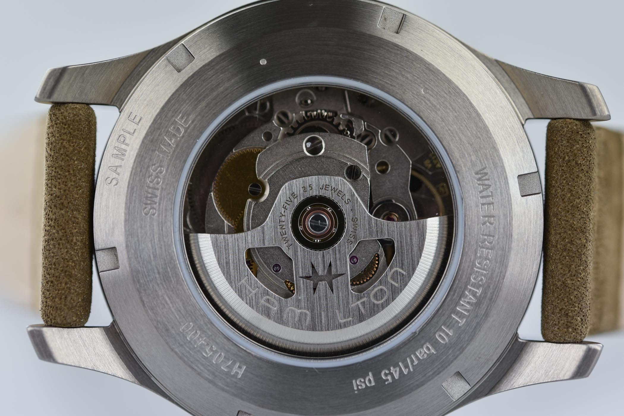 The sapphire exhibition caseback displays Hamilton’s proprietary H-10 automatic calibre with a sizeable 80-hour power reserve (the Khaki Mechanicals have 80-hour hand-wound counterparts). Based on the ETA C07.111, the movement features 25 jewels, beats at 21,600vph (3Hz) with an 80-hour power reserve. The rotor has been customized with Hamilton’s “H” cut out between the openworked sections, while the remainder of the calibre is undecorated (accessible price obliges).