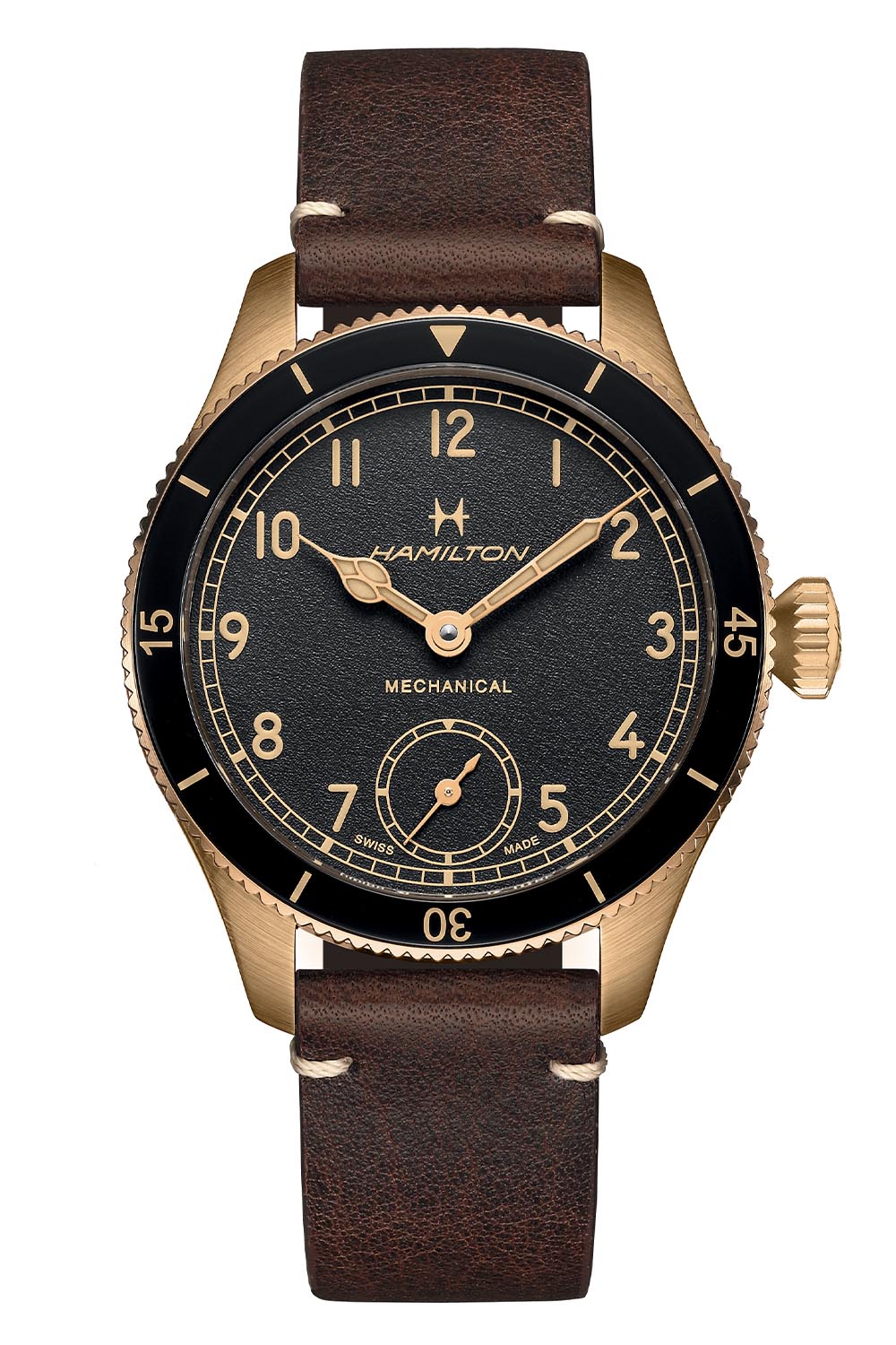 Quick Facts: 43mm diameter x 13mm height – stainless steel or bronze with titanium back, brushed, 100m water-resistant – bi-directional bezel with mineral glass insert – AR sapphire crystal on top, see-through caseback – matte grained black dial with small seconds, old-radium luminous markers and hands – ETA Unitas 6498-1, hand-wound, 2.5Hz, 50h power reserve – 20/18mm leather strap with pin buckle – reference H76719530 (steel) and H76709530 (bronze) – CHF 1,195, EUR 1,095 or USD 1,295 in steel – CHF 1,450, EUR 1,345 or USD 1,545 in bronze