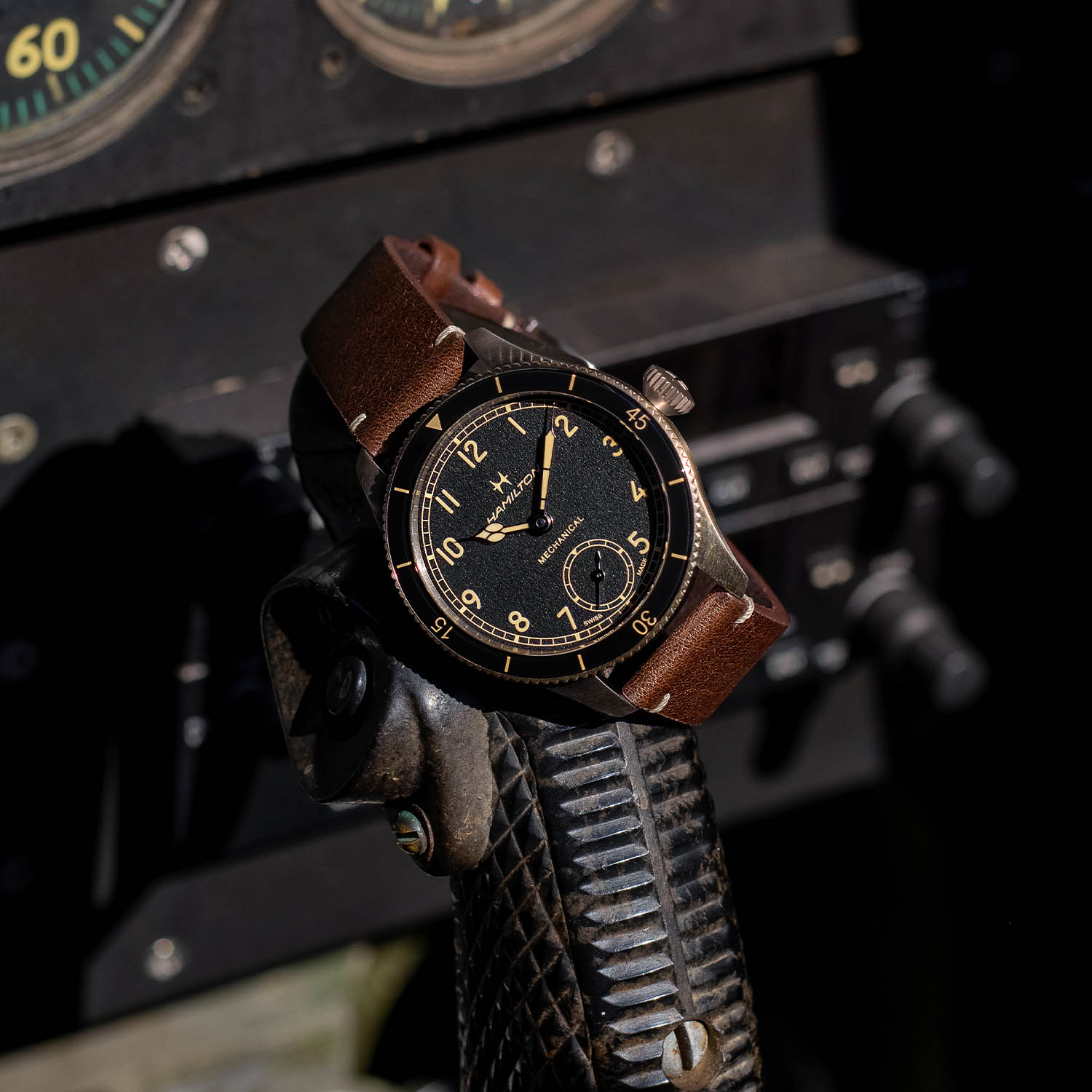 Now, in 2021, Hamilton is using the codes of these Model 23 pocket watches and their elegant dial aesthetic to create the new members of the Khaki Pilot Pioneer collection, wristwatches with a no-nonsense, utilitarian and retro-looking pilot style, offered in two versions, one in a 38mm case with an automatic movement, and one in a 43mm case with a hand-wound calibre – knowing that the later is available either in steel or in bronze. And Hamilton being Hamilton, these watches are once again offered at very fair prices. And if the relevance of the inspiration and how it has been transposed into a wristwatch is somehow debatable, it’s hard not to admit that the result is visually attractive.