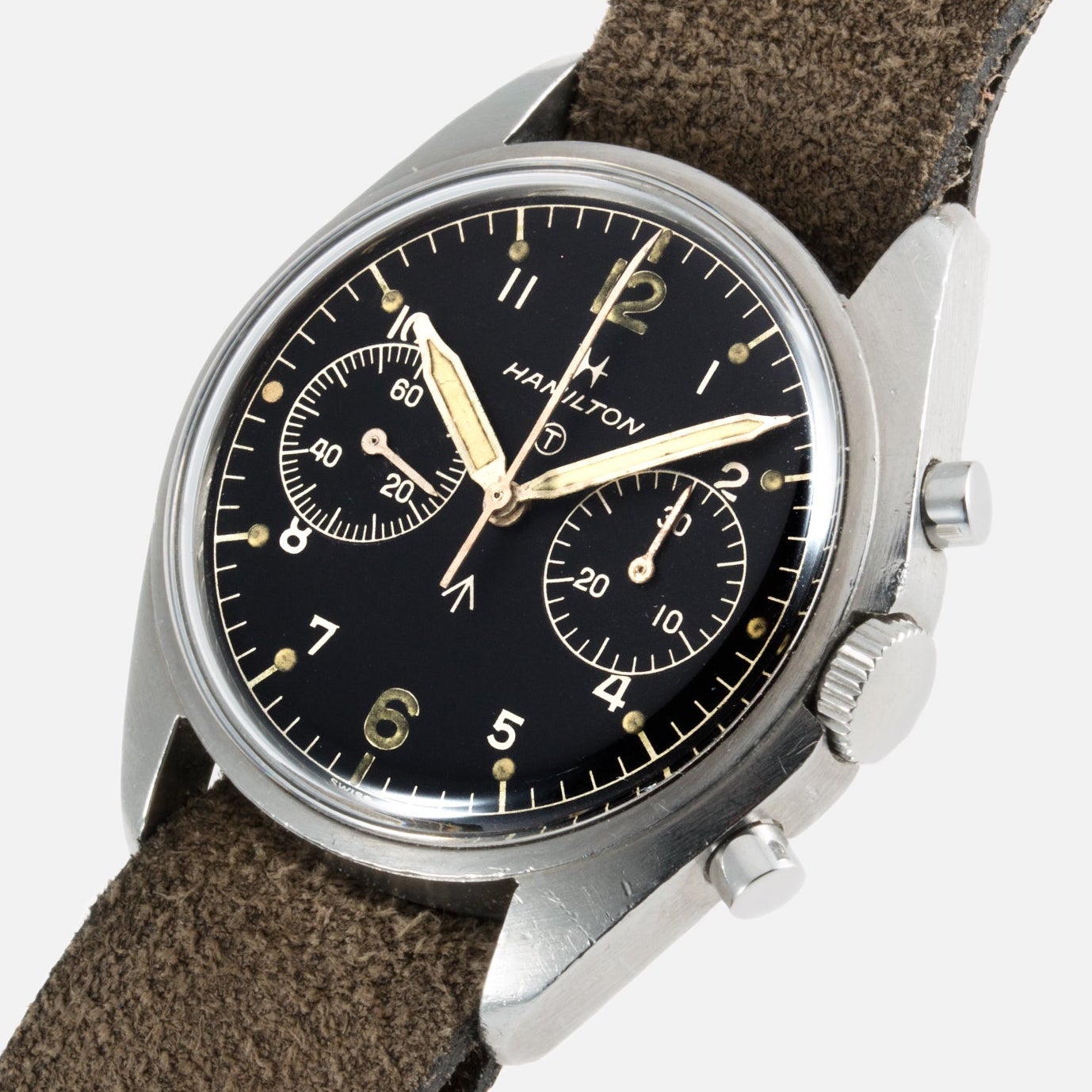The dial follows suit and again respects the original 1970s watches. On the Hamilton Khaki Pilot Pioneer Mechanical Chronograph, this means a matte grained black dial with simple printed tracks and large markers and numerals. The two-register layout has been respected, and no, there’s no date to ruin this beautifully clean dial. The hands, like the original, are white lacquered, and all the elements are generously filled with Old Radium Super-LumiNova. Simple, efficient, ultra-legible and, for all of these reasons, attractive.