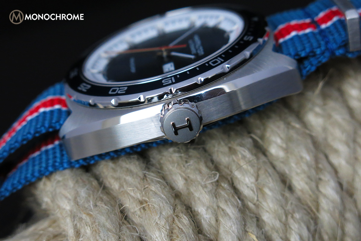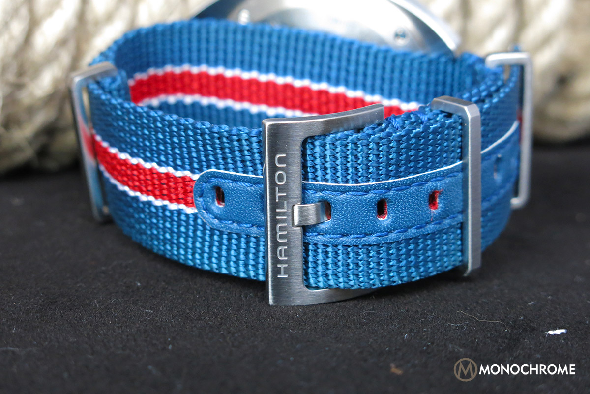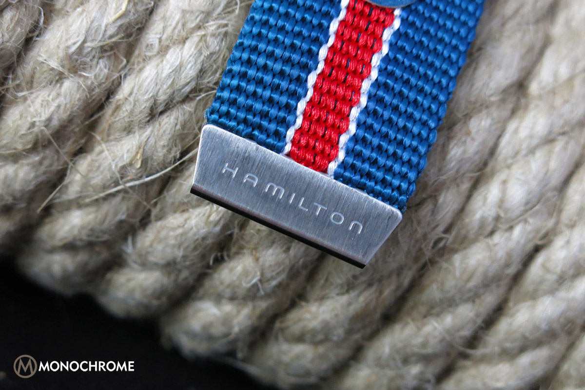 The included blue and red NATO strap is a true gem though, and shows care and attention into this sometimes overlooked part of the watch. Matching it in terms of color emphasizes the 70’s feel. The end of the strap is finished with a steel nib including the Hamilton-logo, the rings are squared for a tight and easy fit of the strap, the buckle is sturdy (again with the Hamilton) and the hole-section of the strap is reinforced with a leather strip. The fit and feel of the strap is superb, and perfectly emphasizes the 70’s racing feel.
