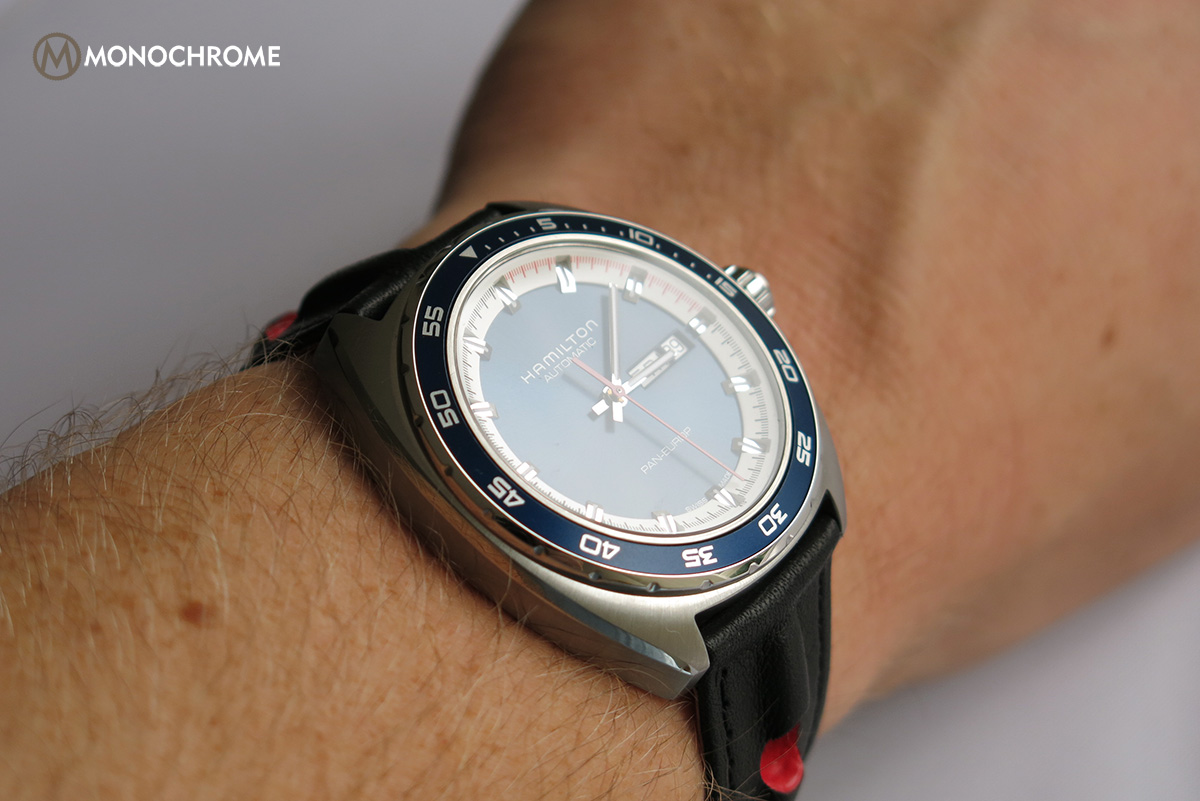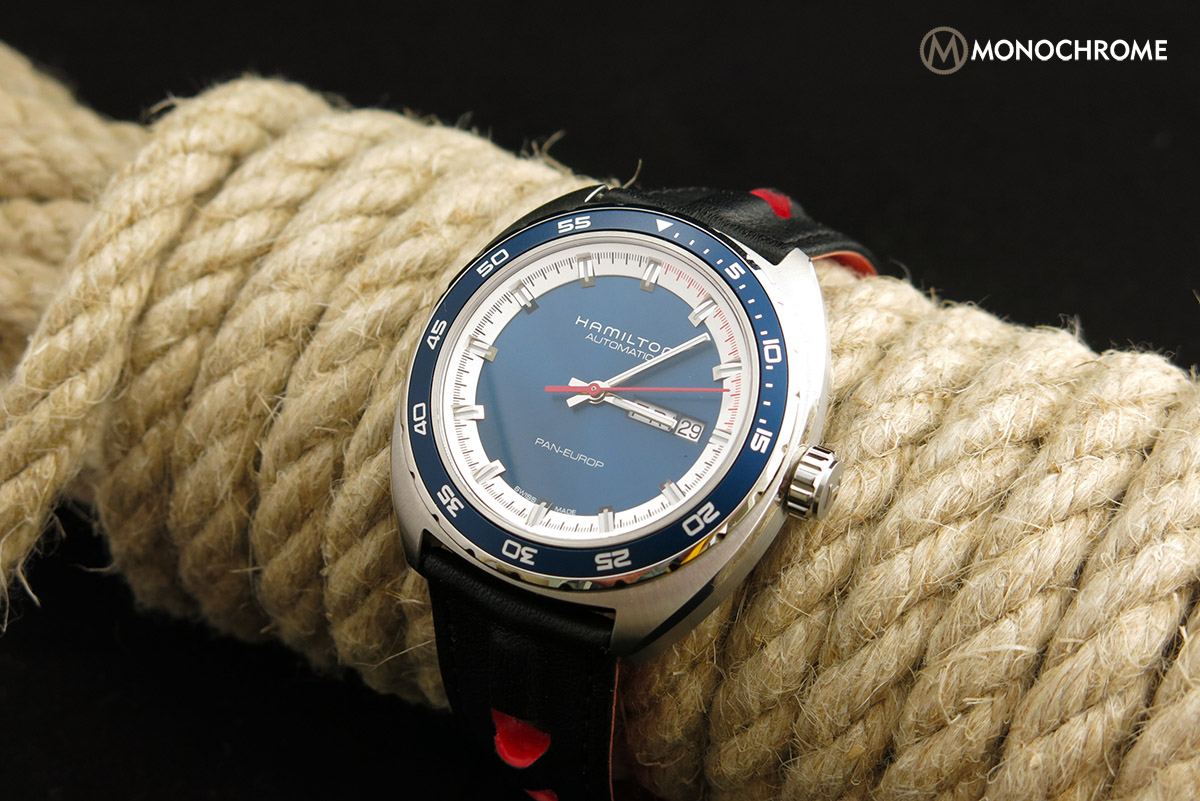 To finish off the dial, Hamilton has opted for slender, inconspicuous markings, only depicting “Hamilton”, “Automatic”, “Pan Europ” and “Swiss Made”.