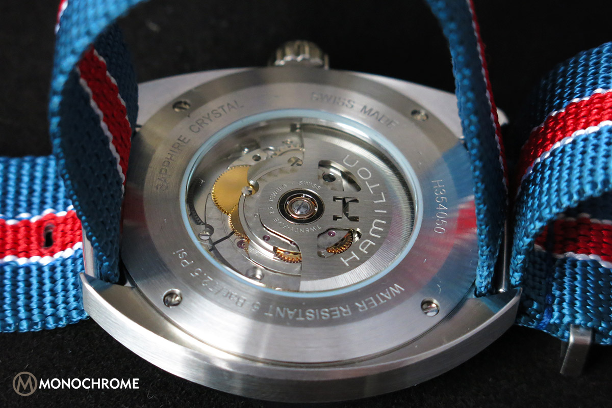 The see-through caseback is a nice addition to the overall presentation. Despite the fact that the original Pan Europ had a closed one and the choice of movement doesn’t exactly make it a necessity, there is always something appealing about being able to see a movement tick. Although not the most handsome movement, the rotor has been customized with an open-worked “H” and “Hamilton”-engraving. It features hours, minutes, seconds, weekday indication and date functionality (both with instant jumps at midnight).