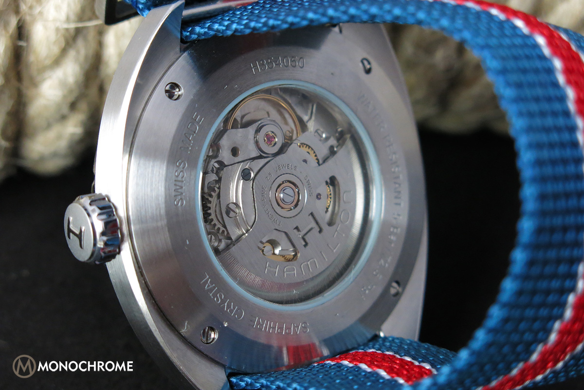 The crown is adorned with polished Hamilton “H” on a brushed surface. The knurled edge of the crown is polished as well. The integrated lugs ensure a tight fit of the strap and curve down for added comfort while wearing. Both on the front and the back, Hamilton opted for a sapphire crystal over the dial and in the screw-down caseback to allow a view onto the movement.