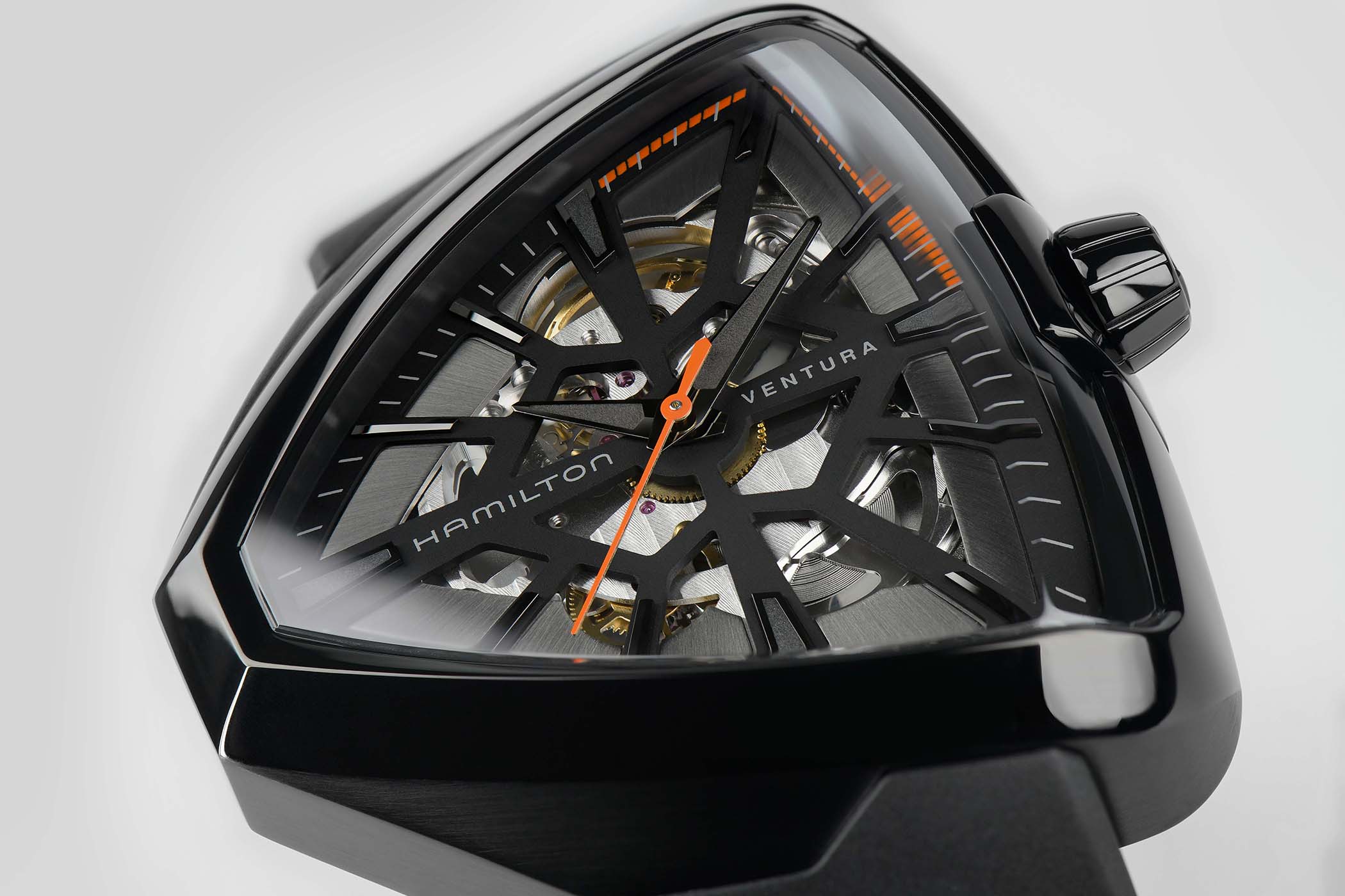 The 316L stainless steel case of the Hamilton Ventura Skeleton Limited Edition retains the iconic form of the 1957 original, but upsizes it to 42.5mm x 44.6mm (although smaller than the Ventura XXL in Men in Black 3). The steel is coated in a glossy black with a spiderweb-themed skeletonized dial, with gunmetal grey applied indices of various size (as they stretch along the web). The hour and minute hands are also grey, while the seconds hand and first 15 seconds of the minute track have an orange hue. A sapphire crystal covers the front and back, showcasing the automatic movement from both sides. A matching black crown sits at 3 o’clock and the case is water resistant to 50 meters.