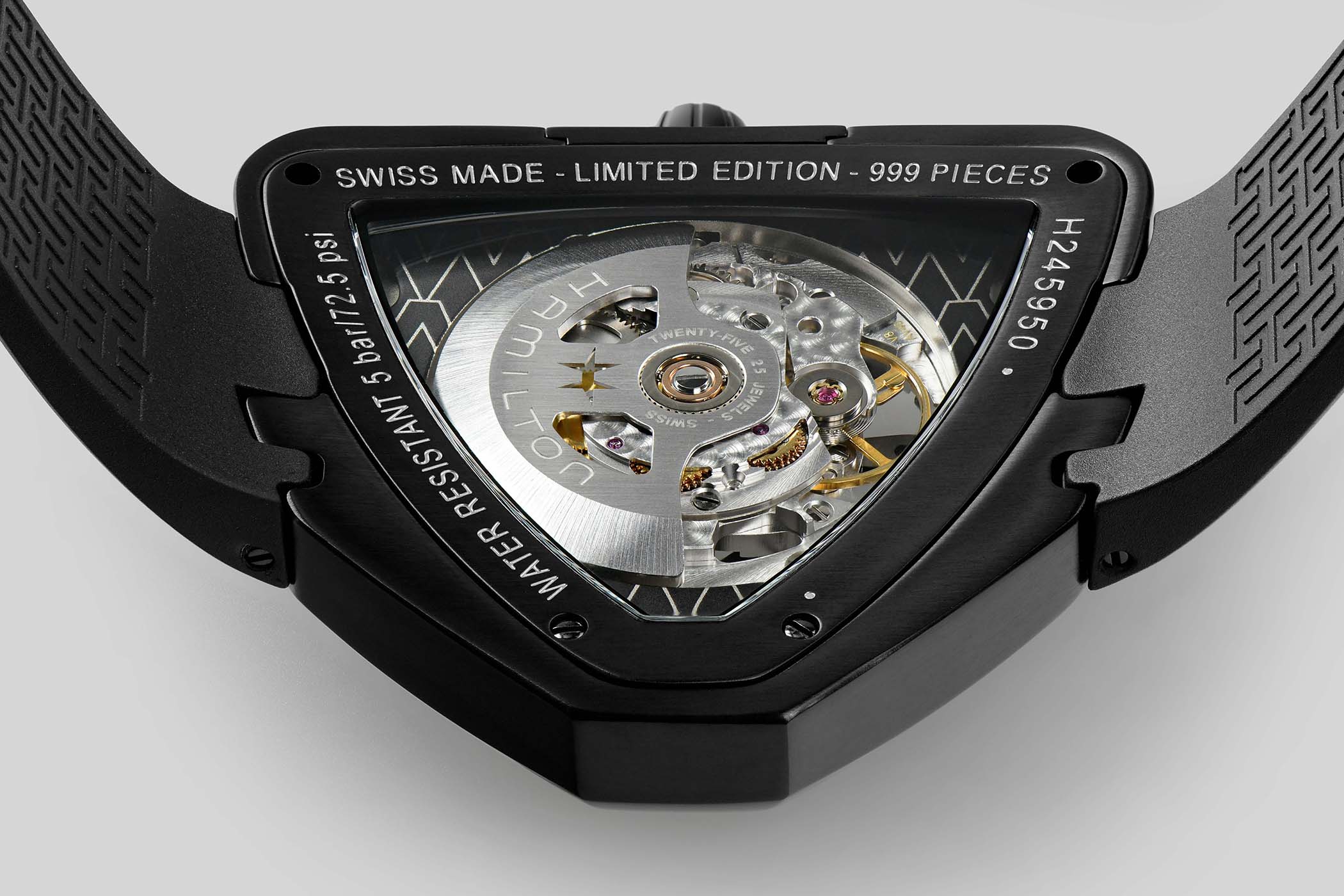 The black rubber strap plugs into the irregular case like a puzzle piece, secured with screws. Hamilton is embossed on the front with a grippy pattern on the underside. The Hamilton Ventura Skeleton Limited Edition is limited to 999 pieces and retails for USD 1,995, CHF 1,995 or EUR 1,990. The watch is available in some outlets with additional availability coming soon. More information can be found at Hamilton’s website.