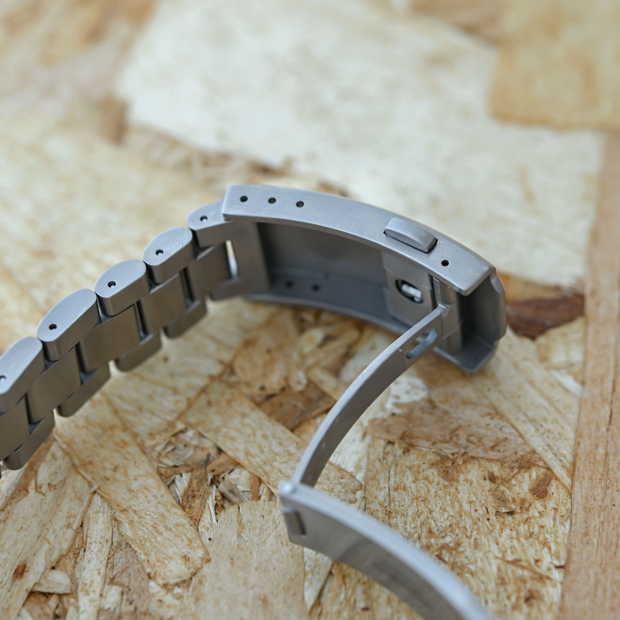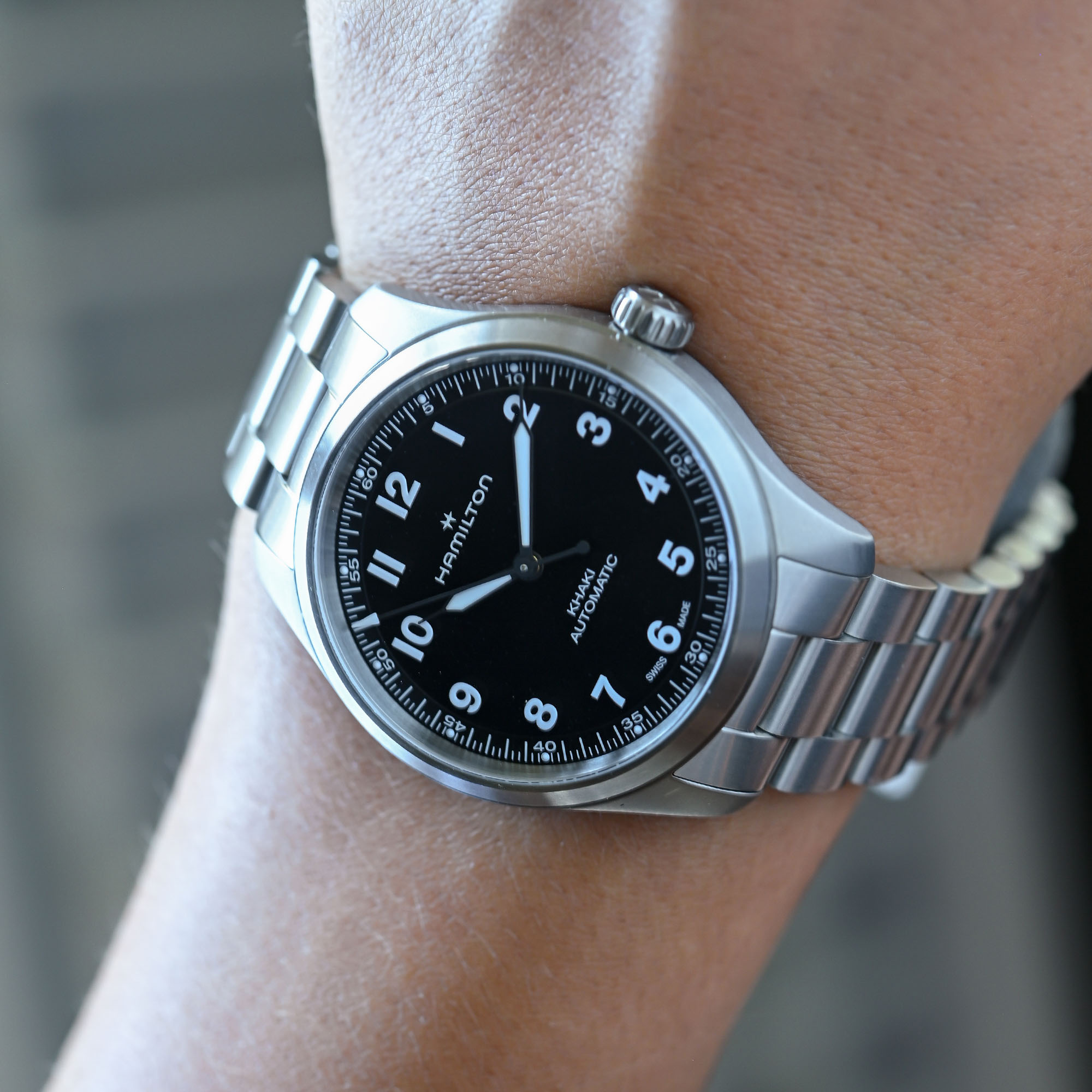 Engineered Garments was started by Japanese designer Daiki Suzuki (not the motorcycle brand), who blends American and Japanese influences in a wide range of garments. His approach with Hamilton was simplicity and authenticity, starting with a titanium case at only 36mm in diameter and 10.8mm in height. Lightweight, discreet and close to the original mid-century field watches. Of course, it’s 2024 and modern requisites like an anti-reflective sapphire crystal and 100 metres of water resistance are present, along with a partial (half-cut) exhibition case back. The 18mm, three-link bracelet is matching titanium with a folding buckle and three micro-adjustments.