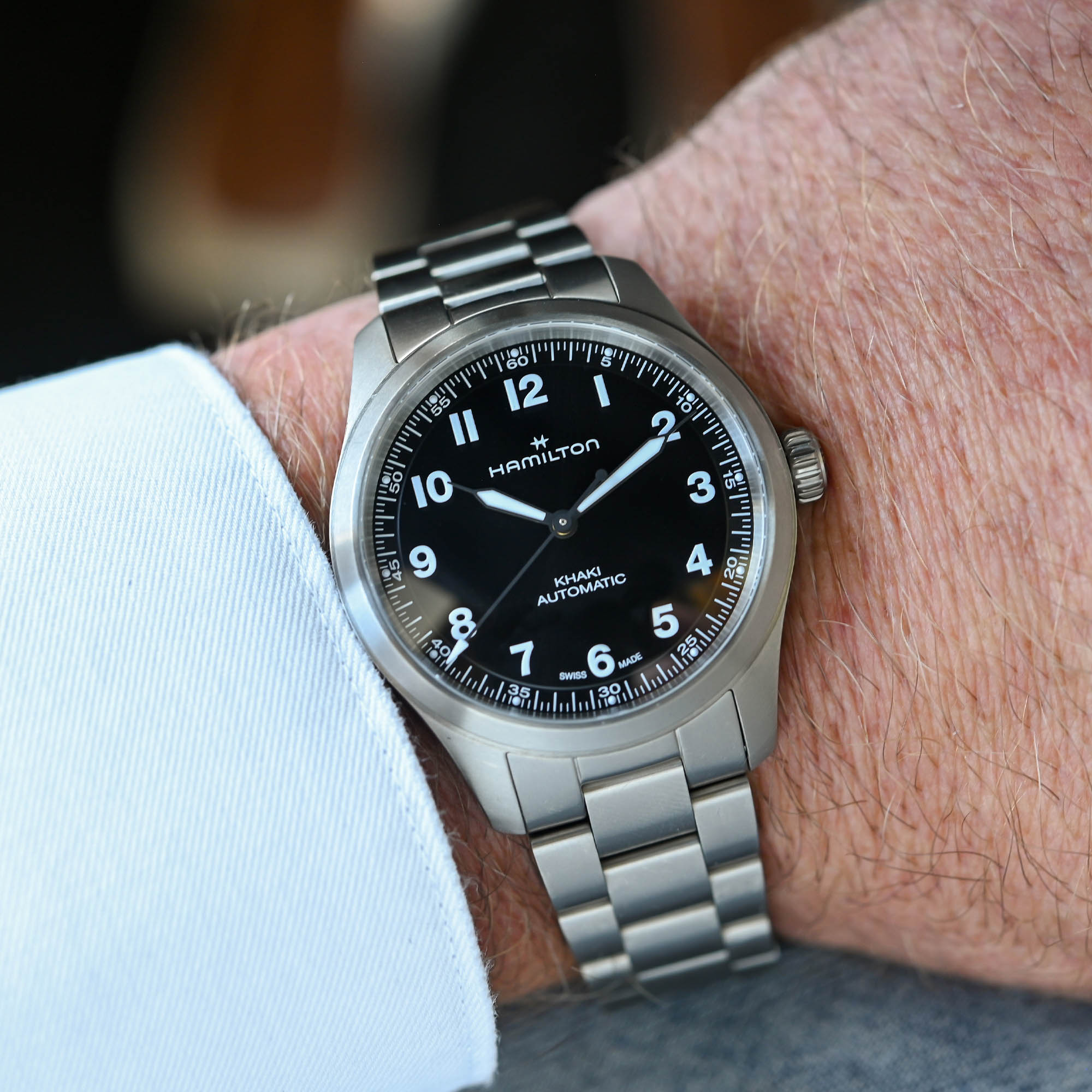 Powering this 36mm Khaki Field Titanium is Hamilton’s H-10 automatic, based on the Powermatic 80 from a modified ETA 2824. It has 25 jewels, beats at 21,600vph (3Hz) and features a sizeable 80-hour power reserve. Functions are limited to central hours, minutes and hacking seconds, and the movement is available with or without a date complication, so it’s not hidden here.