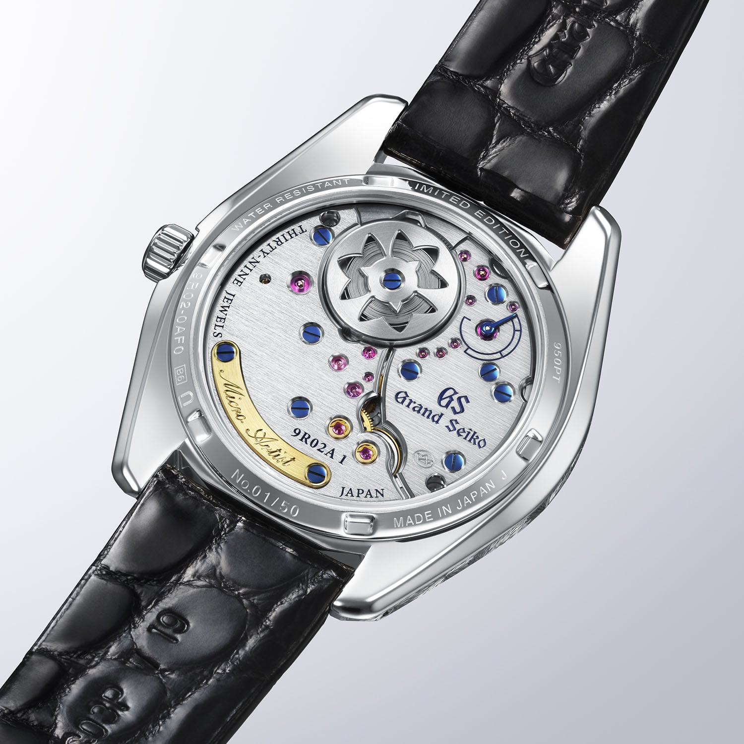 As indicated by the plaque on the dial, this luxurious platinum edition is powered by the finely executed manual-winding Spring Drive calibre 9R02 – the thinnest Spring Drive movement to date. Developed as an ultra-high-end movement for Micro Artist Studio creations, the slim 4mm calibre merges the precision of quartz regulation with the beauty and perpetuity of a mechanical calibre. The dual mainspring structure and torque-return system result in an outstanding 84-hour power reserve (the power reserve indicator is featured on the caseback). The movement is decorated with hand-finished bridges, brightly polished bevels, and fine hairline finishes, and features an openworked bellflower (the symbol of Shiojiri) over the barrel and a gold plaque engraved with “Micro Artist”.