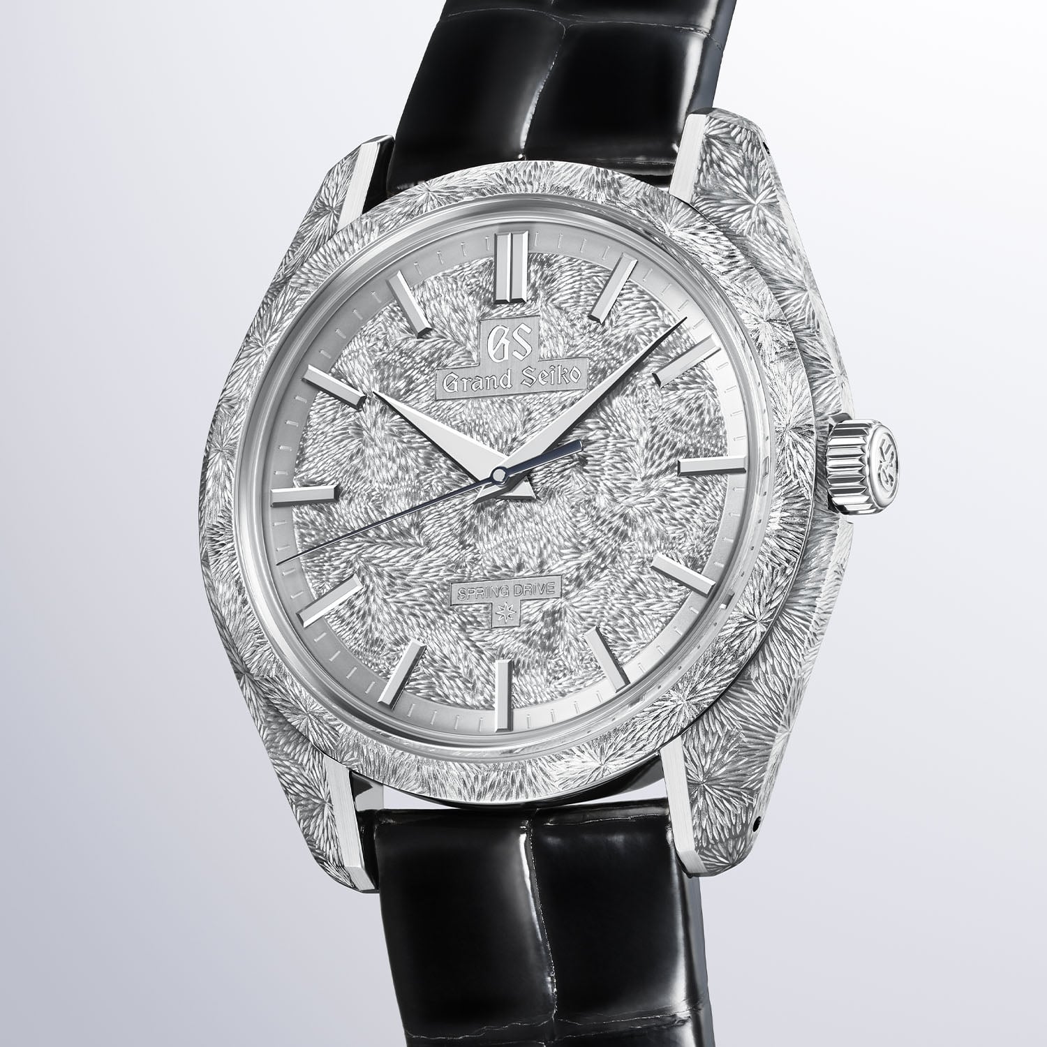 The case selected for this 15-piece platinum limited edition is the brand’s iconic 44GS. Released in 1967, the 44GS came to define Grand Seiko’s “Grammar of Design” with powerful angles, broad flat surfaces and gleaming Zaratsu-polished reflections. The new watch, with a 40mm diameter and a slim 9.6mm profile, is hand-engraved with small indentations to recreate the sensation of flowing water. Highlighting its angular lugs, the innermost surfaces are Zaratsu polished.