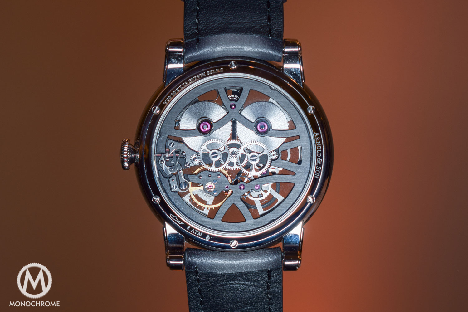 As you can see from the photos the A&S5101 is fully skeletonized. Hold it up to the light and you can clearly see through from one side to the other. On the wrist though, it’s another matter altogether. Typically speaking one of the obvious drawbacks with skeletonized watches is that, depending on how hairy the wrist underneath, they don’t always look that attractive on. That’s the reason why Arnold & Son put a smoked sapphire crystal back on its much-adored Time Pyramid back in 2015. With the Nebula however there’s no such issue. Although it’s obvious on or off the wrist that this is a skeletonized movement, the well-thought out design means that when it’s on the wrist you can barely see any of the skin beneath. A minor detail perhaps but one that makes a pretty major difference in our humble opinion.