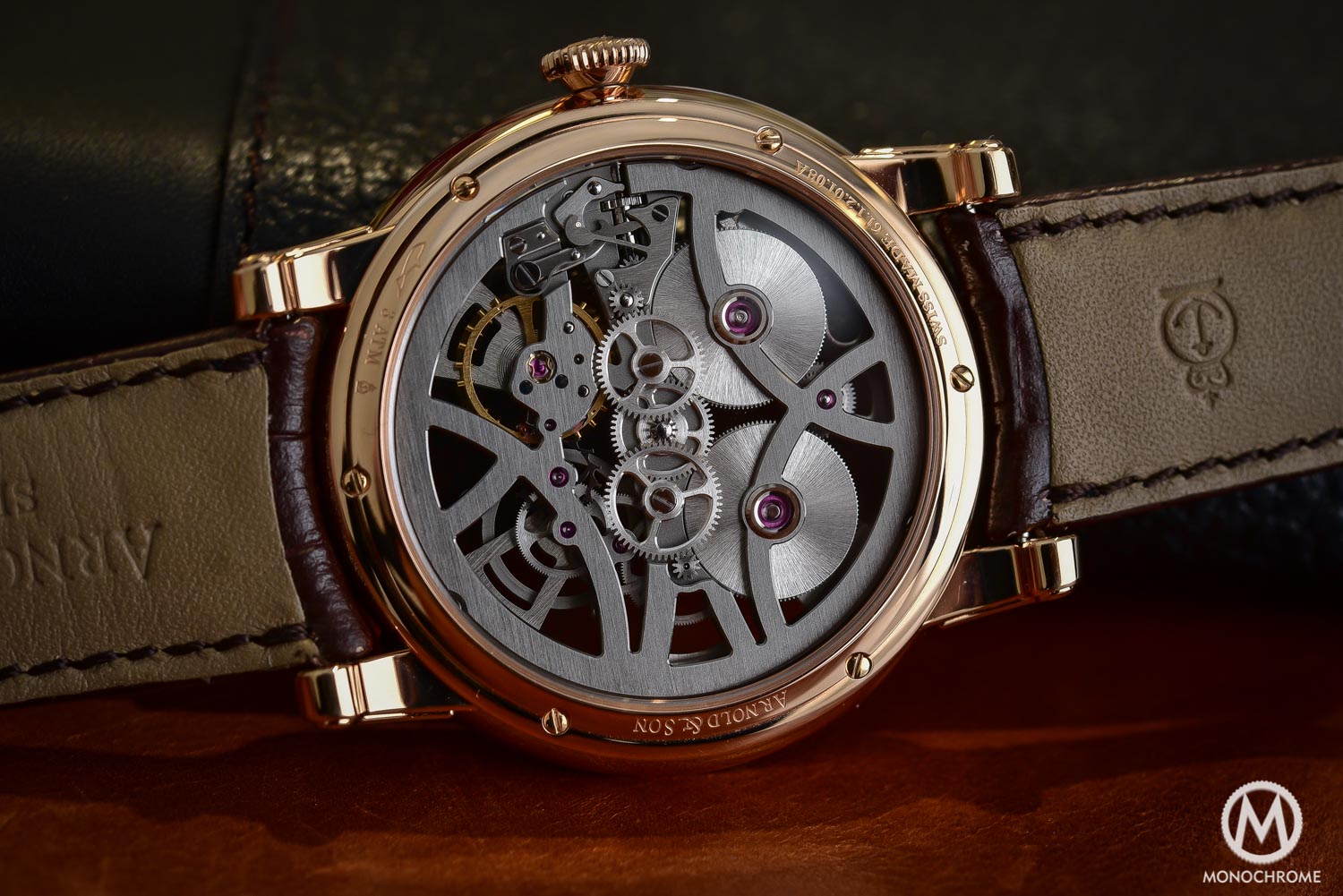 - Movement: Manufacture Arnold & Son calibre A&S5101, fully skeletonized and symmetrical, hand-wound, 24 jewels, two mainspring barrels, screwed balance wheel, power reserve 90 h, 21,600 vph (3Hz), adjusted to 5 position.