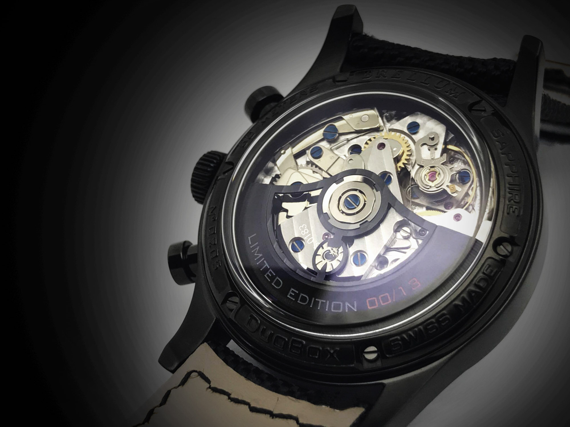 One of the other specificities of this limited edition is its movement, the calibre BR-750-PR. Like the other Duobox Chronograph, it is based on the tried-and-tested Valjoux 7750, but with the addition of a power reserve indication. The rotor is presented in black and bears the individual limited edition number. It is the second time that Sébastien Muller presents a limited edition with this movement displaying the power reserve.