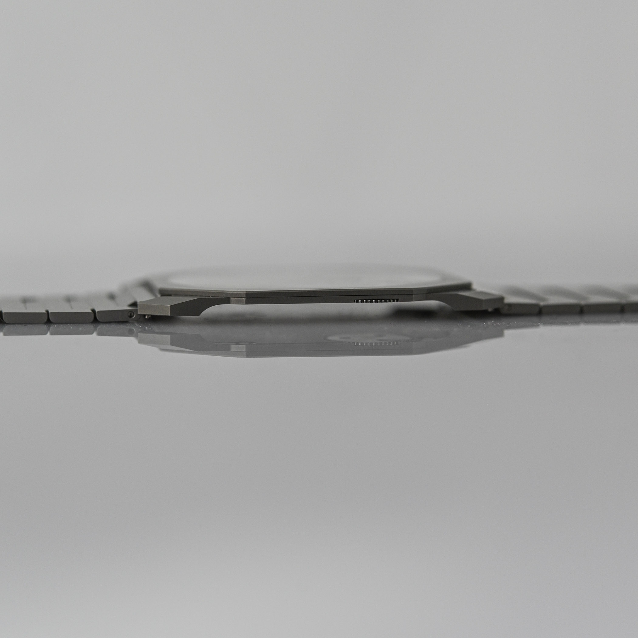 To become thin enough to reclaim the record, the shape of the bezel, crystal, dials, and barrel of the Bulgari Octo Finissimo Ultra COSC have been reworked. So, there is no revolution in the watch structure; overall, it feels very familiar. The same materials are used: tungsten carbide for the mainplate and titanium for the lugs, bezel, middle case and bracelet. It has the same monochrome grey finish although the hours and minutes dials are more contrasted. One change, though, is that the ratchet features a geometric pattern instead of the QR code engraving. The QR code has been replaced by a miniaturized Datamatrix on the back of the watch; it provides access to all the data relating to the watch and invites you on a personal journey into the Bulgari universe.