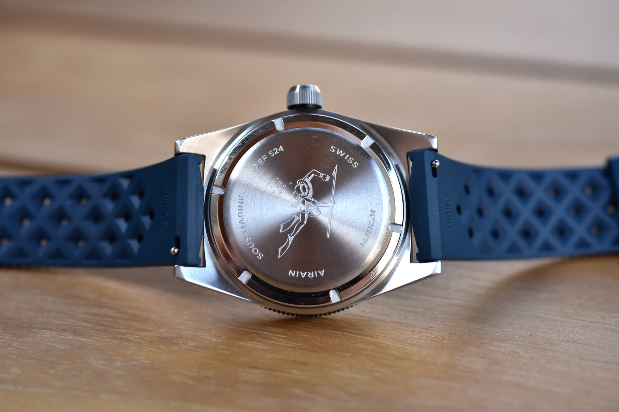 The exterior of the Sous-Marine looks very familiar since this style of watch was quite common in the 1960s. Nevertheless, the stainless steel case feels crisp and is nicely finished, with straight brushing on the sides and circular brushing on the top. The bezel is always finished in black PVD, engraved with a diving scale which is then filled in white. To add a bit of a historic twist, Airain has decided (and the people have voted) to install a Parmentier crown, which means you can unscrew the cap, rotate it and use it to wind the movement (if desired since it’s also done automatically). While the voting showed most people would love to have it with an acrylic crystal instead of sapphire (53% over 47%), the prototyping phase showed that it would not be possible to use an acrylic crystal whilst also retaining the 37.5mm diameter, 10.45mm height (12.77mm with the crystal) and 200m water-resistance. The caseback is decorated with a diver holding a spear, which received a decisive 73% of all the votes.