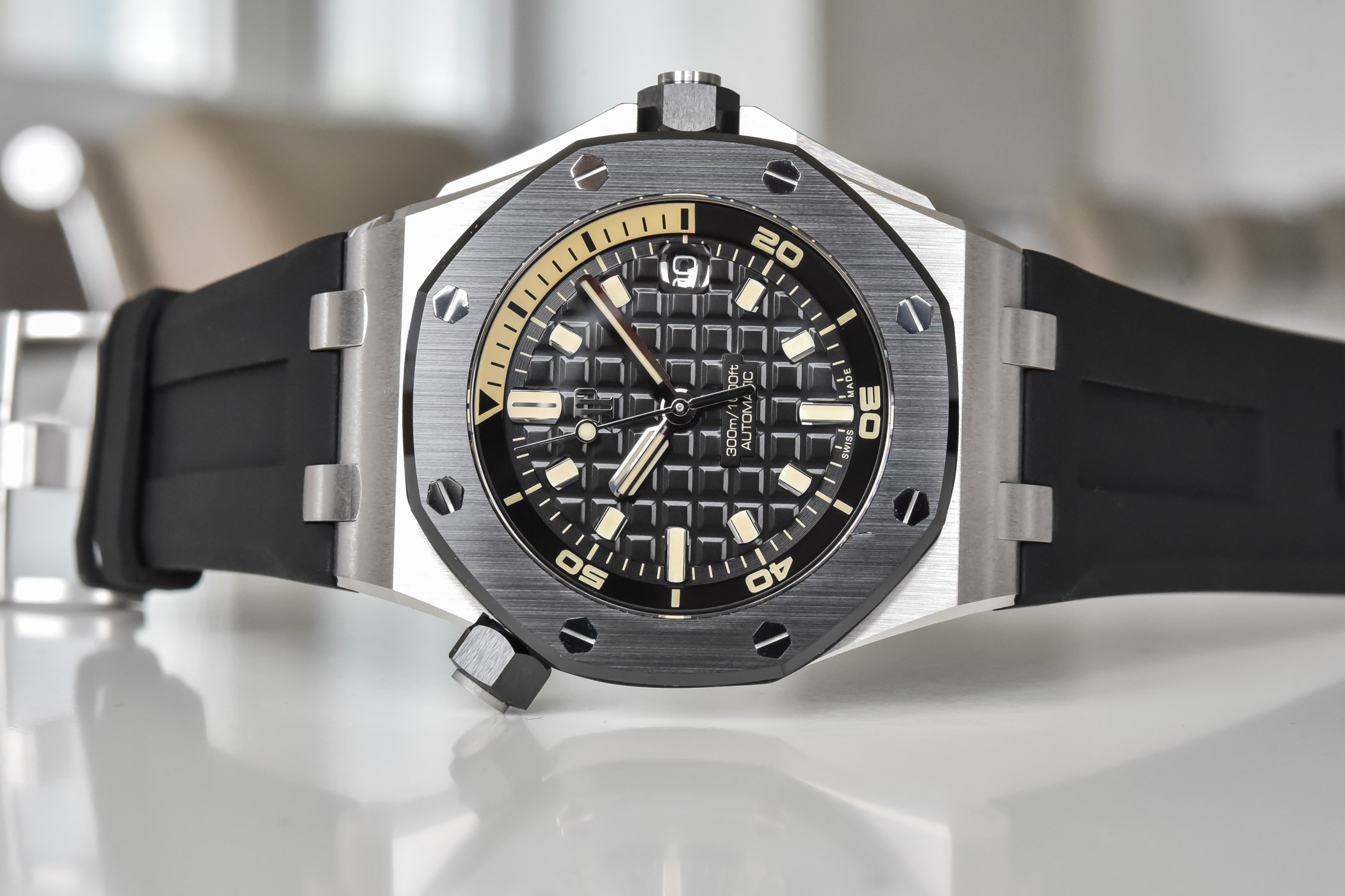 If the name Royal Oak Offshore Diver appeared in 2010, this specific sub-collection was initiated in 2005, with the launch of the Offshore Scuba. Walking in the footsteps of its chronograph sibling, a watch born in 1993 and nicknamed “The Beast”, AP decided to do something a bit more innovative than just creating a 3-hand version of this inaugural watch. So, even if the Offshore Diver had a lot in common regarding the design, it also brought an aquatic theme to the collection, something that was clearly new for AP back in the days. The first generation of stainless steel Royal Oak Offshore Diver (ref. 15703ST) appeared in 2010, followed in 2015 by the second generation of ROO diver (ref. 15710ST), which came with a see-through caseback and minor visual updates.