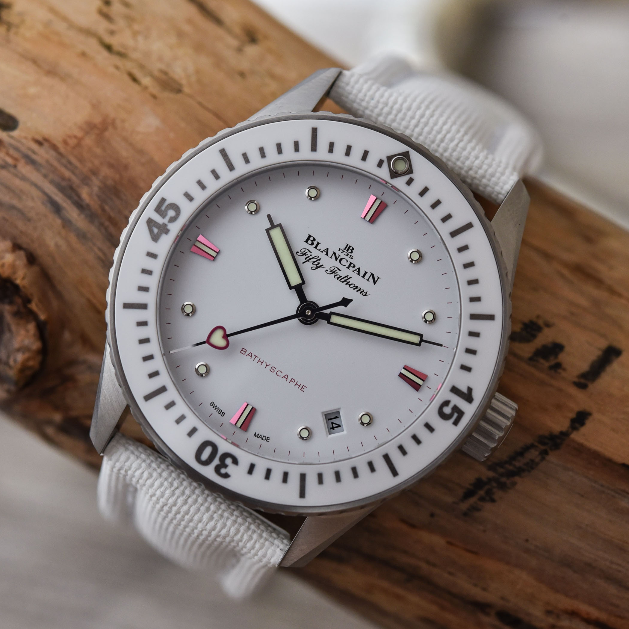 For those who think this goes a bit too far, it would be worth mentioning that there is an unlimited regular production version of this white dial 38mm Bathy without the pink touches and hearts. It’s available well under MSRP at the usual places.