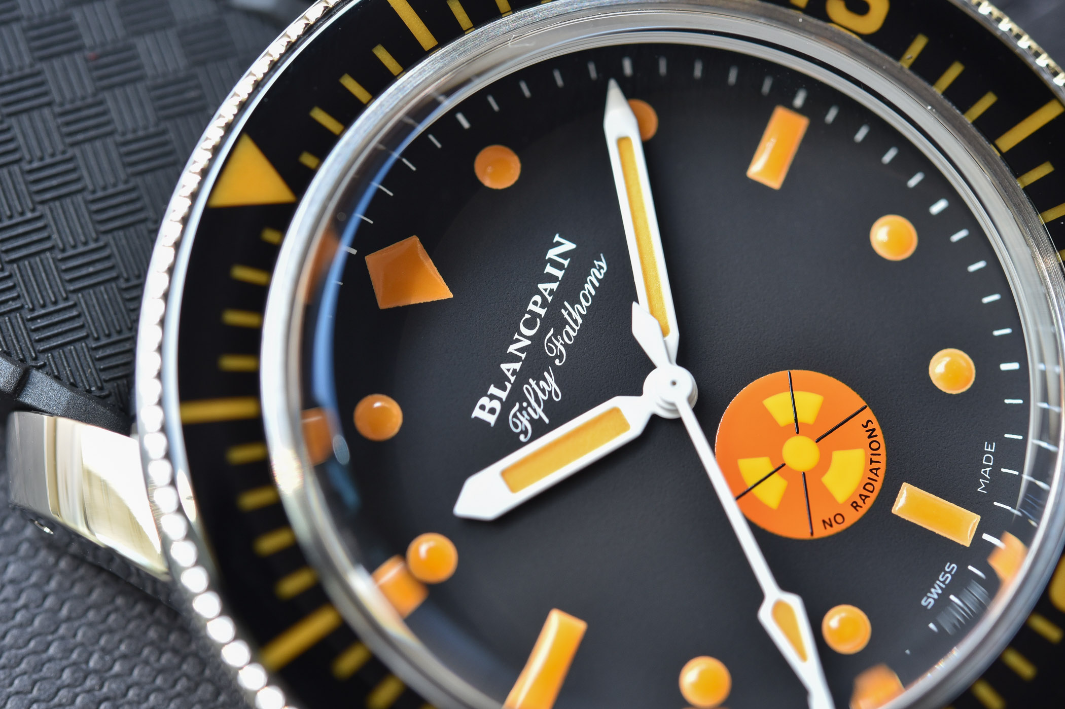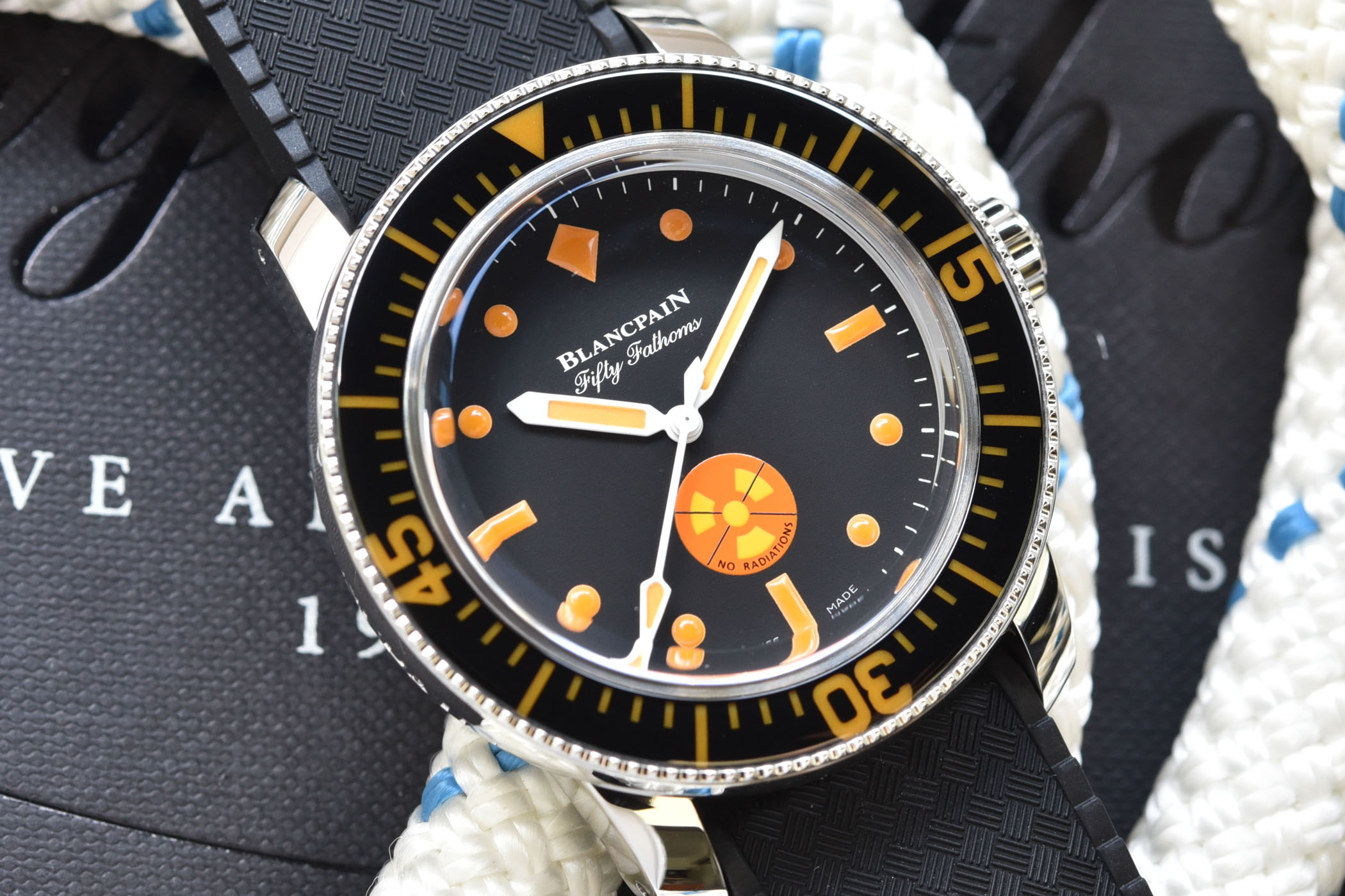 Then, the dial of this Tribute to Fifty Fathoms No Rad for Only Watch 2021 has been slightly modified too. Obviously, orange is found on the markers and the hands. Both have a very different profile than a classic, non-limited Fifty Fathoms watch, as the markers show a combination of dots and rectangles, and are painted on the dial. In the same vein, the hands are white-painted and not polished metal. The other difference in this OW model is the No Rad logo, which now has an orange background with a yellow logo. The matte black base remains identical too, but if you look closely, you’ll see that this unique piece is a no-date watch, while the edition of March 2021 featured a date window at 3 o’clock.