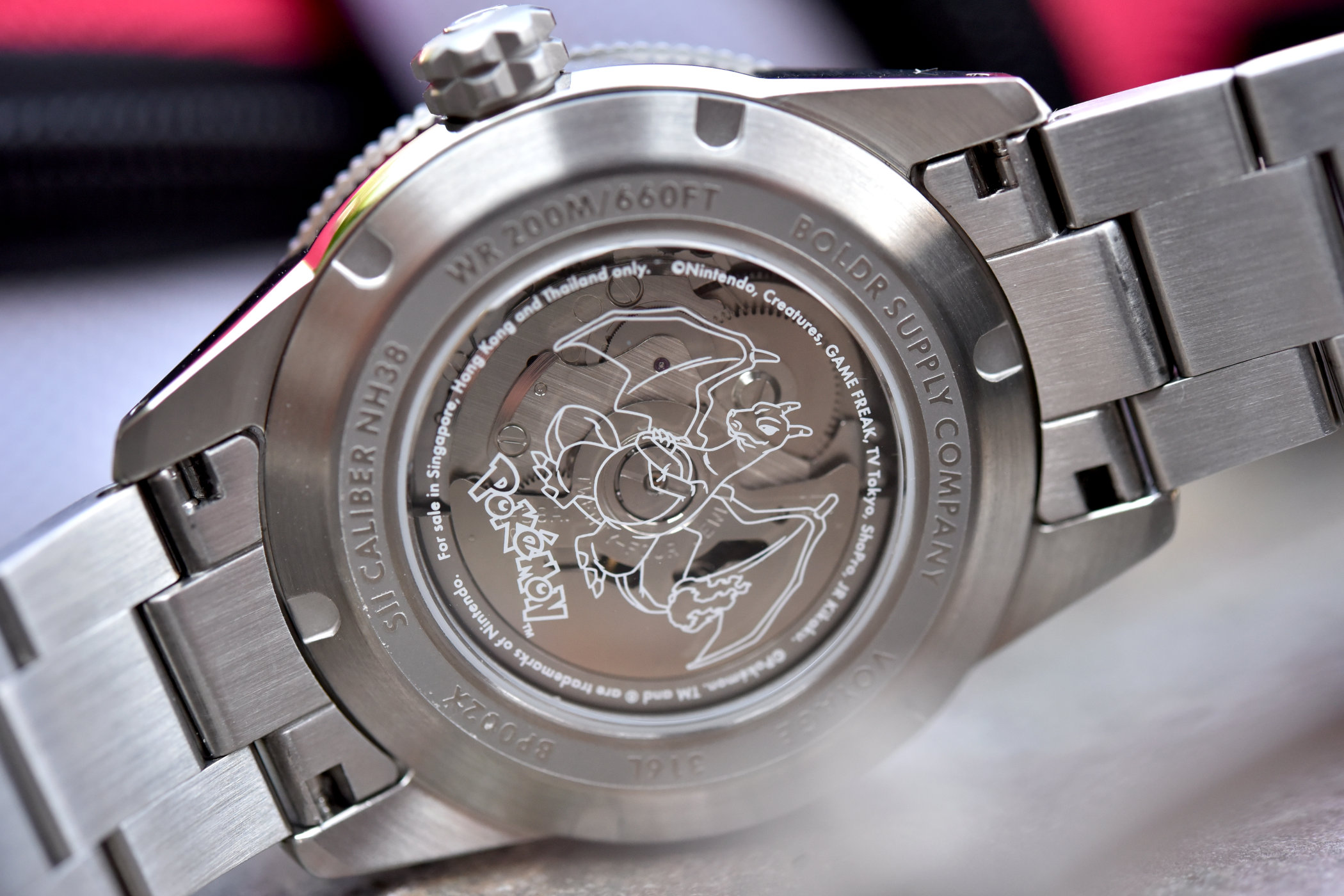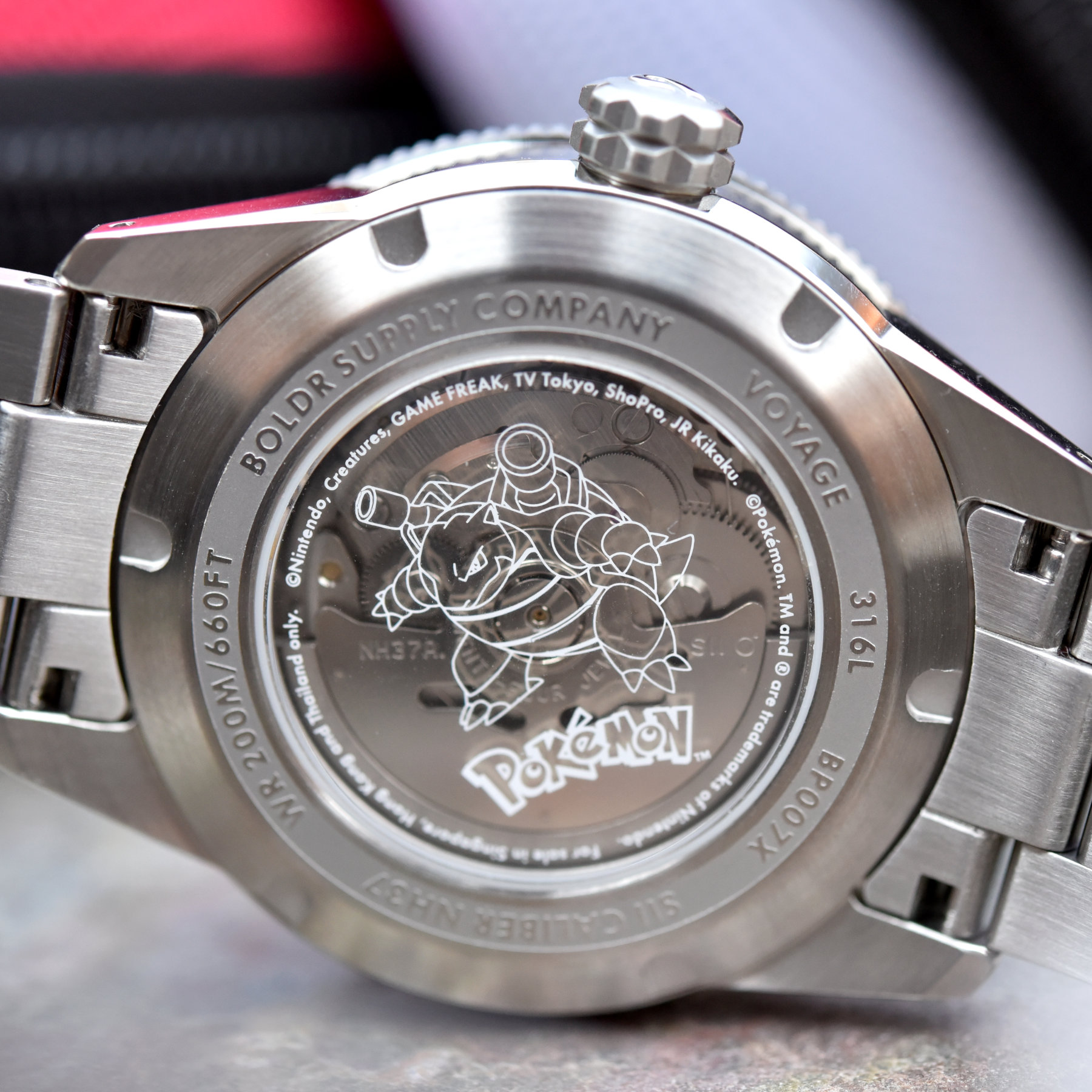 The watches by BOLDR are based on the Voyage collection, a robust and outdoor-oriented watch collection that comes in various styles and colours. Each one differs from the next by colour and specifications, based on four different Pokémon characters. The most well-known one is Pikachu, the little yellow friend of Ash Ketchum, the main character in the series. Pikachu has electric abilities to attack or defend against other Pokémon. Next is Blastoise, a Pokémon with canons on his back that can shoot water on command. Then there’s Charizard, a flying, fire-wielding Pokémon. And lastly, albeit with a meca-quartz movement so of little interest to us, is Venusaur, a grass-type Pokémon that carries a large flower on his back and can shoot vines and leaves and even a solar ray at enemies.