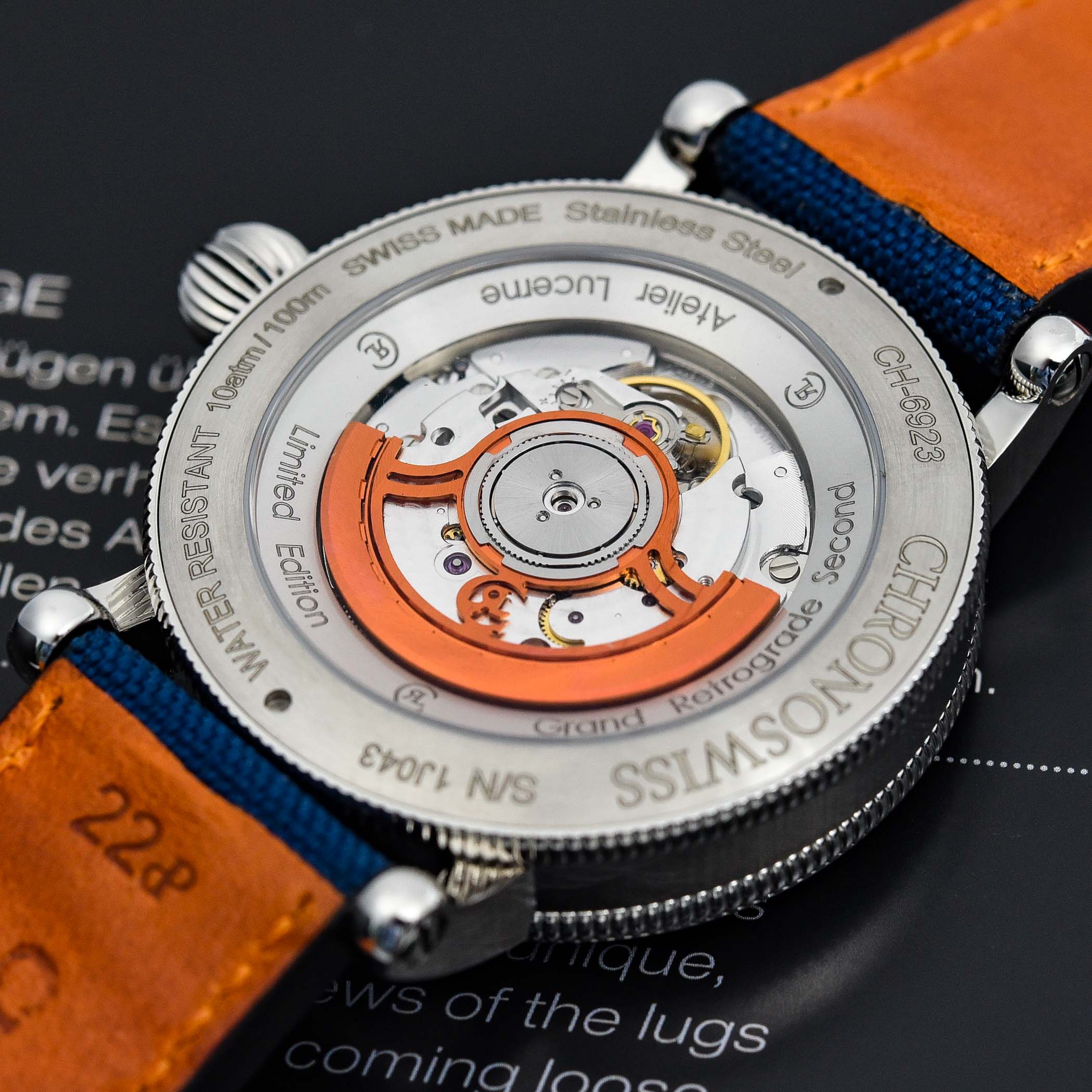 Flip the watch over and the exhibition caseback shows the automatic calibre C. 301. This movement is based on the ETA 2895 with a proprietary regulator and retrograde seconds module. Its frequency is of 4Hz and its power reserve of 42 hours. The hacking second mechanism allows for precise setting of the time. If the decoration is overall traditional (with Geneva stripes and perlage), the skeletonized rotor has been orange-coated.