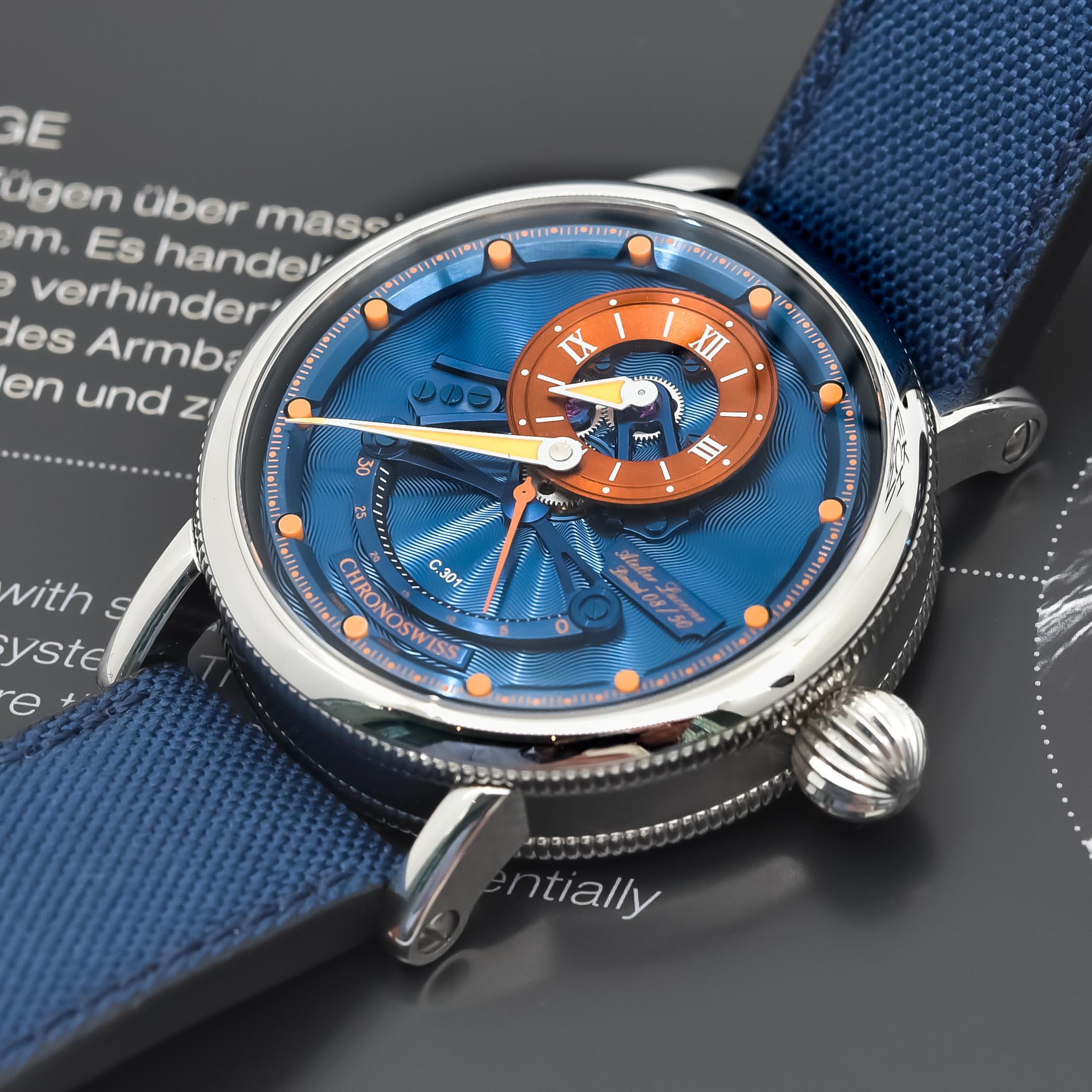 The blue and orange hues of the Kingfisher are achieved via Chemical Vapor deposition. The hand-guilloché dial, funnelled sub-dials and bridges are all CVD-coated to create unique metallic colours. The use of orange luminescent material for the hands and block-shaped indices allows for enhanced readability in all conditions. A small plate at 3 o’clock features the individual limited-edition number of the watch.