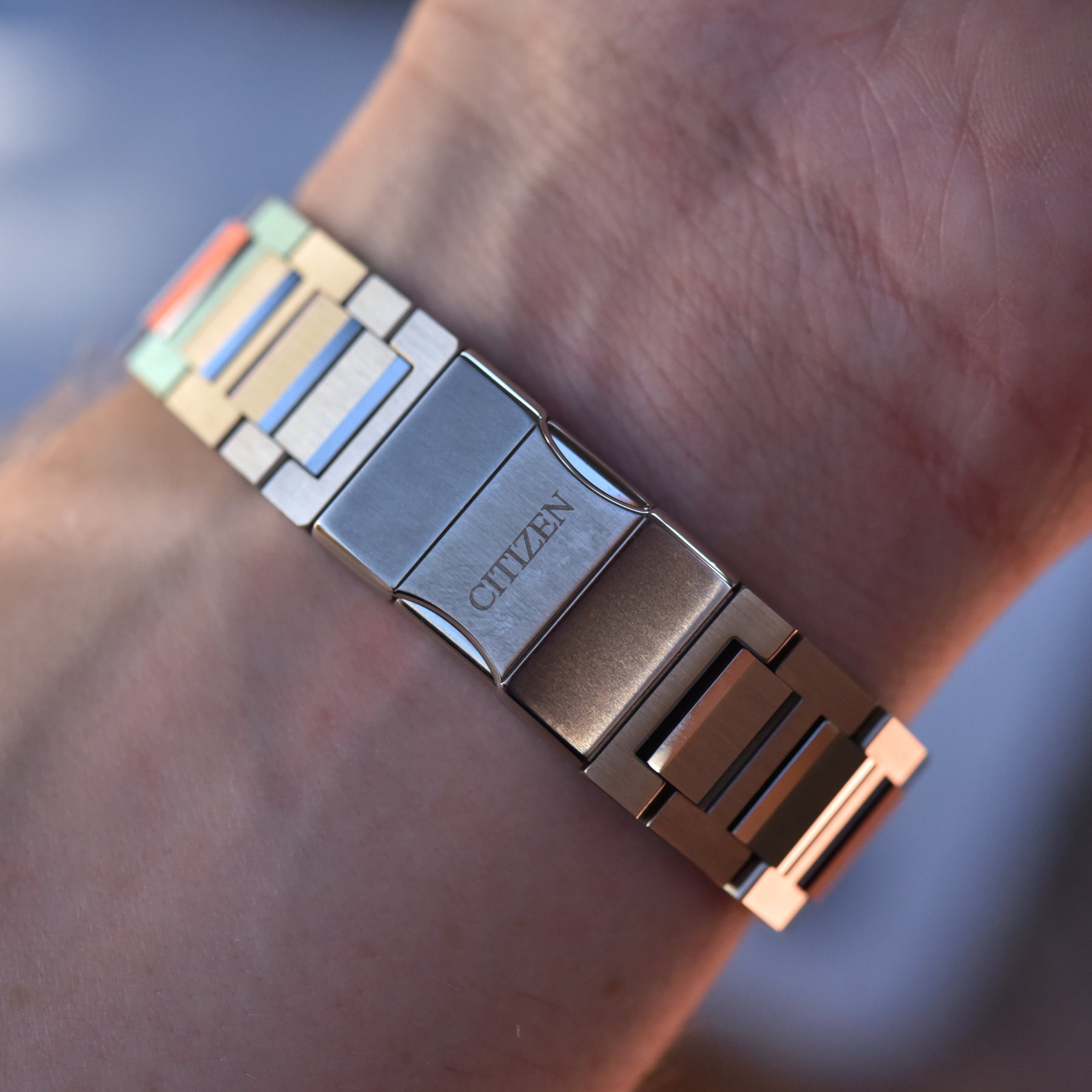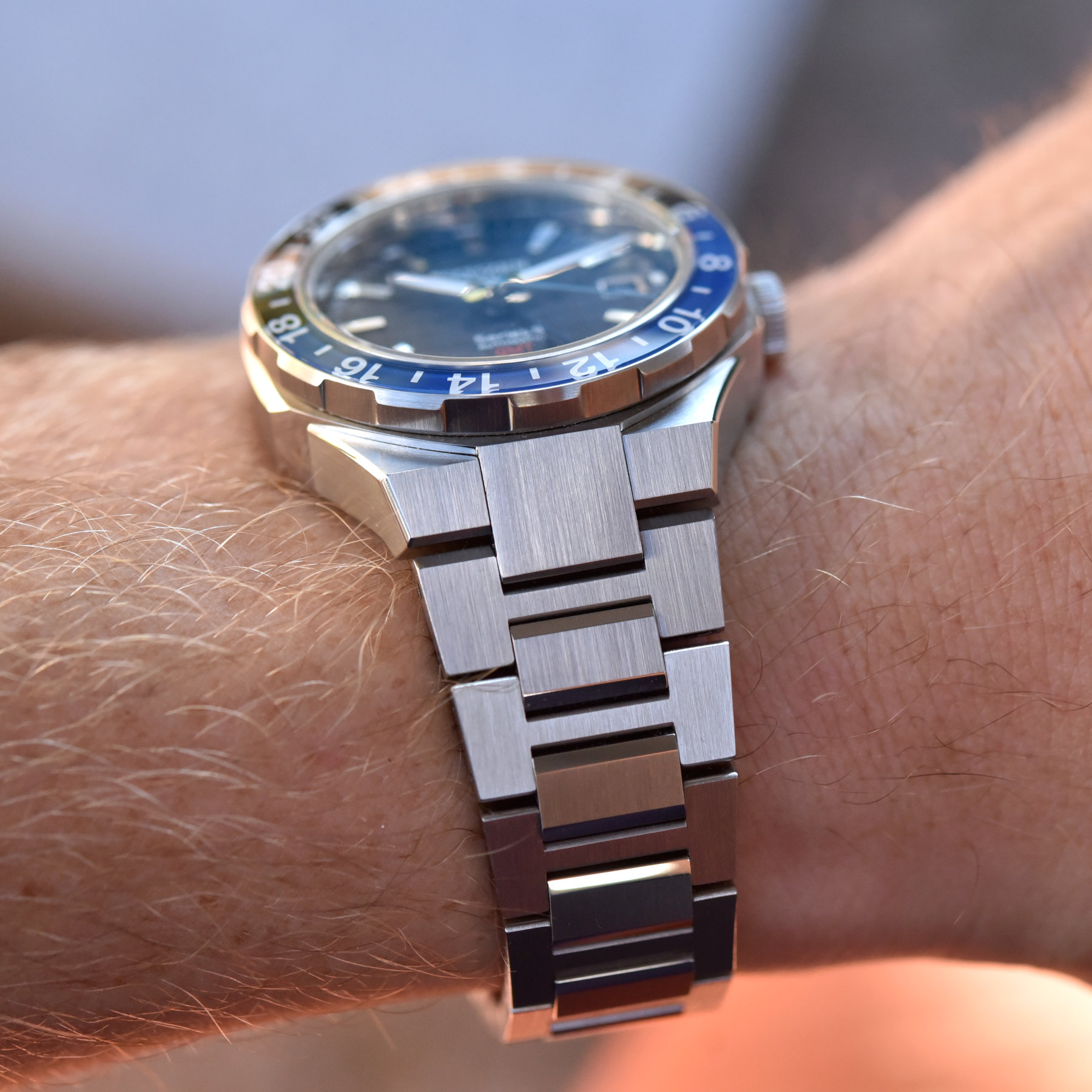 The Citizen Series 8 880 Mechanical GMT is a very well-equipped and robust travel watch. It might be a tad too bulky for some, but it never felt out of balance on my 18.5cm wrist. Thanks to the short and angled lugs, it sits snug and secure. It comes on a solid three-link stainless steel bracelet with a neatly integrated folding clasp. Whereas other brands often use a clasp that adds significant heft and height to a bracelet, this one is much more discreet. It flows with the bracelet’s profile and is easily opened and closed. The inner links are slightly thicker and have a polished edge to them, providing a touch of character.
