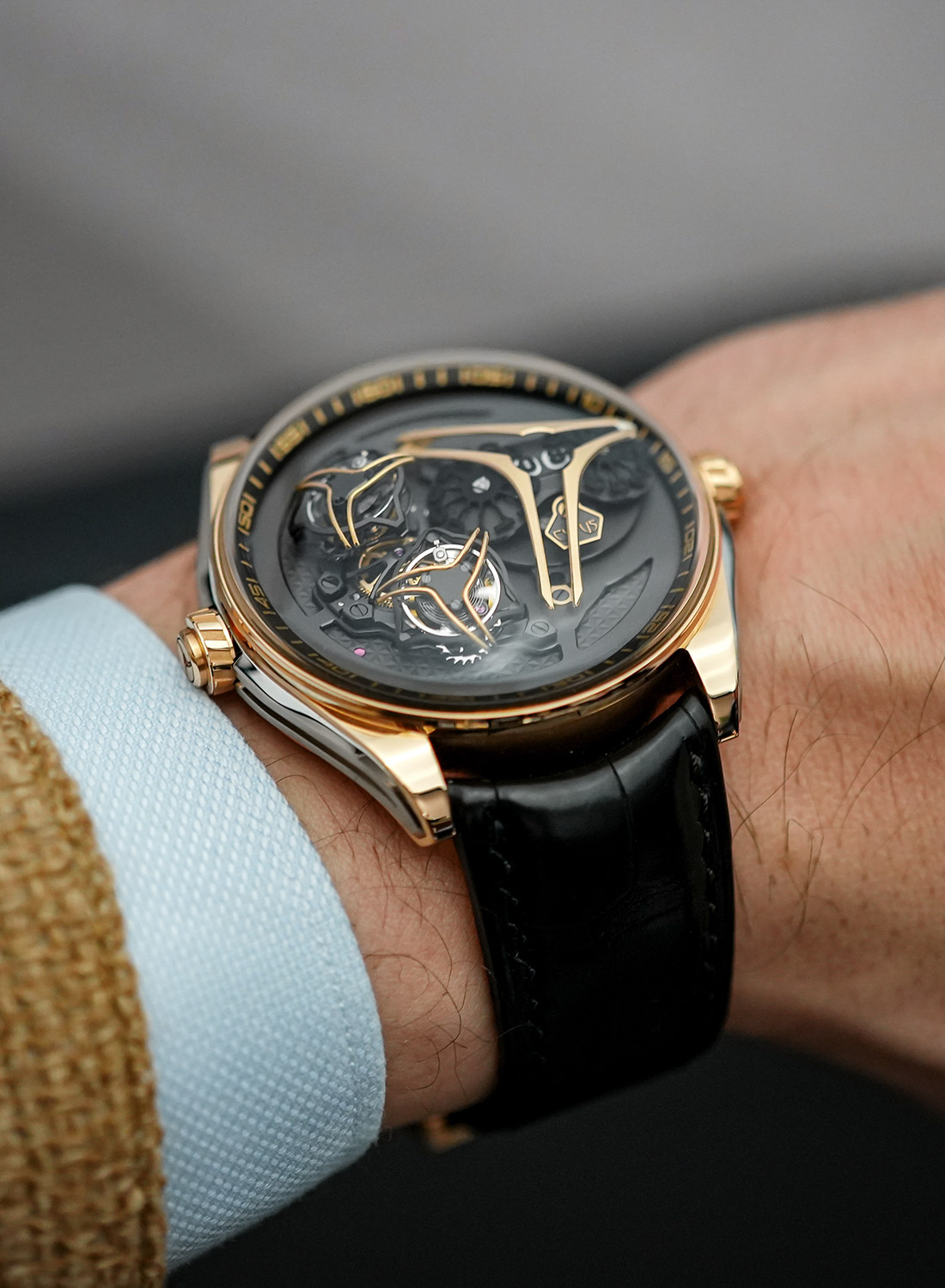 Regarding the timepiece, the project took six years to come to fruition, and the Twin Orbital Tourbillon marks the beginning of the new Etheral collection. It is characterised by complexity for the sake of complexity – a feature that will undoubtedly appeal to Cyrus’s regular clientele. I would ask for a 24-hour jumping display and not 12, yet watches like this prioritise aesthetic and mechanical ingenuity over conventional timekeeping. Nonetheless, they certainly can tell time, albeit uniquely and captivatingly.