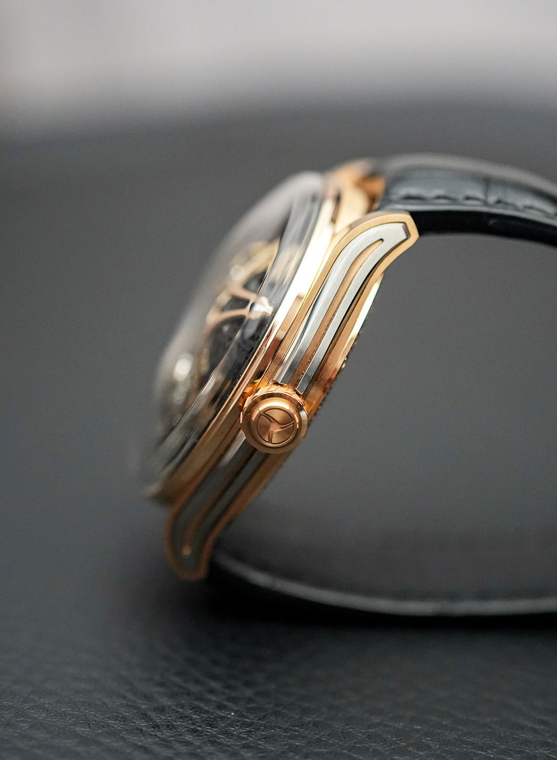 The dial of the Twin Orbital Tourbillon is undoubtedly the focal point of attention, where one immediately notices three helix-shaped elements – notably, excluding the eight customised screws securing the exhibition caseback and the helix logo, a total of eight components in this watch pay homage to the brand’s symbol. Among these elements, the rotating minutes hand stands out with its curved arms and bevelled angles, featuring a gold-plated finish and a white Super-LumiNova tip to indicate the minutes. This hand traverses a black PVD-treated flange, marked with gold-plated double-digit numerals at 5-minute intervals. Additionally, the dial showcases two inclined flying tourbillon cages with helix-shaped, gold-plated bridges rotating clockwise, further adding to the visual dynamic of the timepiece.