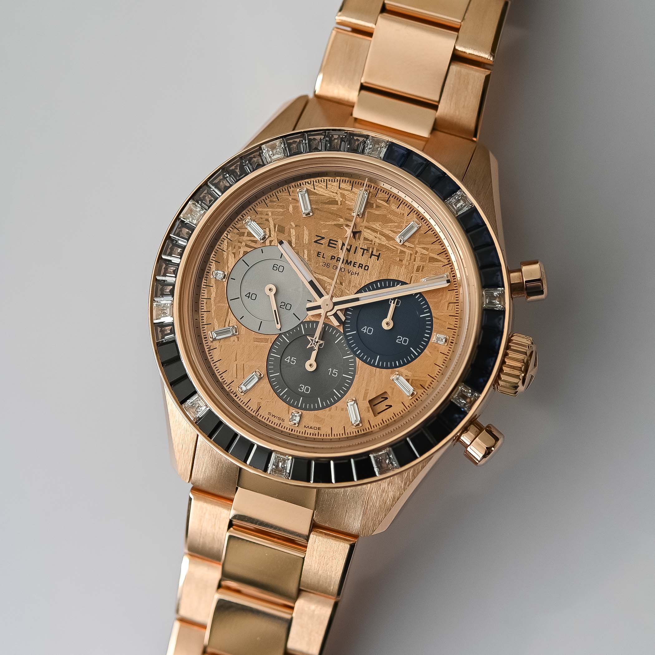 Dazzling above and below deck, Zenith welcomes the first gem-set Chronomaster Sport with a golden meteorite dial.
