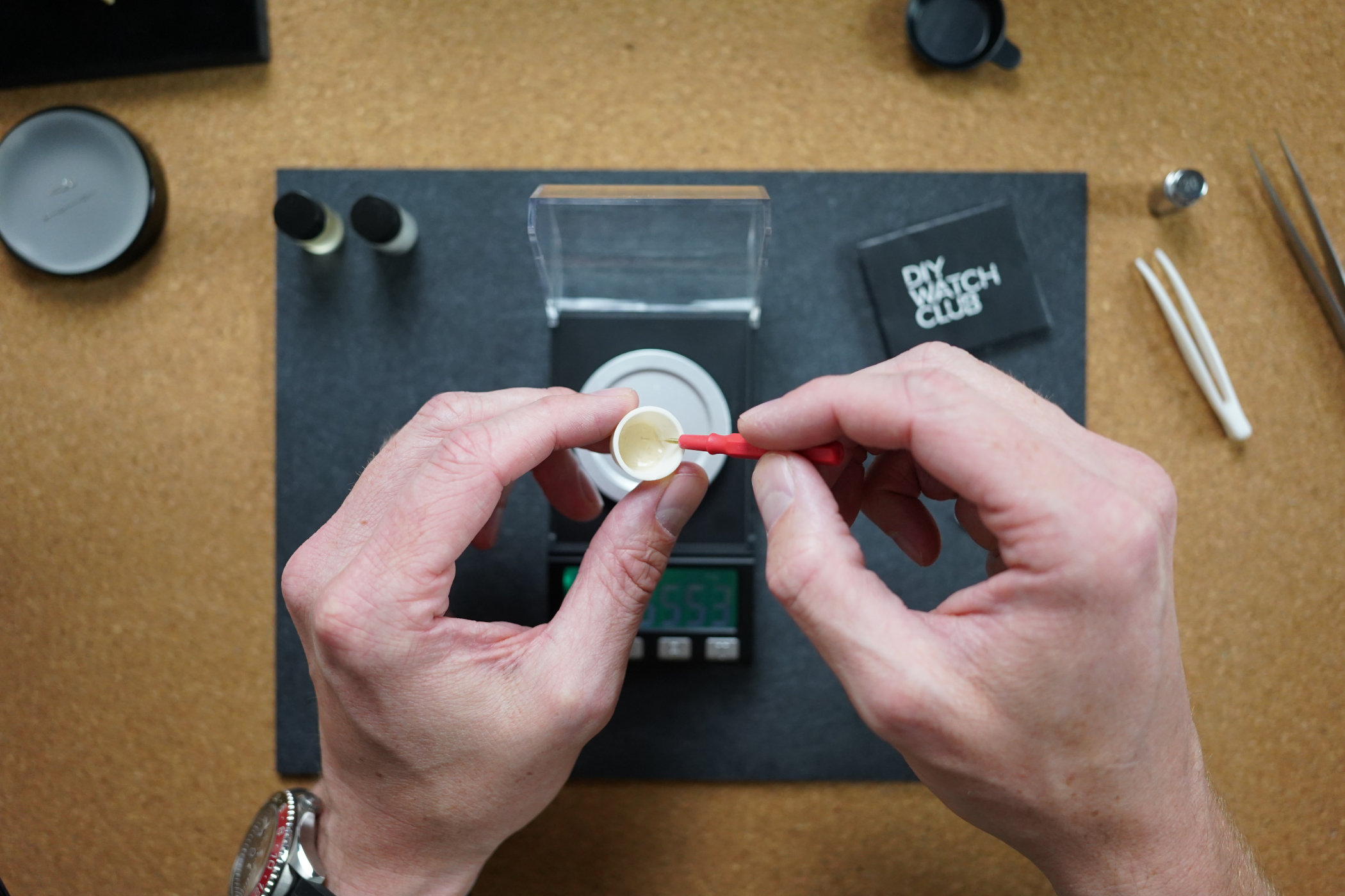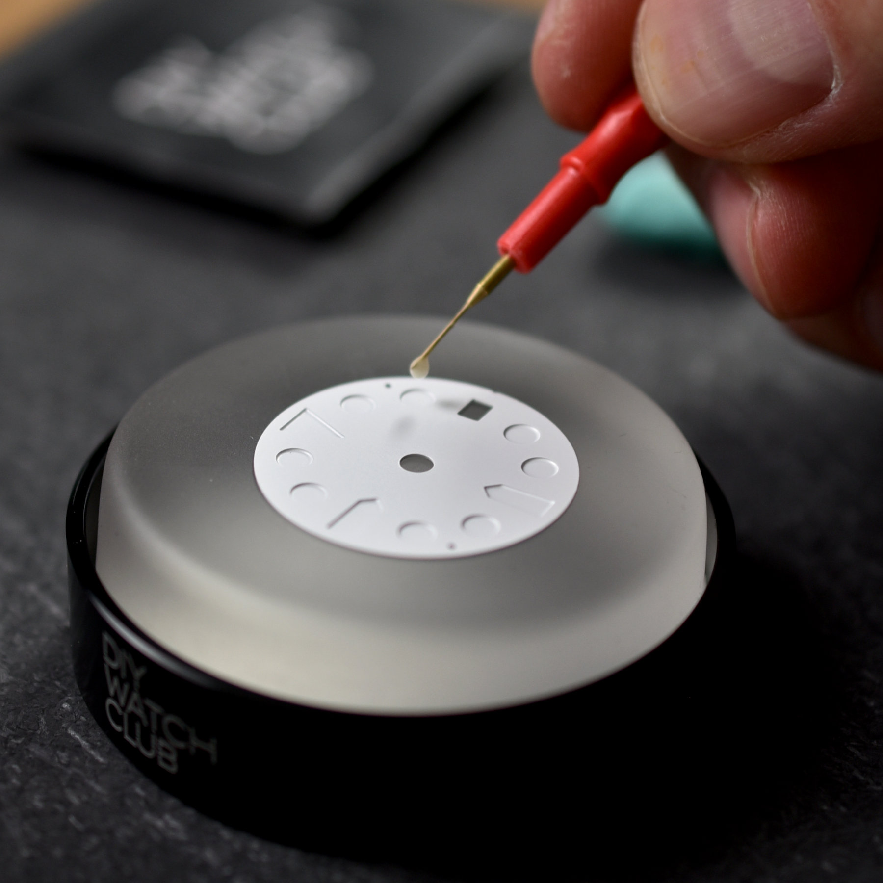 For the luming itself, you have two options: using the pre-mixed bonding agent in the syringe or going full Breaking Bad and mixing your own with the small bottle of binder and paint thinner. DIY Watch Club talks you through what is needed for both and what the benefits are of each method. I went for the simpler solution since it sounded like the safer way of doing things when it’s your first time.