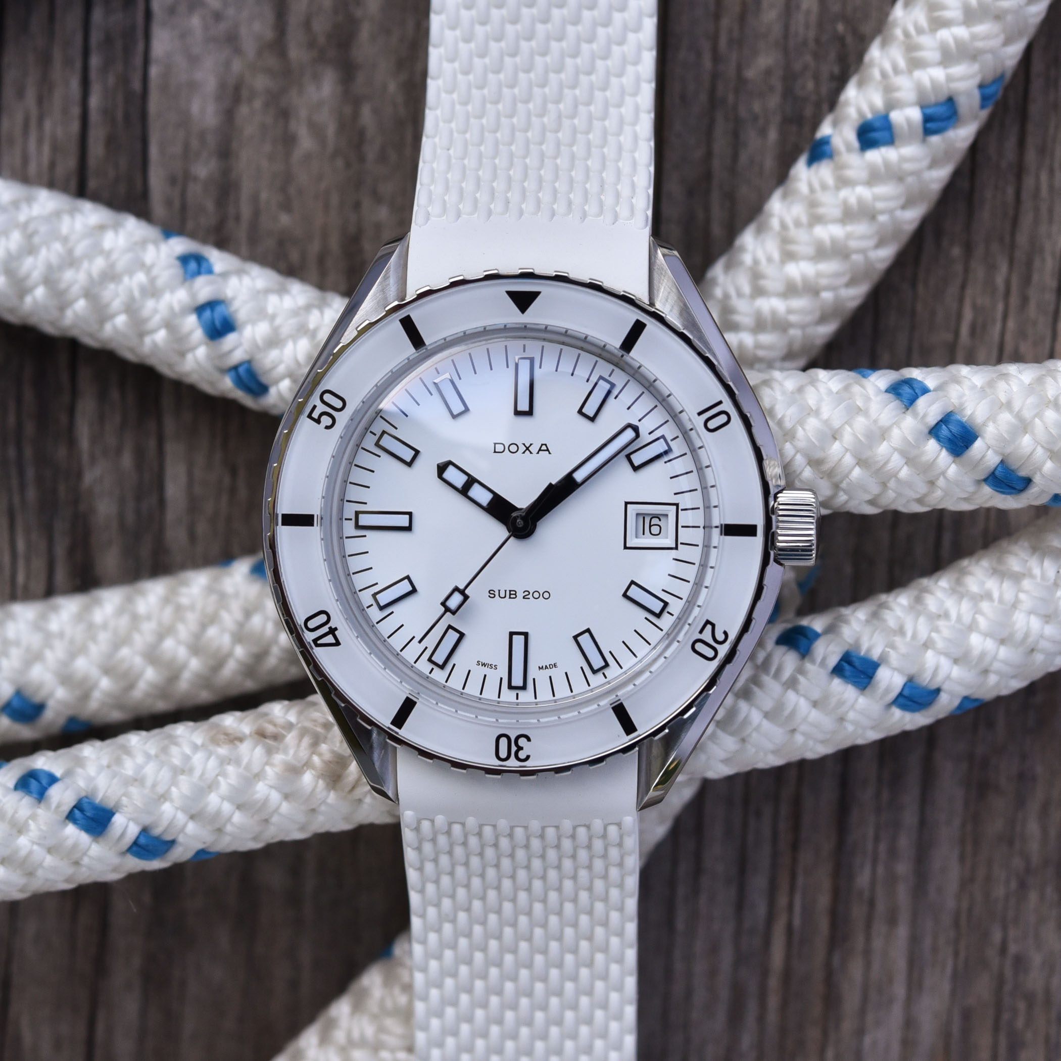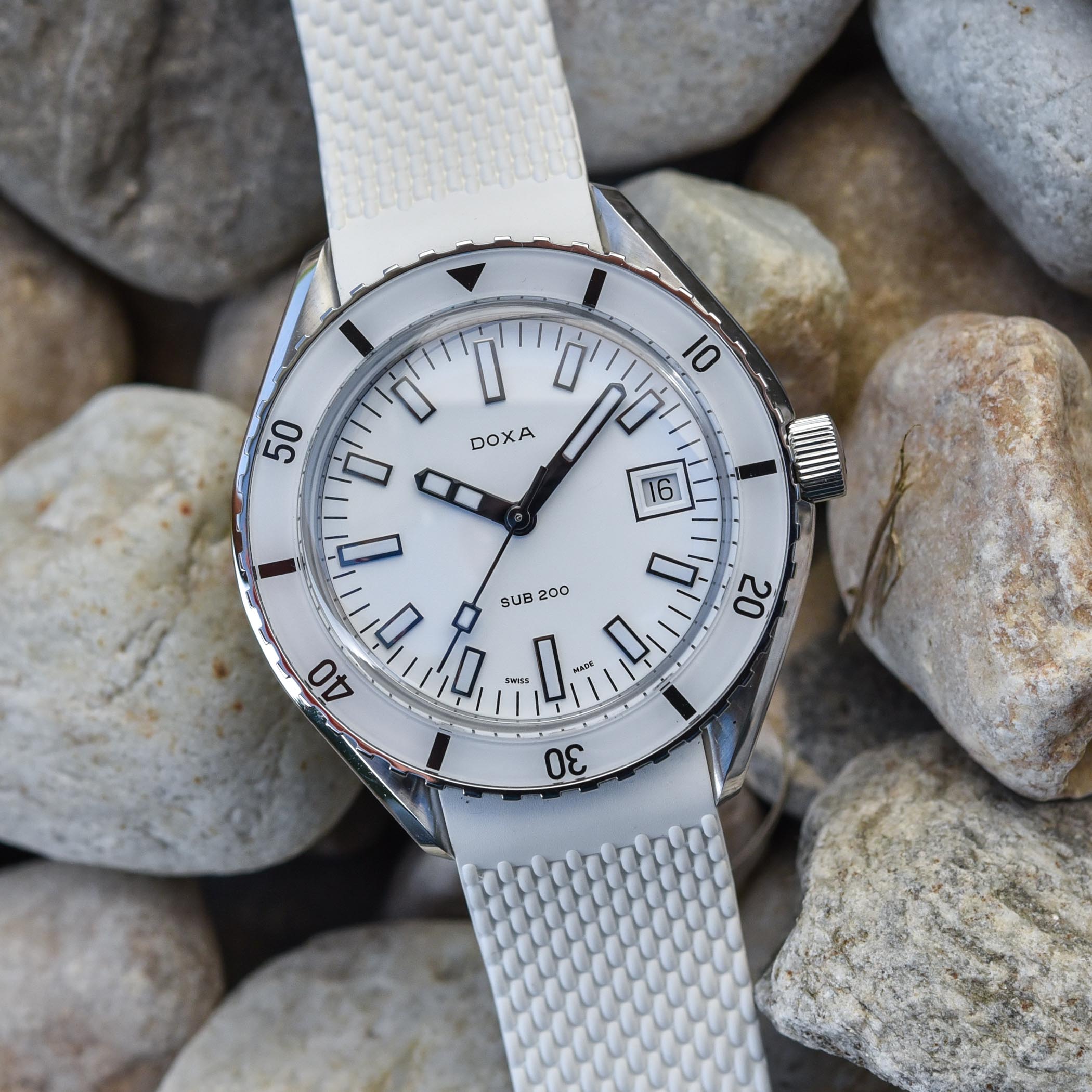 Part of the brand’s signature elements, the recent SUB 300 and SUB 200 collections felt, in a very positive way, like a rainbow. Orange Professional, Silver Searambler, Black Sharkhunter, Navy Caribbean, Yellow Divingstar and Turquoise Aquamarine were at the centre of the brand’s distinctive look. But what happens when, in optics, you combine all the colours of the rainbow? You have white. And here’s the 7th colour in the Doxa SUB 200 collection, with the new Whitepearl model… a very, very white watch. (ps. Doxa, you could even add an 8th colour to your portfolio, with a green dial…)