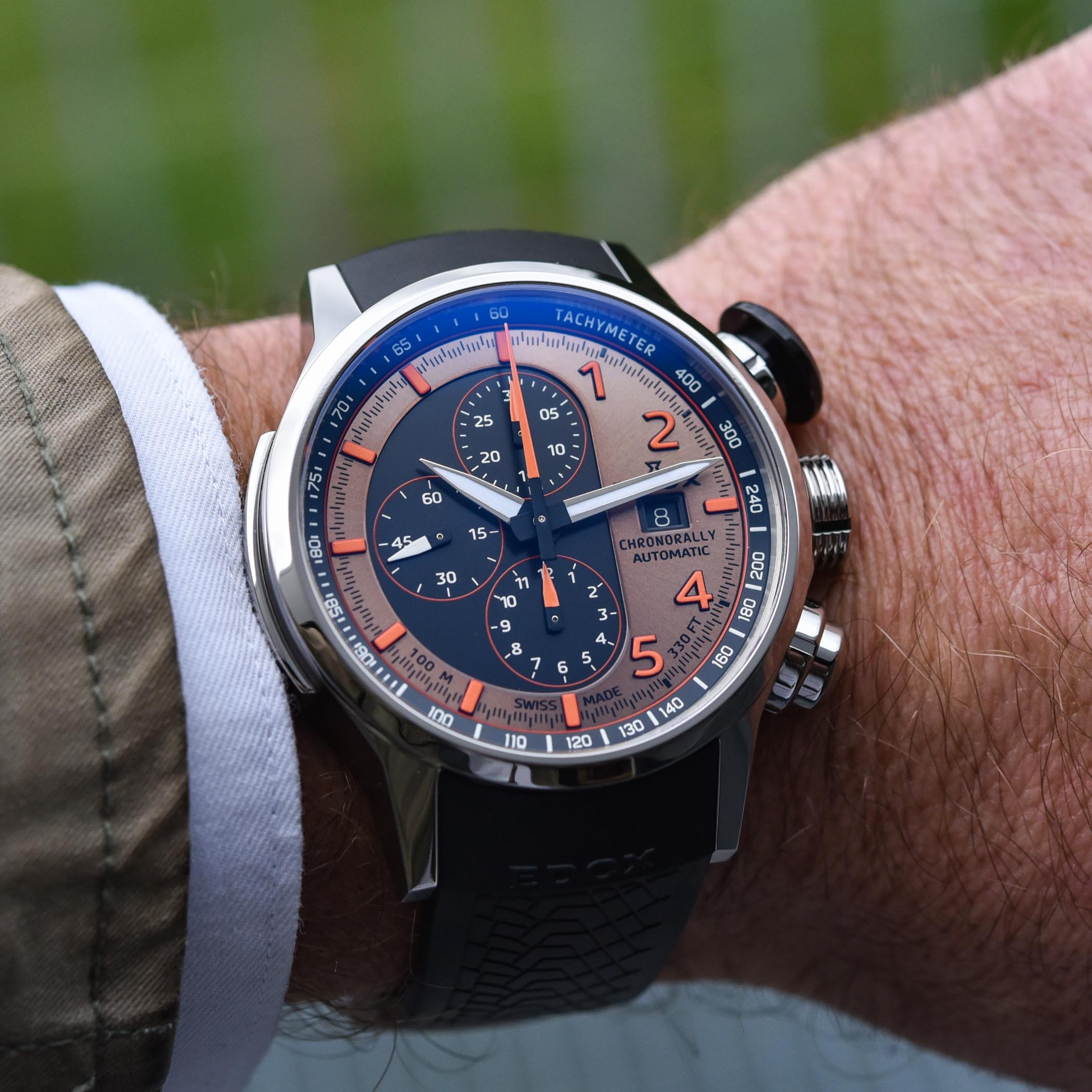 Speaking of functions – the Chronorally Automatic is, first and foremost, a chronograph with a central stop second, 30-minute and 12-hour counters, and it has a date indication. The robust sapphire crystal and double o-ring technology for the crown and the pushers allow water resistance up to 100 m. The Edox “master lock” pin buckle will ensure the Chronorally Automatic is secured on your wrist, and the oversized pushers are inviting – rarely have I felt so compelled to use the chronograph.