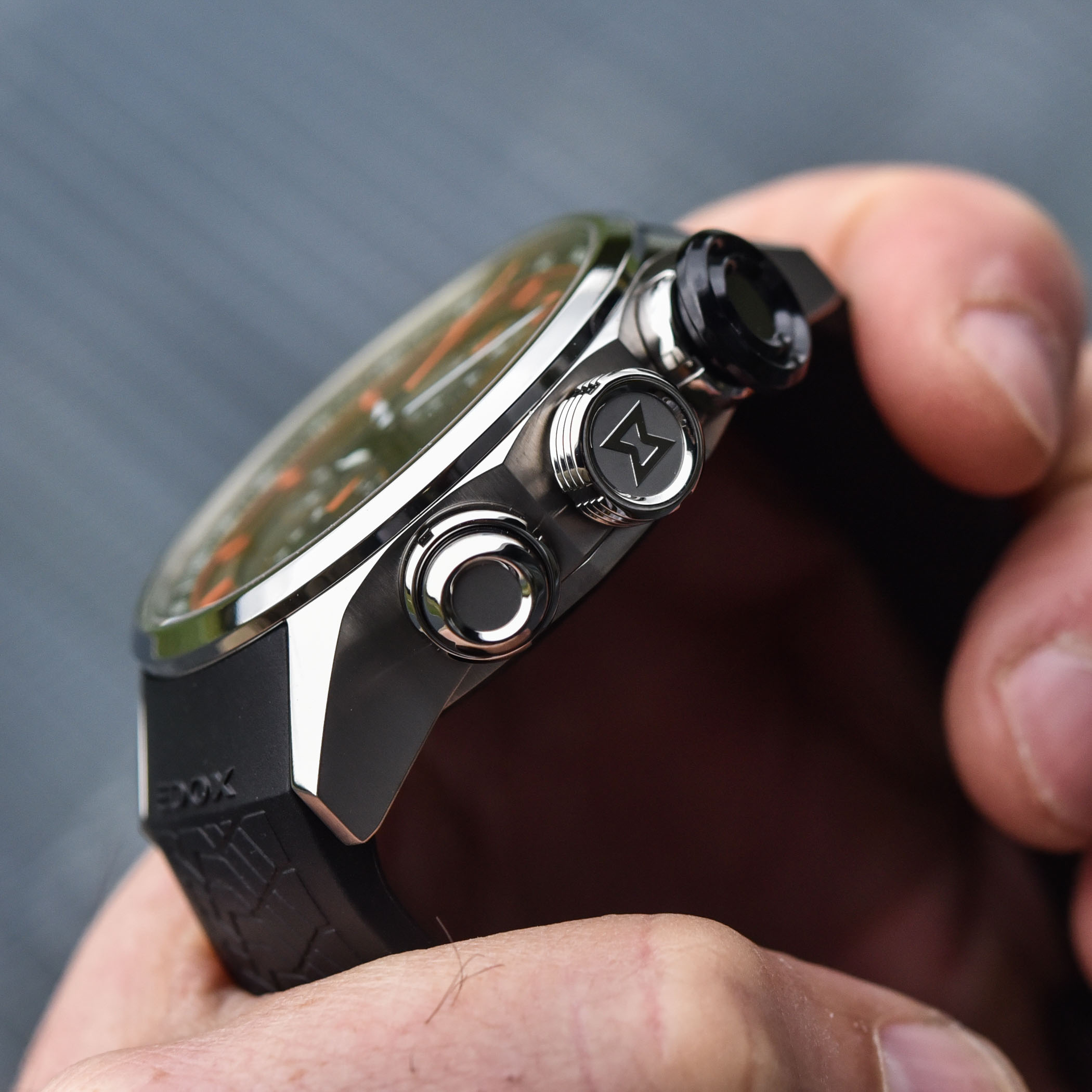 The Edox Calibre 011s – an SW 500-based self-winding automatic chronograph movement – with simple decoration brings the watch to life, and it does the job well. It will run for up to 48 hours on power reserve and keeps good accuracy. As for the décor, I humbly refer you to the decoration of a racing car interior section – not a pretty sight. Everything screams functionality, which is a beauty in this case.