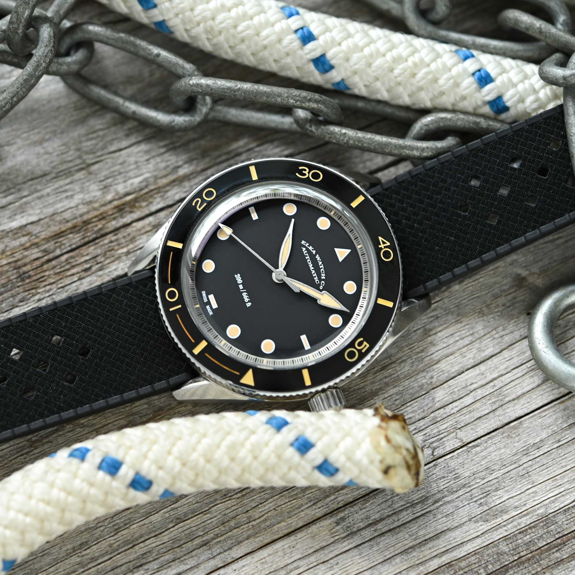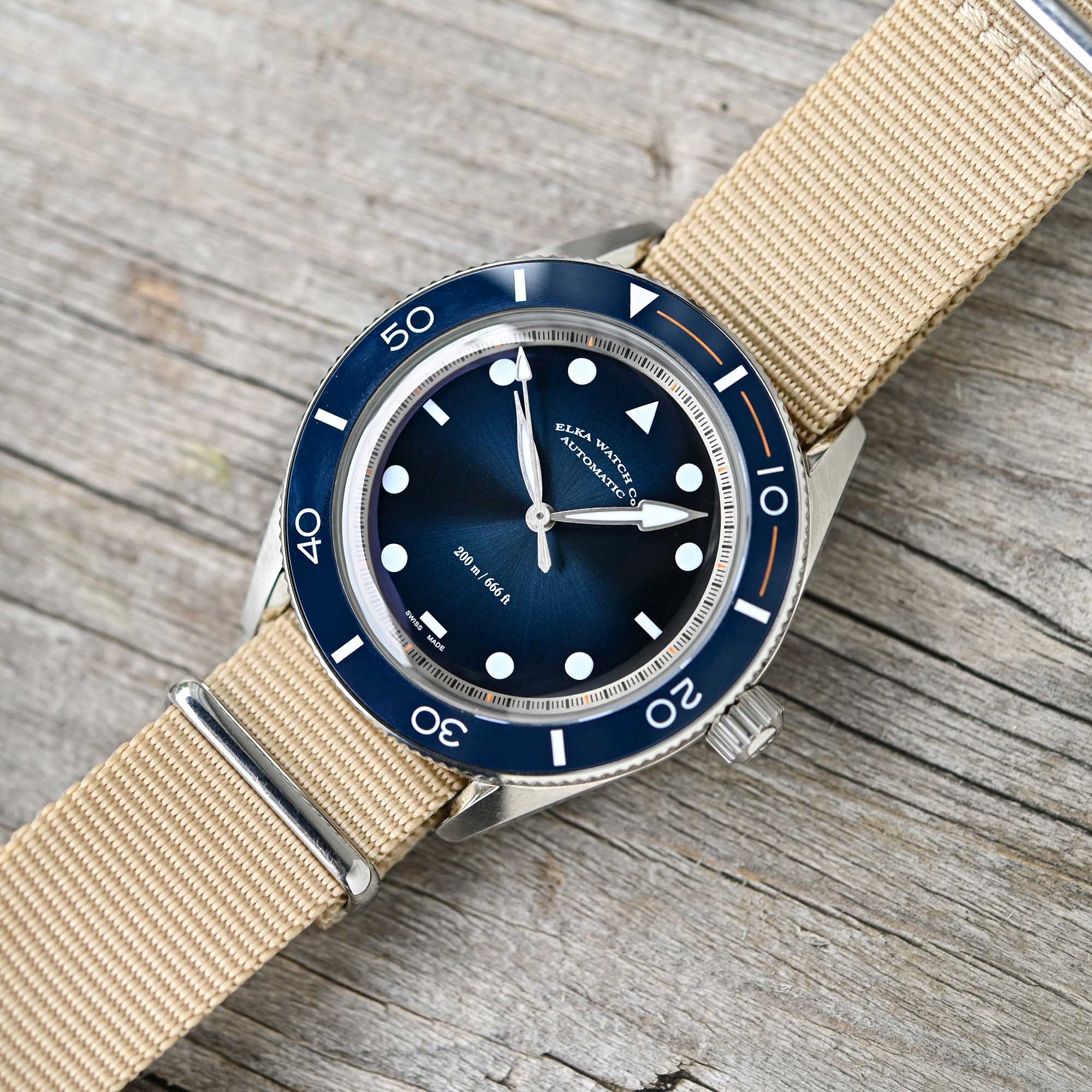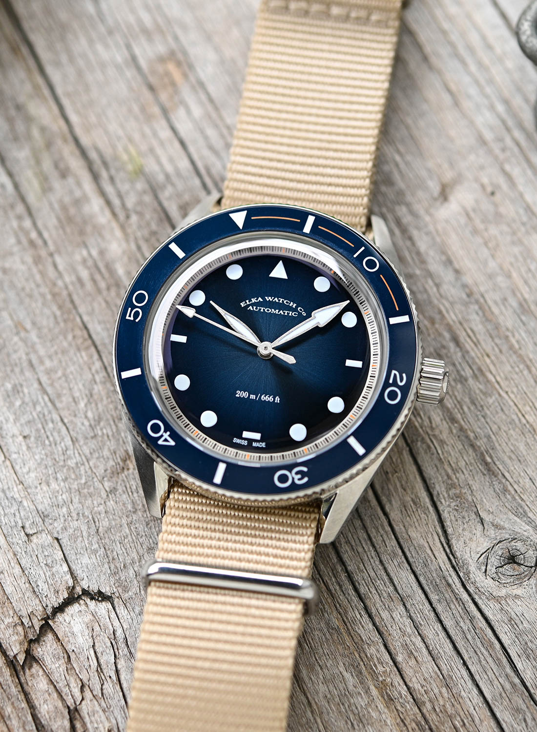 As previously mentioned, the Elka Arinis Dive Watch offers a variety of strap and bracelet options, including the seven-link grain of rice or Milanese mesh stainless steel bracelets, blue or black tropic rubber, beige nylon NATO, or “even a leather strap for the urban diver.” With the choice between two dial colours, date or no date variants, and an array of straps, there are 20 references to consider.