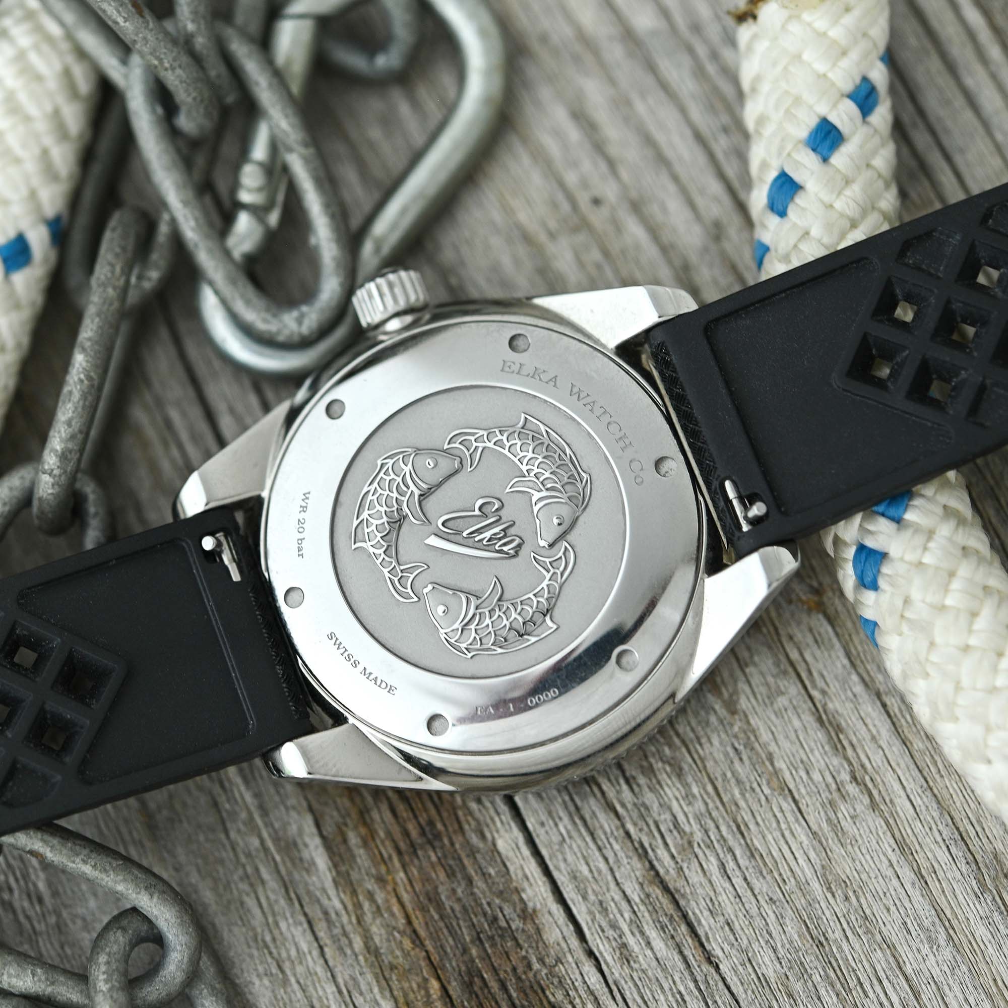 Graduated in 5-minute intervals, the bezel ring combines double-digit numerals and stick indices, accentuated by a triangle at the top position. The initial 15 minutes are highlighted with a subtle orange line, adding a lovely designer’s touch. Contributing to its functionality, the fluted screw-down crown and screwed caseback, adorned with an engraved Elka logo and three-fishes pattern, ensure water resistance of up to 200m. With a lug-to-lug measurement of 46.5mm, it strikes a harmonious balance on the wrist, and with its short lugs and versatile strap options, the Arinis delivers comfort and style, providing a secure fit for any occasion.